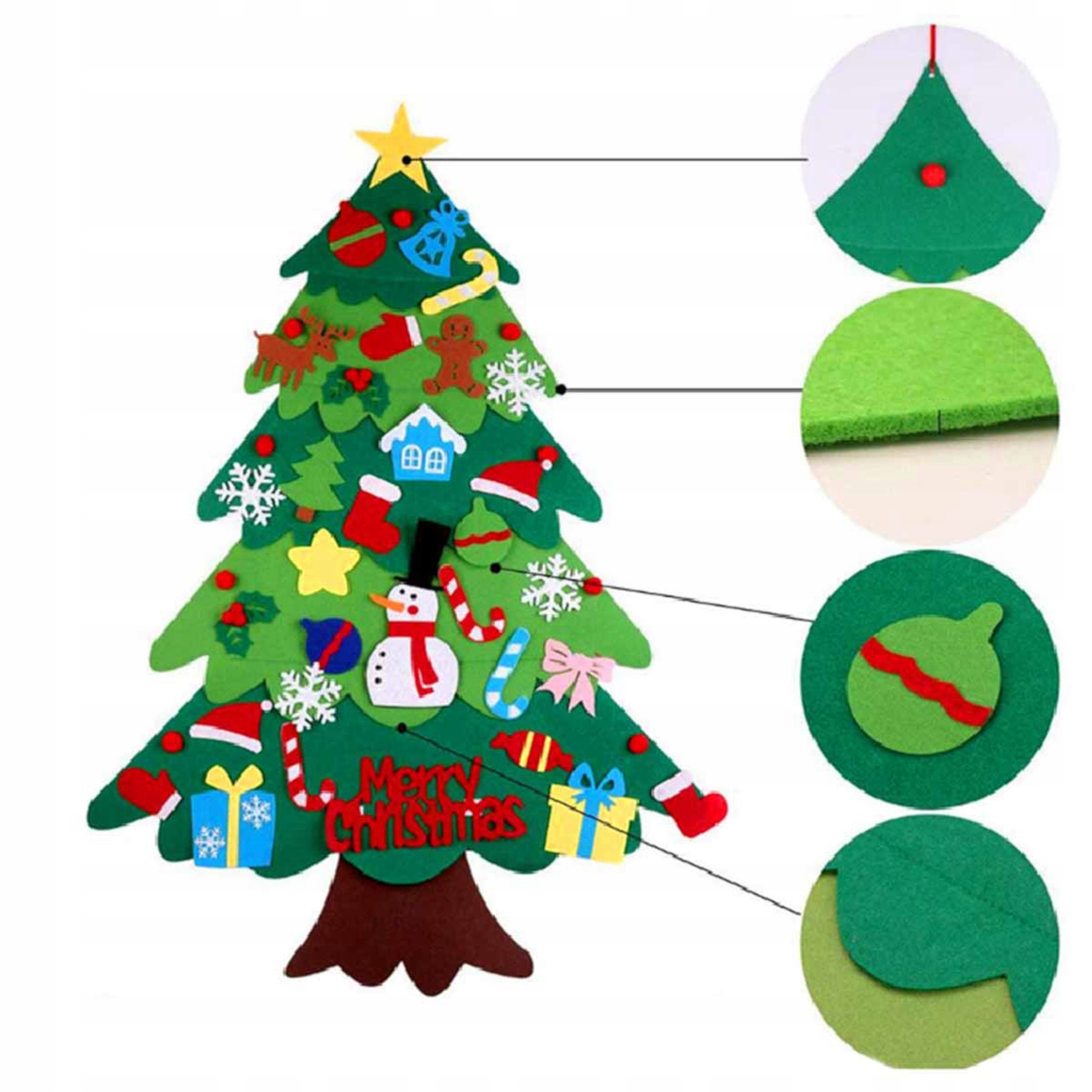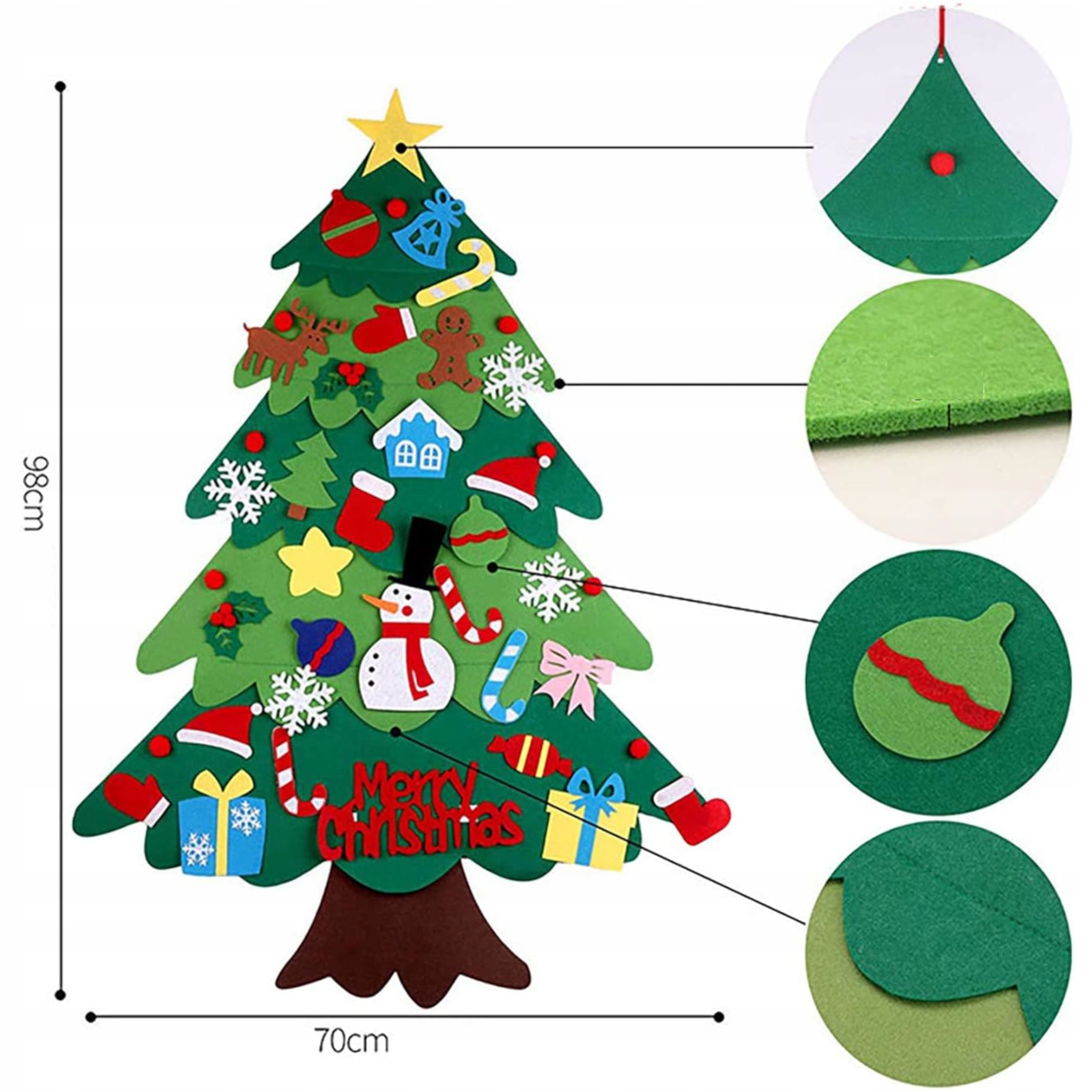 Powierzchnia maty to miękki filc, który jest bezpieczny i przyjazny dla dzieci. Mata ma wymiary 95 x 70cm co sprawia, że jest idealnym rozmiarem, aby dzieci mogły z łatwością dekorować choinkę wedle własnego uznania.