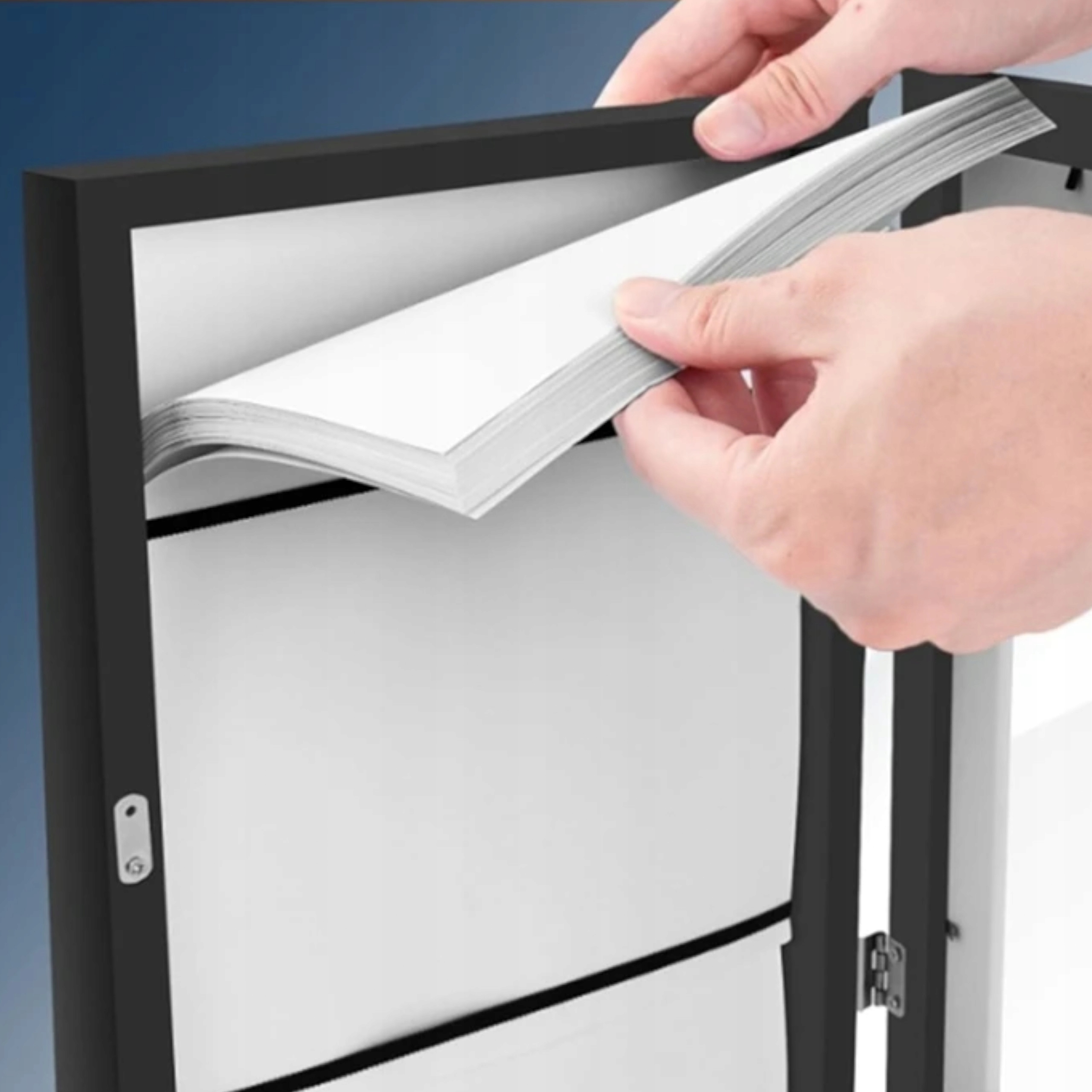 - Najpierw umieść szybę plexi, a potem naciśnij metalowe zaczepy w dół, aby zamknąć szybkę w ramie.