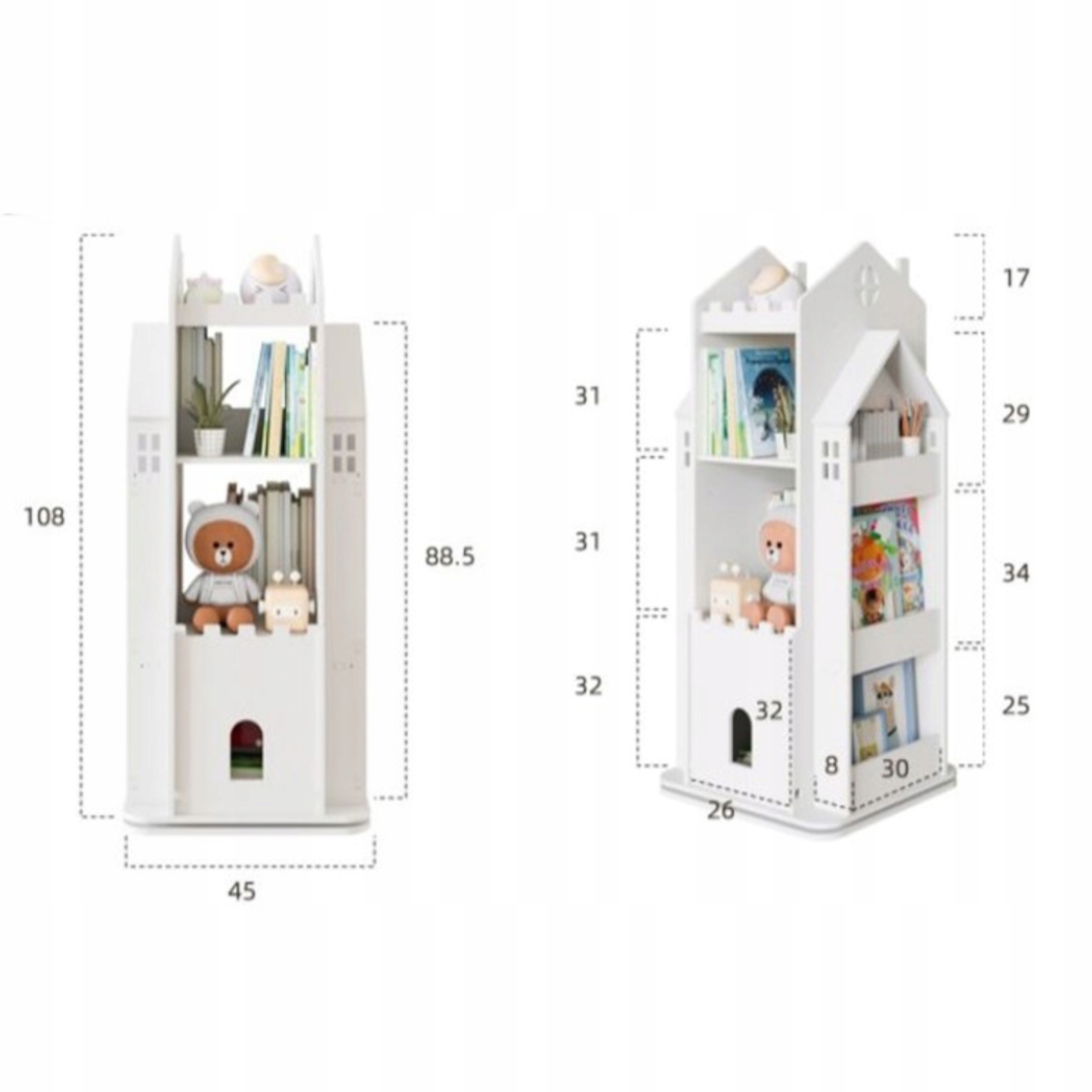 - przyjazny wygląd: Regał jest dostępny w uniwersalnym białym korze i pięknym wzorze zamku który przyciągnie uwagę dzieci. Dzięki temu staje się atrakcyjnym elementem dekoracyjnym pokoju.