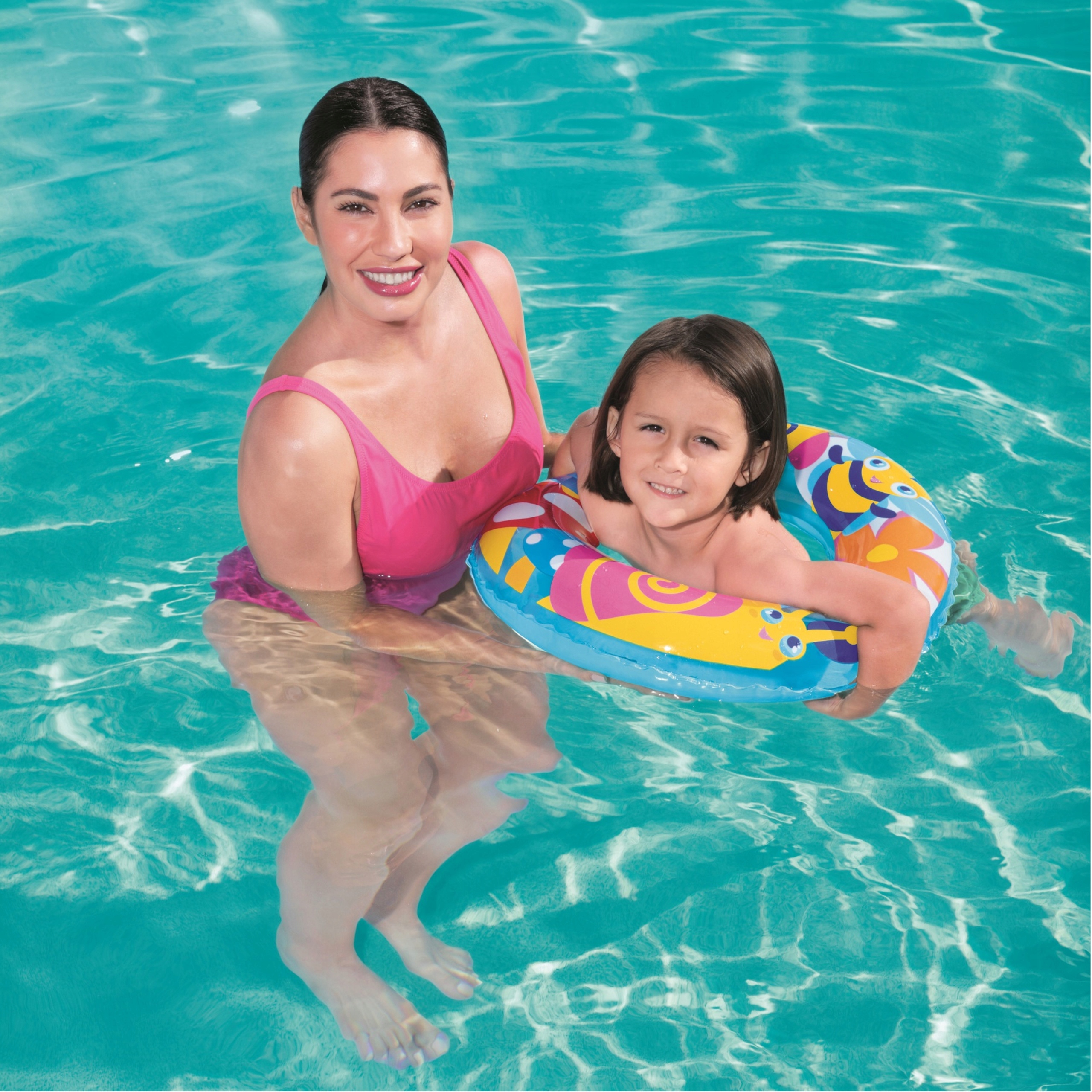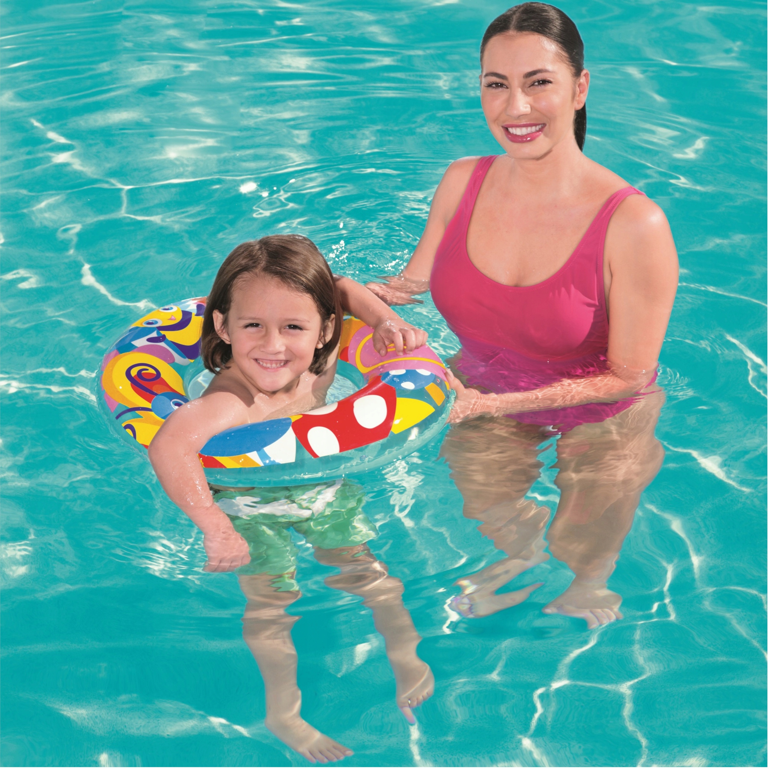 Koło żywą kolorystyką i wesołym wzorem przykuwa uwagę dziecka oraz sprawi świetną zabawę w wodzie na dłuższy czas.