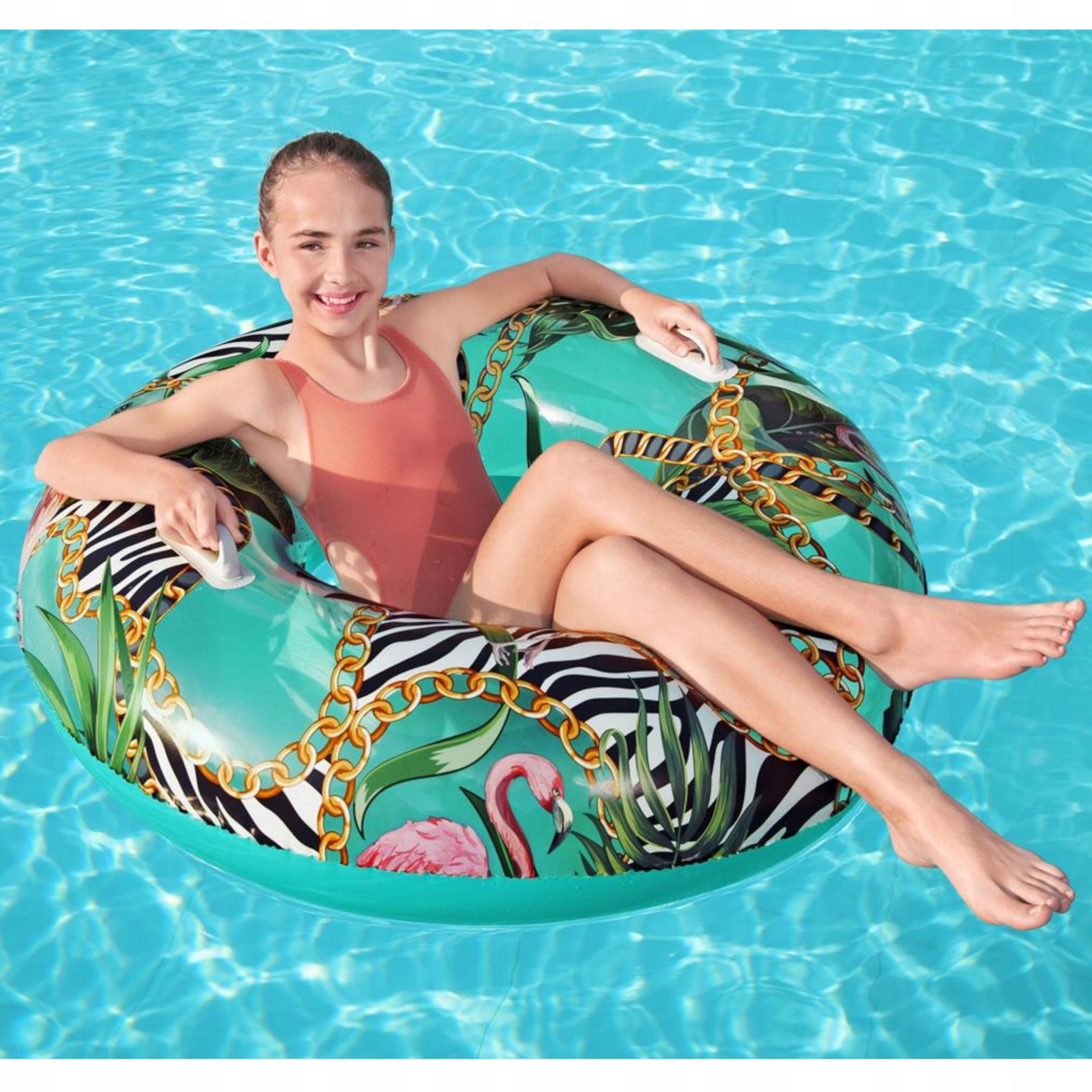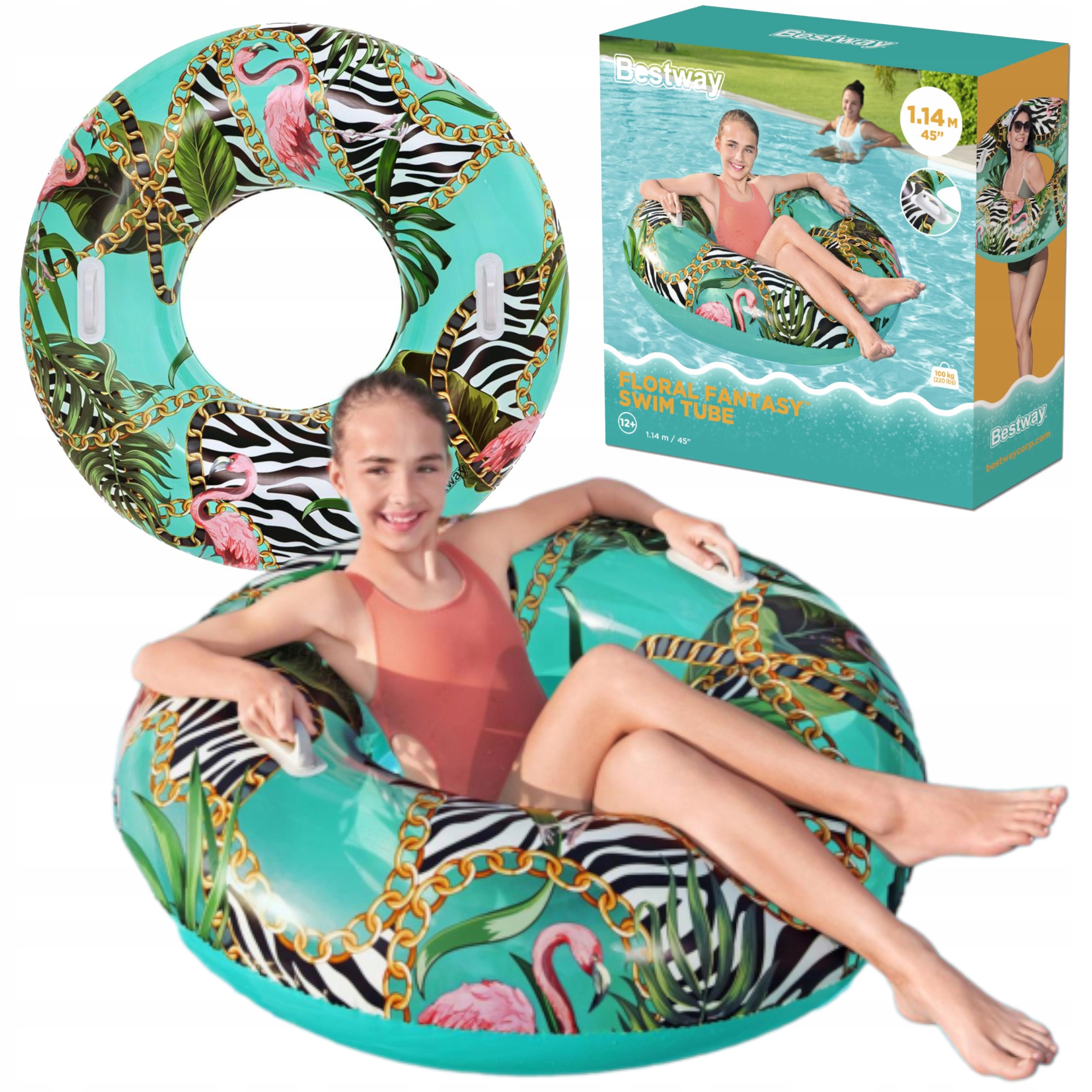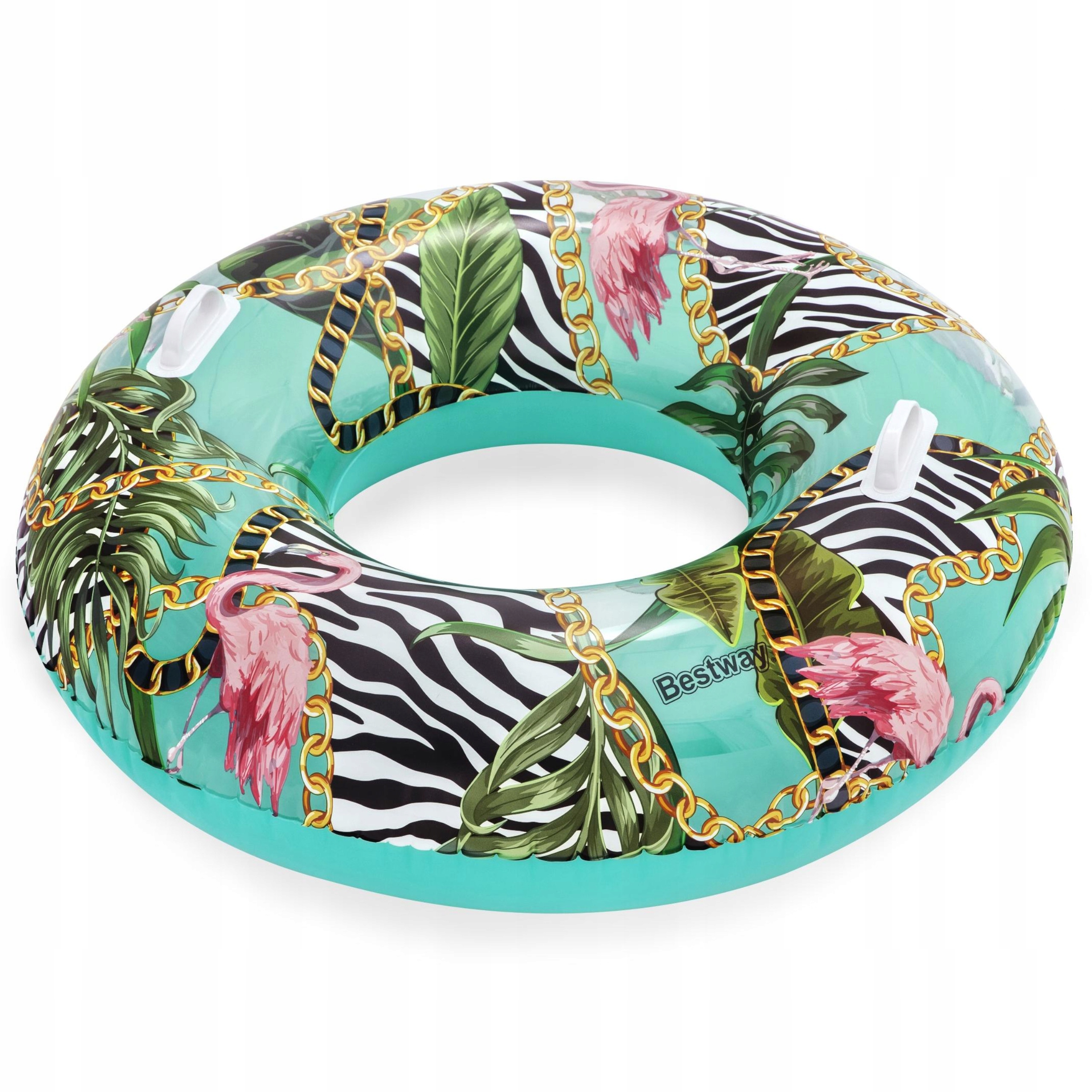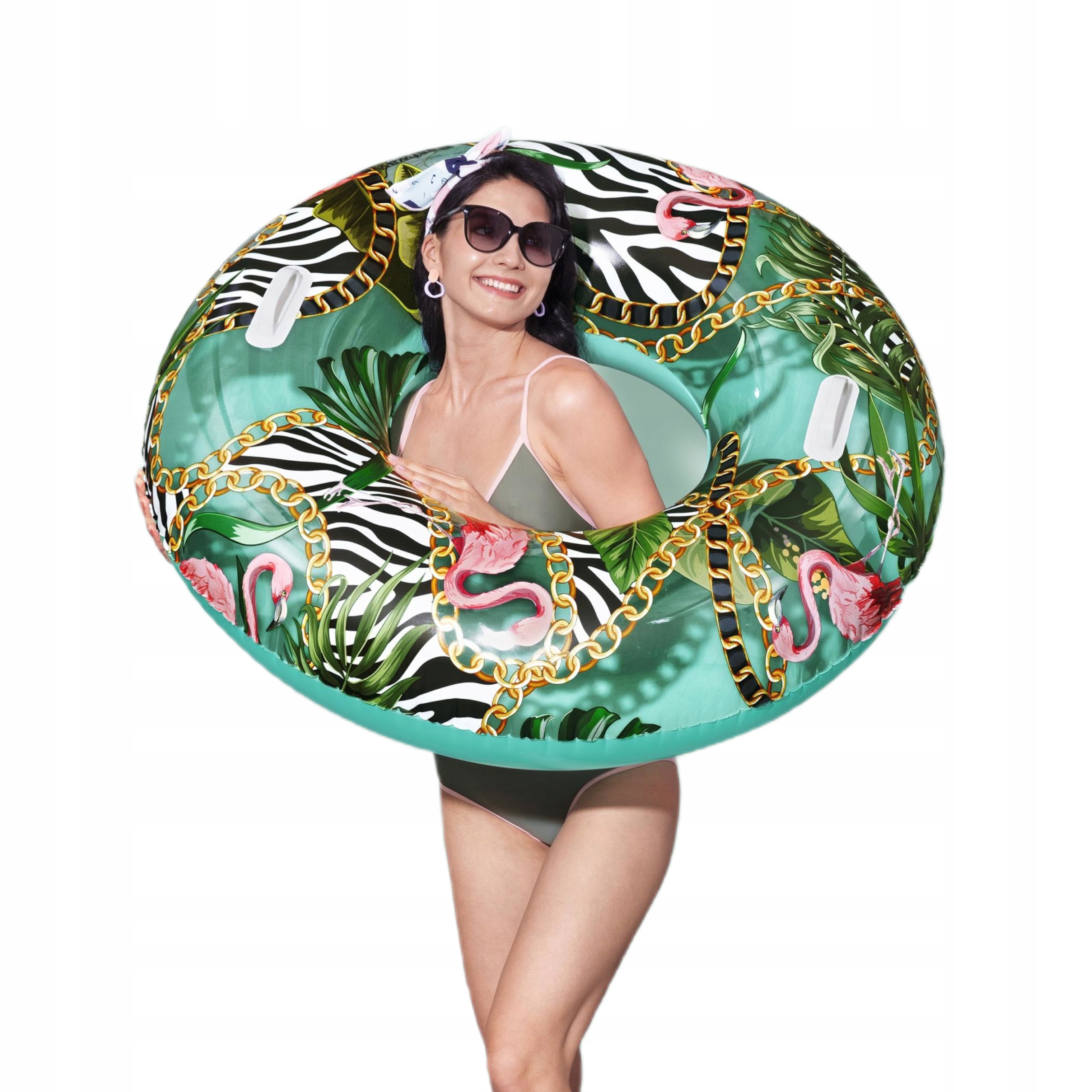 Koło jest idealne zarówno dla dzieci od 12 roku życia jak i dla dorosłych, posiada odpowiedni rozmiar, zapewniający stabilność, a ciekawy wzór w palmy przypadnie do gustu każdemu, kto lubi wyróżniać się w tłumie. Koło posiada zamocowane dwa uchwyty co ułatwia manewrowaniem kółkiem oraz zwiększa wygodę użytkowania.