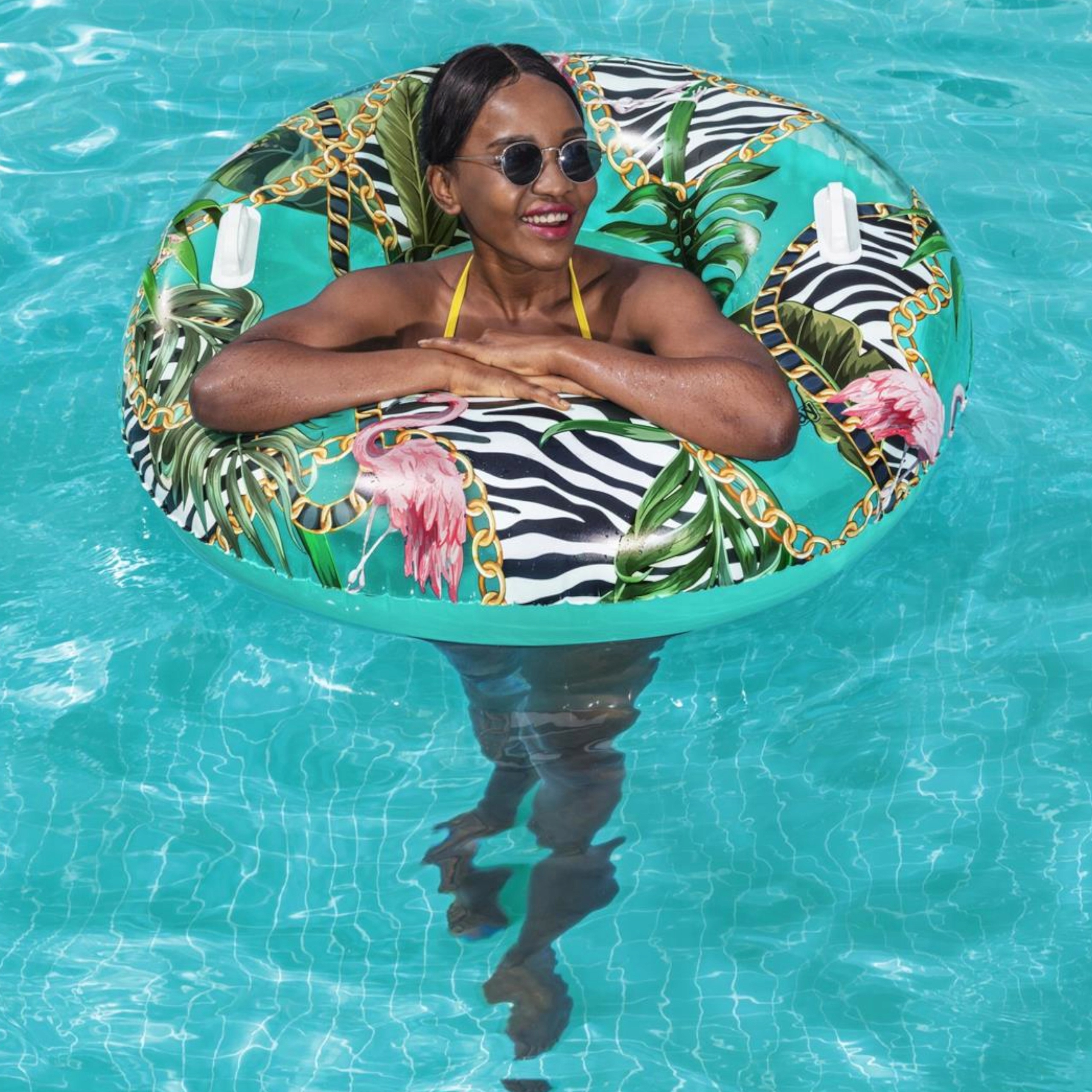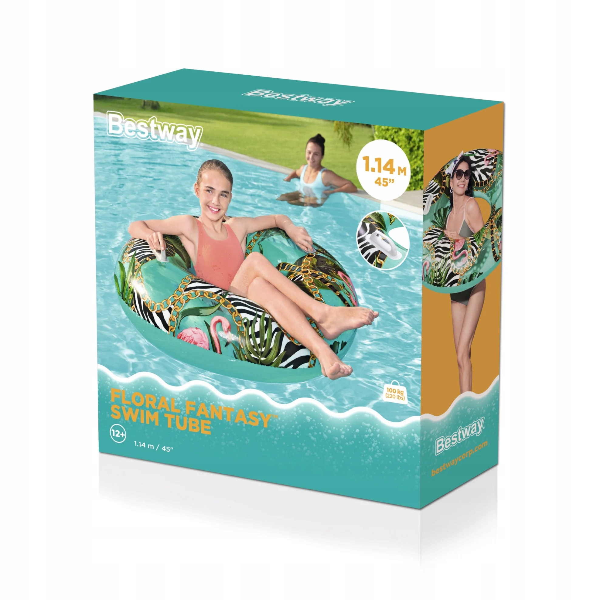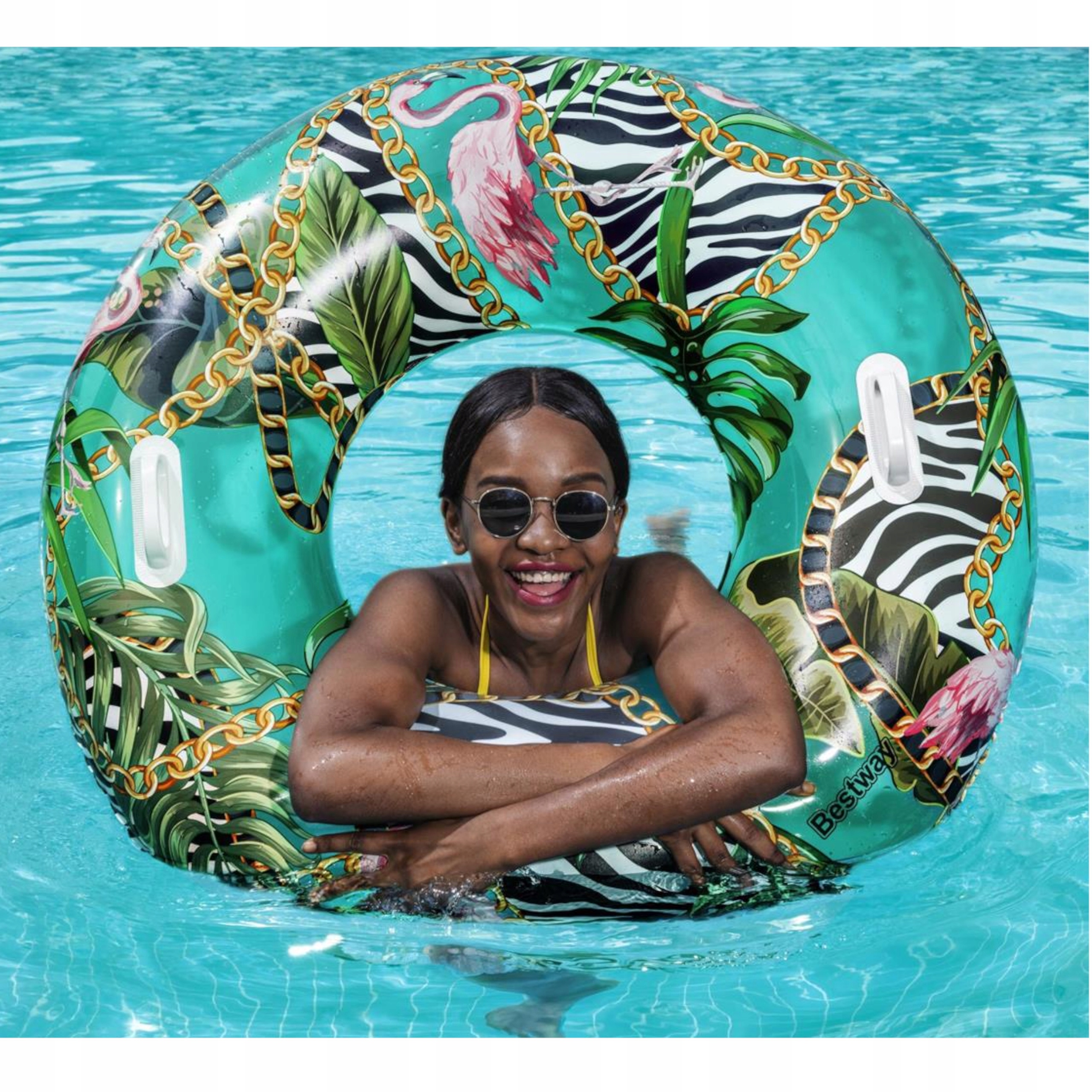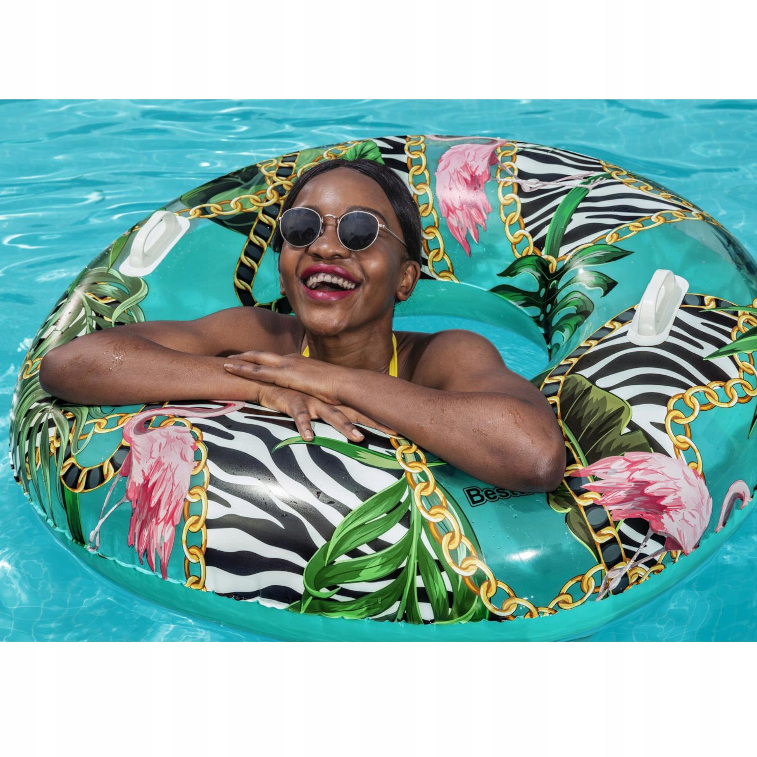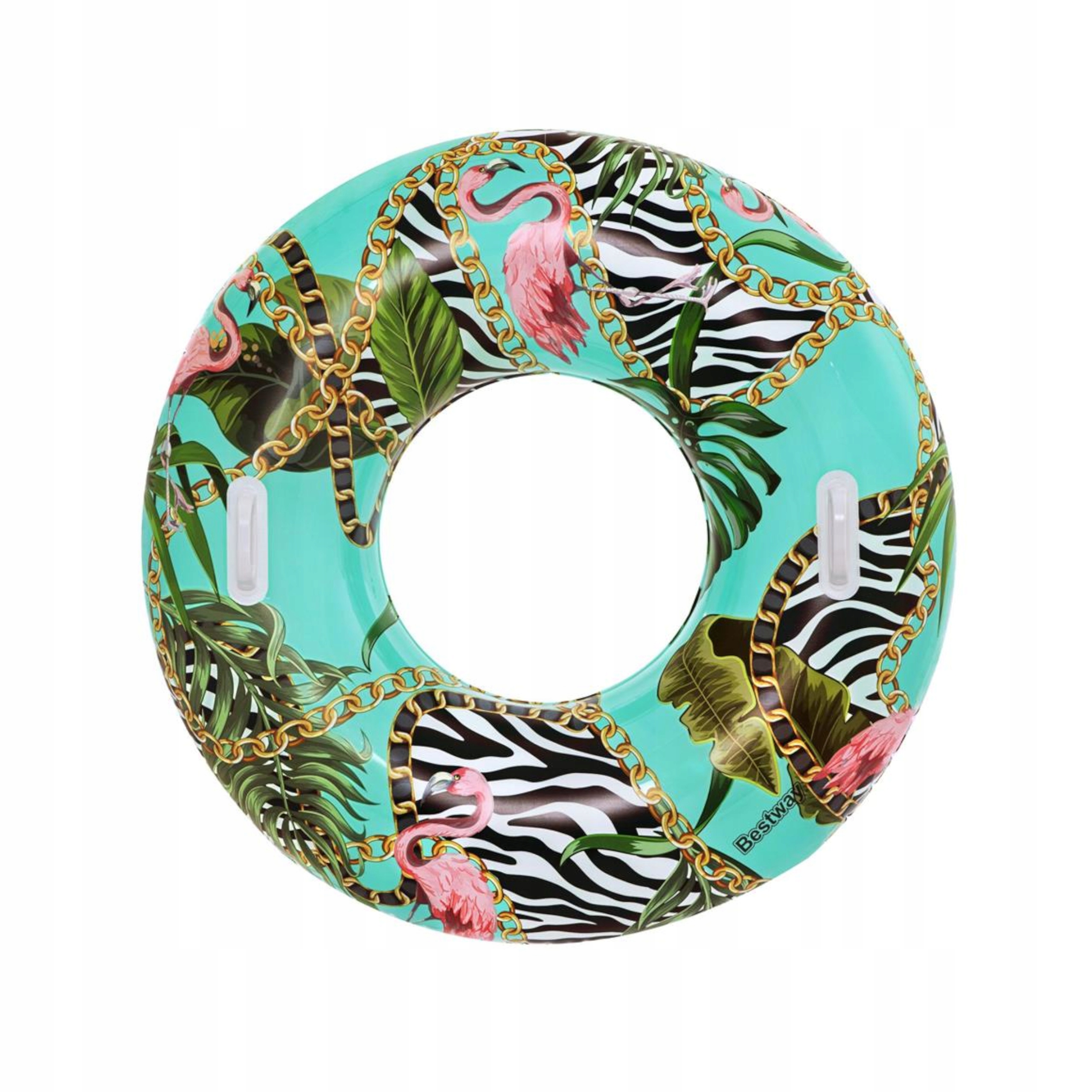 Koło jest idealne zarówno dla dzieci od 12 roku życia jak i dla dorosłych, posiada odpowiedni rozmiar, zapewniający stabilność, a ciekawy wzór w palmy przypadnie do gustu każdemu, kto lubi wyróżniać się w tłumie. Koło posiada zamocowane dwa uchwyty co ułatwia manewrowaniem kółkiem oraz zwiększa wygodę użytkowania.