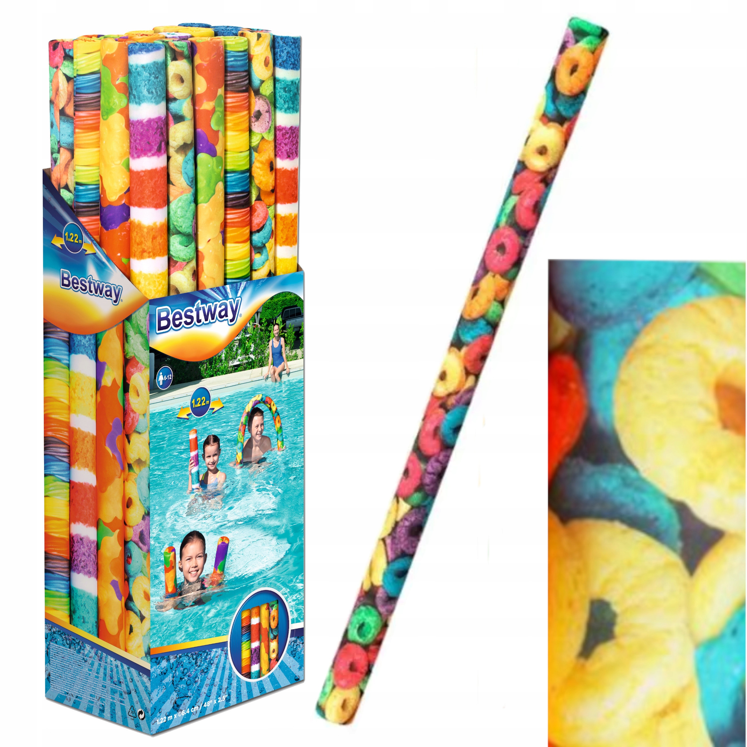 Makaron basenowy z żywą kolorystyką i realistycznym wzorem płatków śniadaniowych przykuwa uwagę dziecka oraz zapewni świetną i bezpieczną zabawę w wodzie na dłuższy czas.