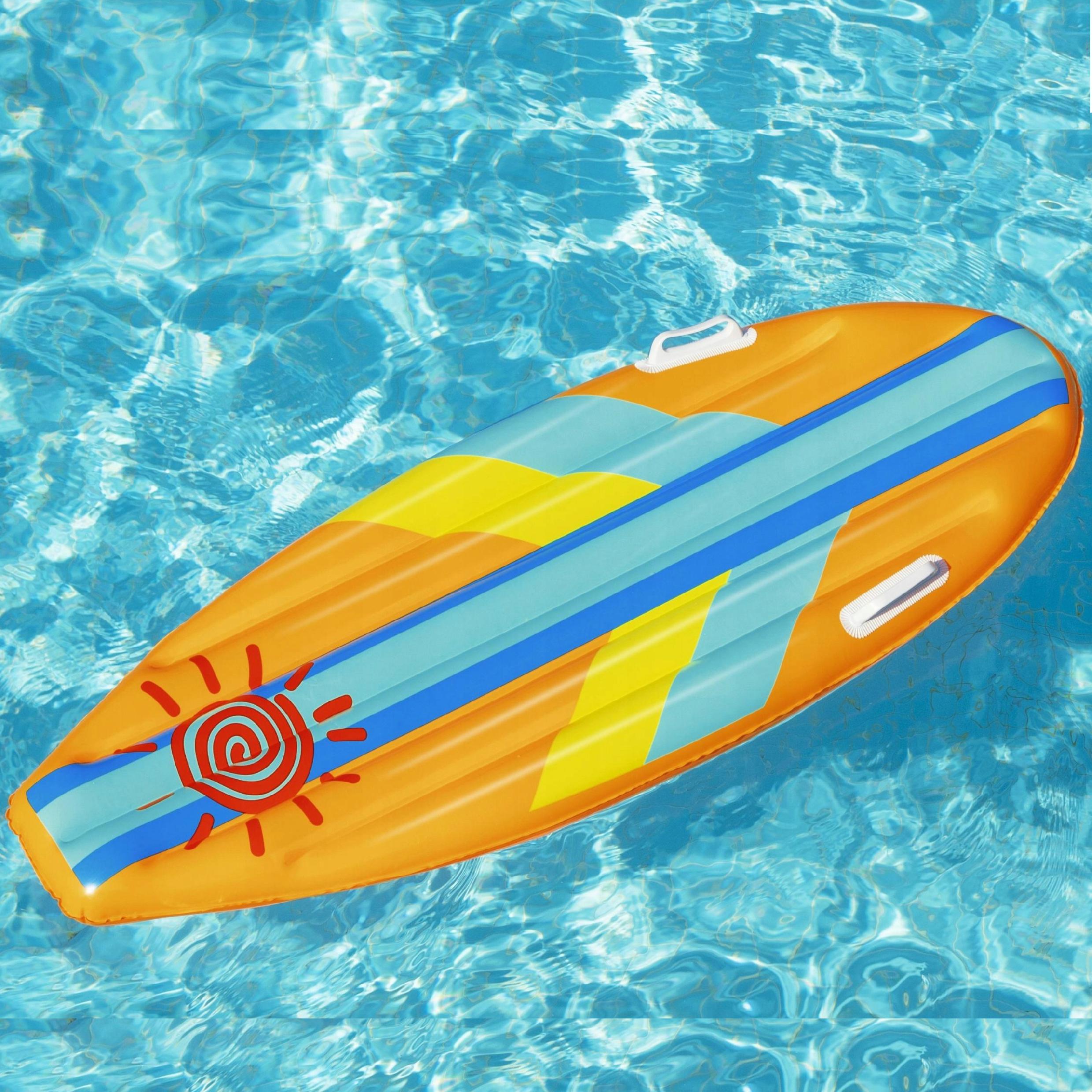 Dmuchany materac w kształcie deski surfingowej to idealne rozwiązanie dla dzieci na letni odpoczynek nad wodą. Dmuchany materac wykonany jest z wytrzymałego materiału PCV, zapewniając bezpieczeństwo i wygodę podczas zabawy w wodzie. Materac może posłużyć do pływania na wodzie, ale także do opalania się na plaży czy w domowym ogrodzie. Deska ma dwa wygodne uchwyty, dzięki którym dziecko może się wygodnie trzymać. Żywa kolorystka i ciekawy kształt deski zachęcą nasze pociechy do zabawy w wodzie i nauki pływania.