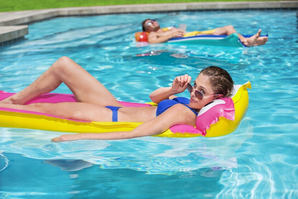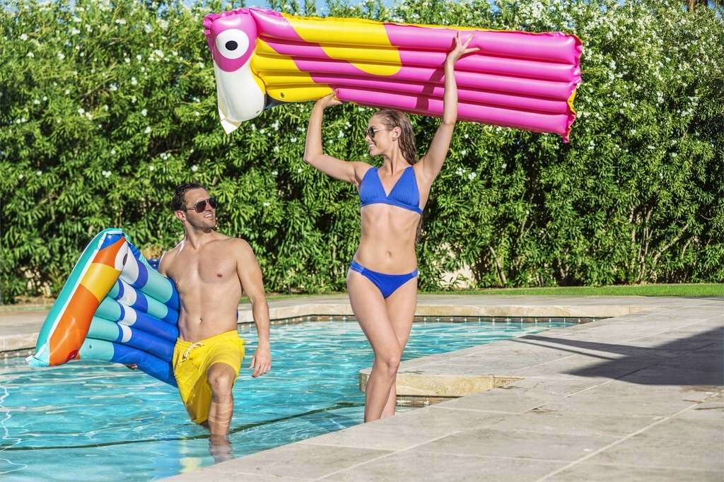 Materac do pływania firmy Bestway w żywych tropikalnych kolorach to idealne rozwiązanie na letni wypoczynek nad morzem, jeziorem w basenie czy we własnym ogrodzie. Dmuchany materac wykonany jest z wytrzymałego materiału PCV, który posłuży przez kilka lat. Charakterystyczną cechą nadmuchiwanego materaca jest zagłówek , zapewniający dodatkowy komfort i wygodnie oparcie dla głowy. Materac do pływania to wspaniała propozycja dla osób ceniących wygodę i relaks na świeżym powietrzu.