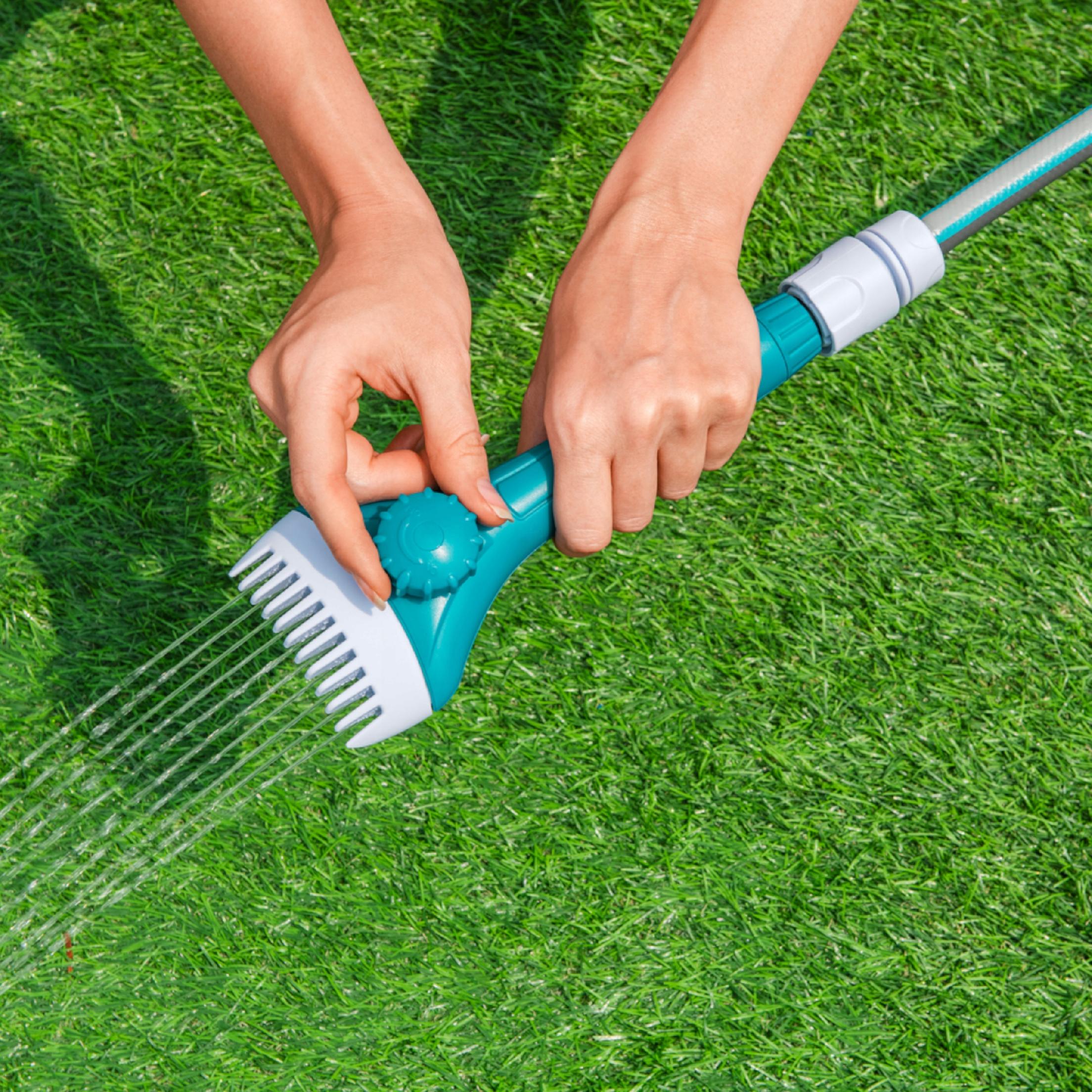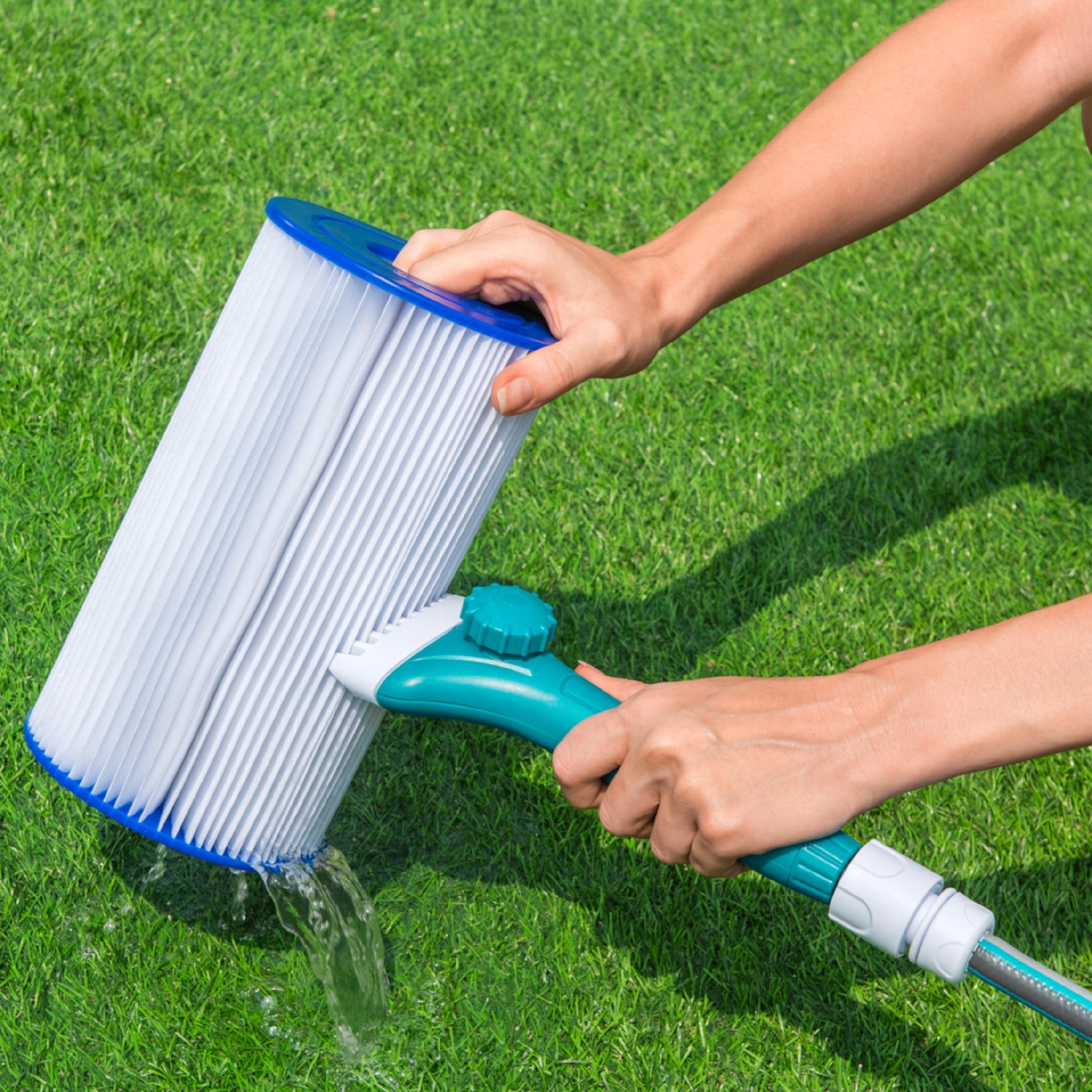 - A regulowany strumień wody usunie więcej zanieczyszczeń z filtra w krótszym czasie niż sam wąż ogrodowy.