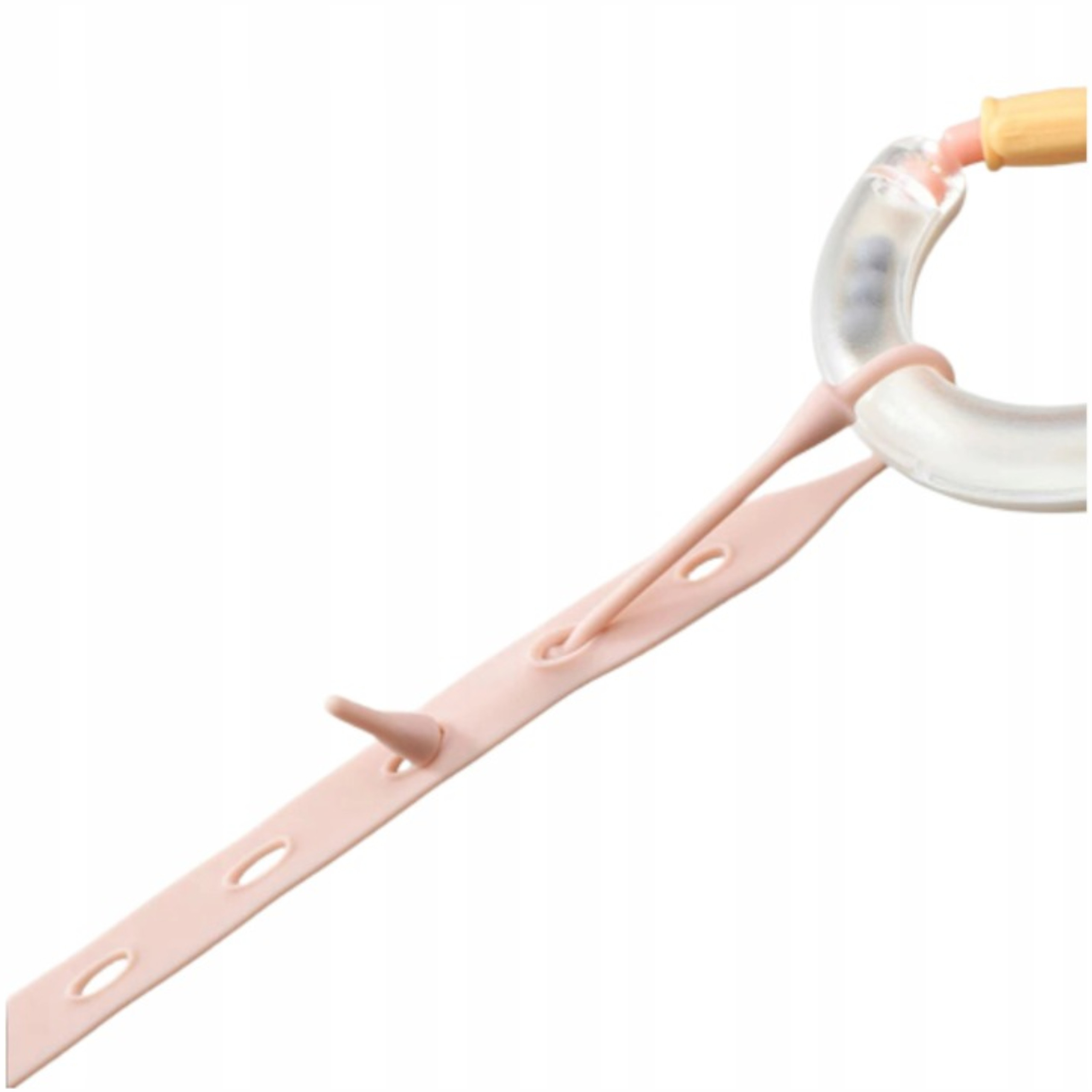 Wykonany z bezpiecznego dla zdrowia spożywczego silikonu, dzięki niemu zabezpieczymy bidon, kubek, butelkę, smoczek lub zabawkę przed wypadnięciem czy zgubieniem. Duża ilość oczek umożliwia dowolną regulację.