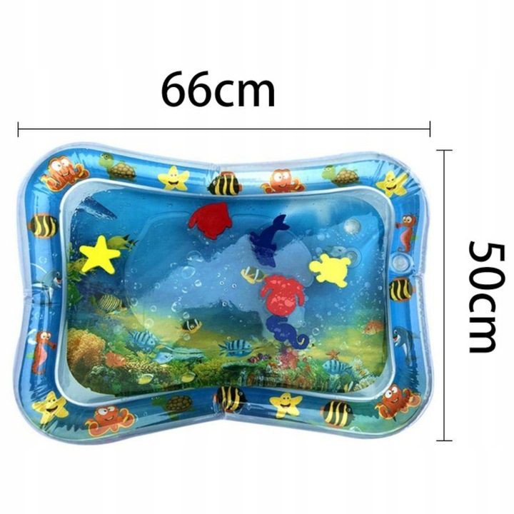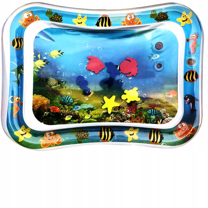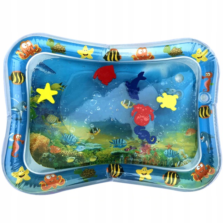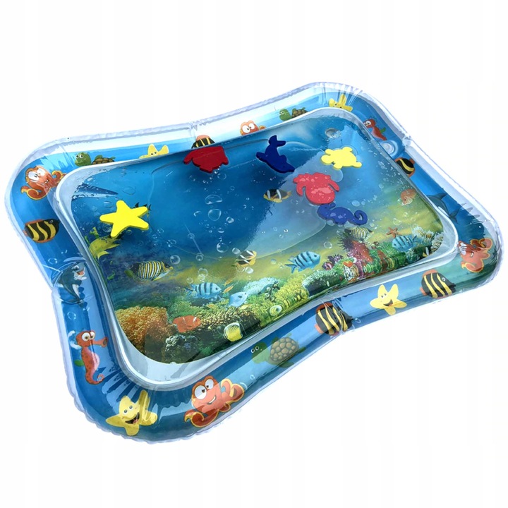 Dodatkowo dmuchana mata wodna rozwija wyobraźnię dziecka Wewnątrz maty znajdują się kolorowe zwierzątka morskie. Dziecko chodząc po macie wprawia zwierzątka w ruch, które przesuwają się w wodzie i tym sposobem zachęcając dziecko do aktywności.