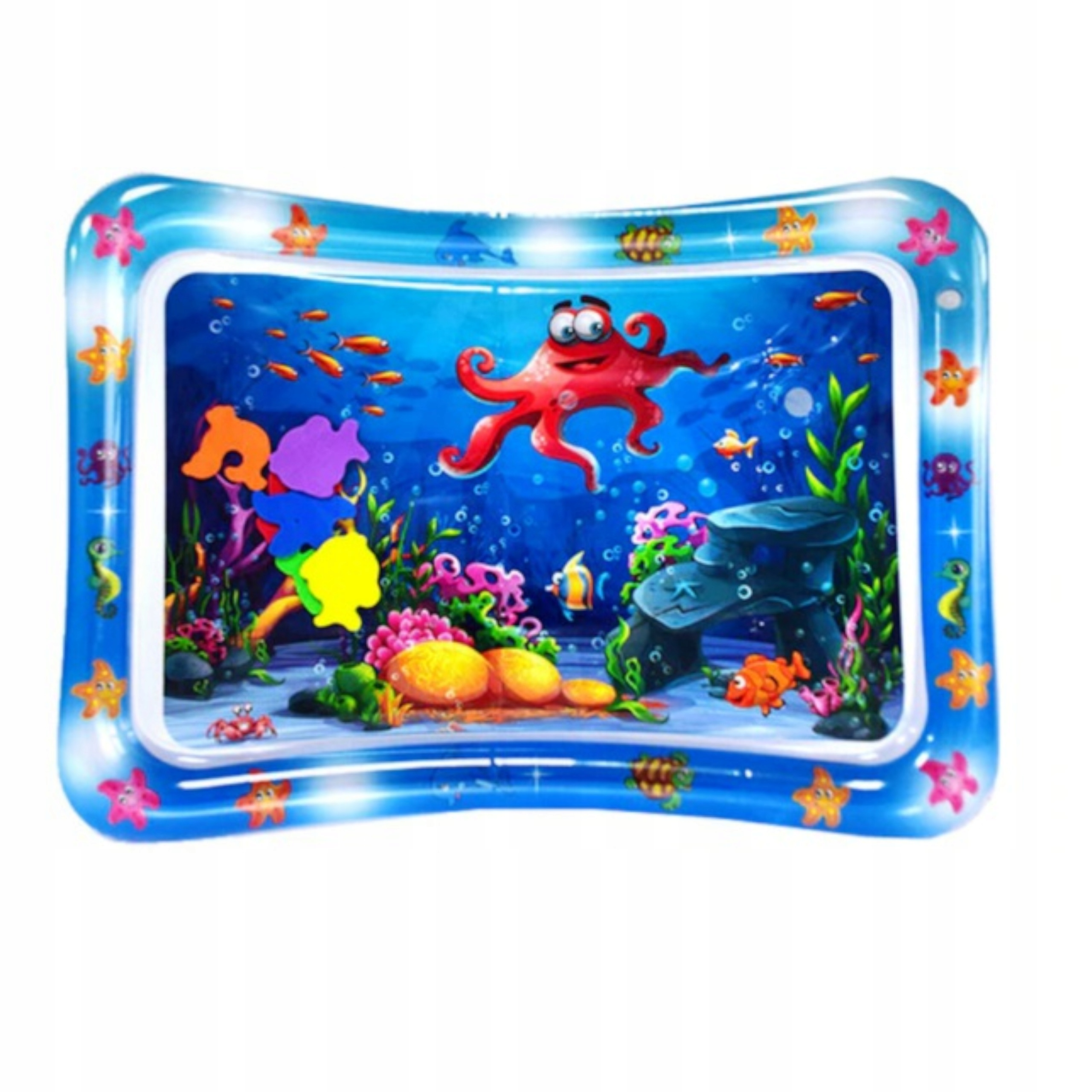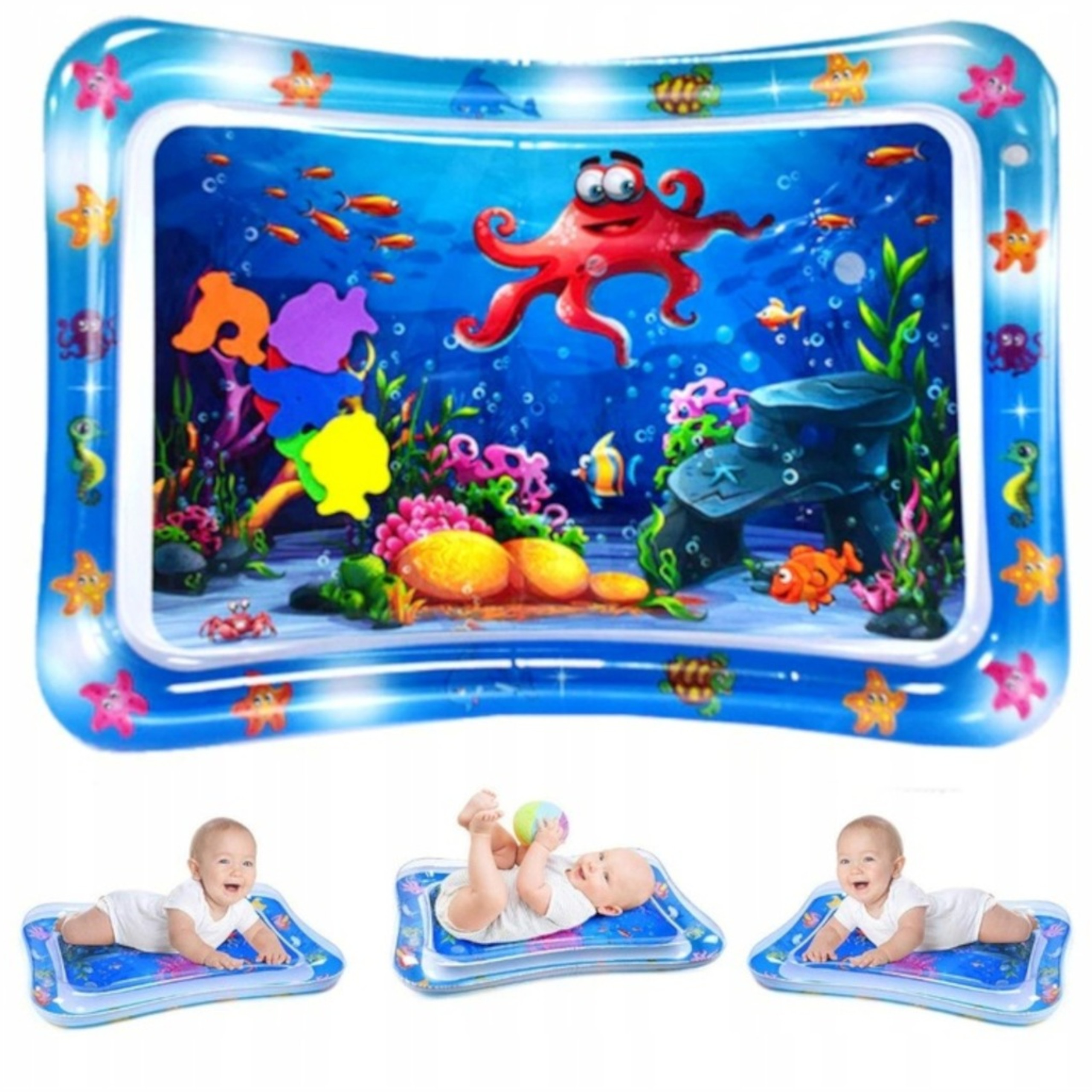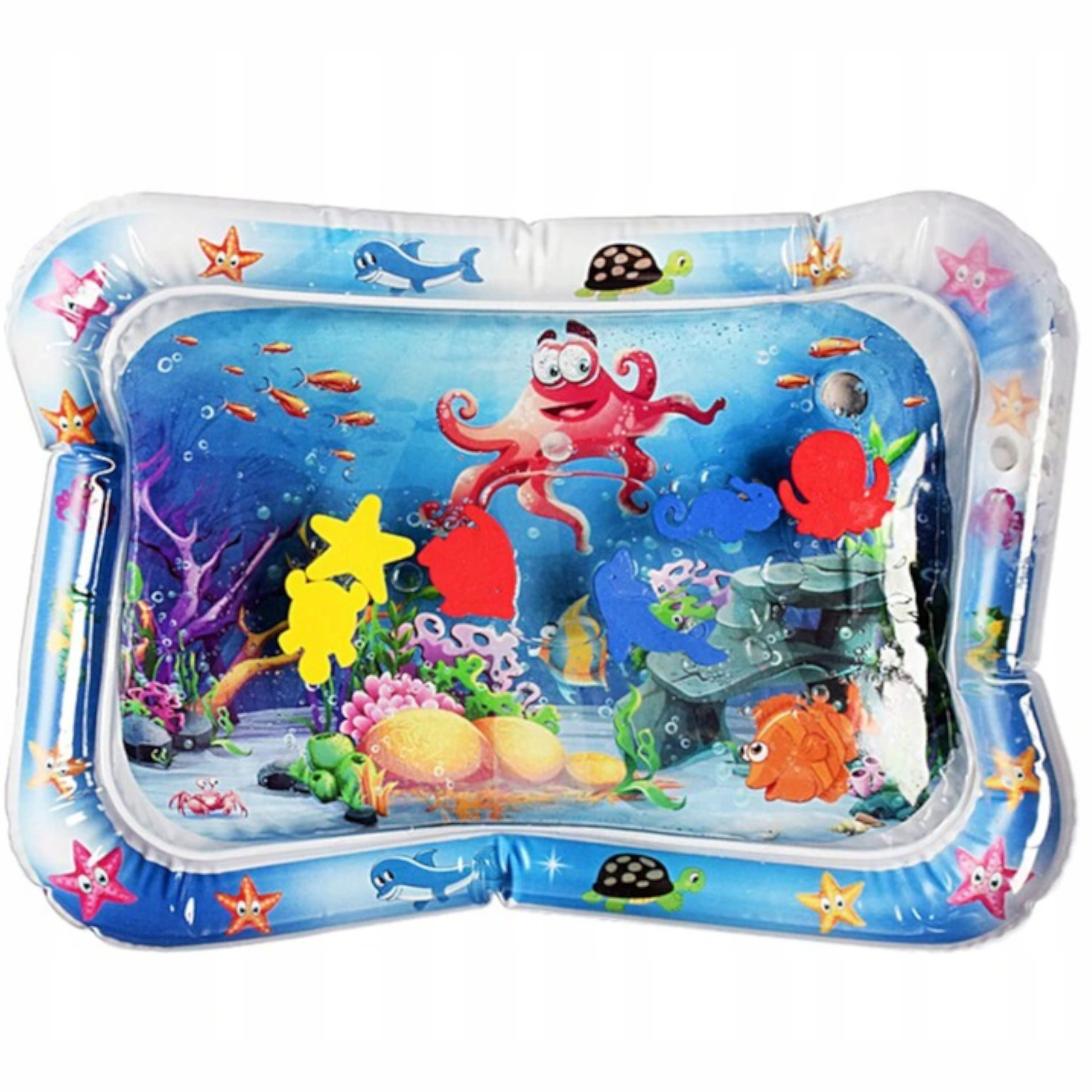 ✅ Wewnątrz maty znajdują się kolorowe zwierzątka morskie w żywych kolorach, które przyciągną uwagę dziecka.