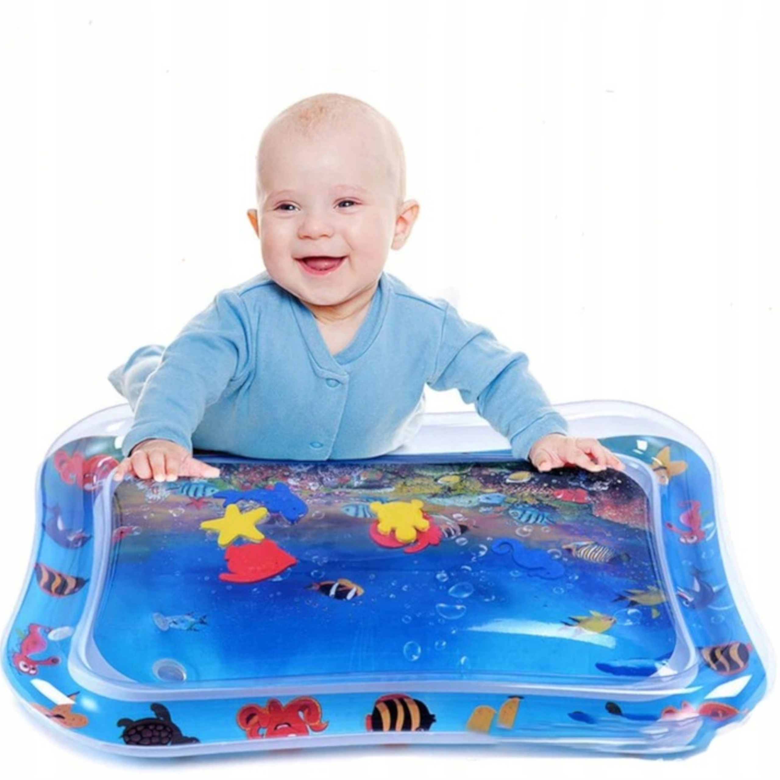 Dodatkowo dmuchana mata wodna rozwija wyobraźnię dziecka Wewnątrz maty znajdują się kolorowe zwierzątka morskie. Dziecko chodząc po macie wprawia zwierzątka w ruch, które przesuwają się w wodzie i tym sposobem zachęcając dziecko do aktywności.