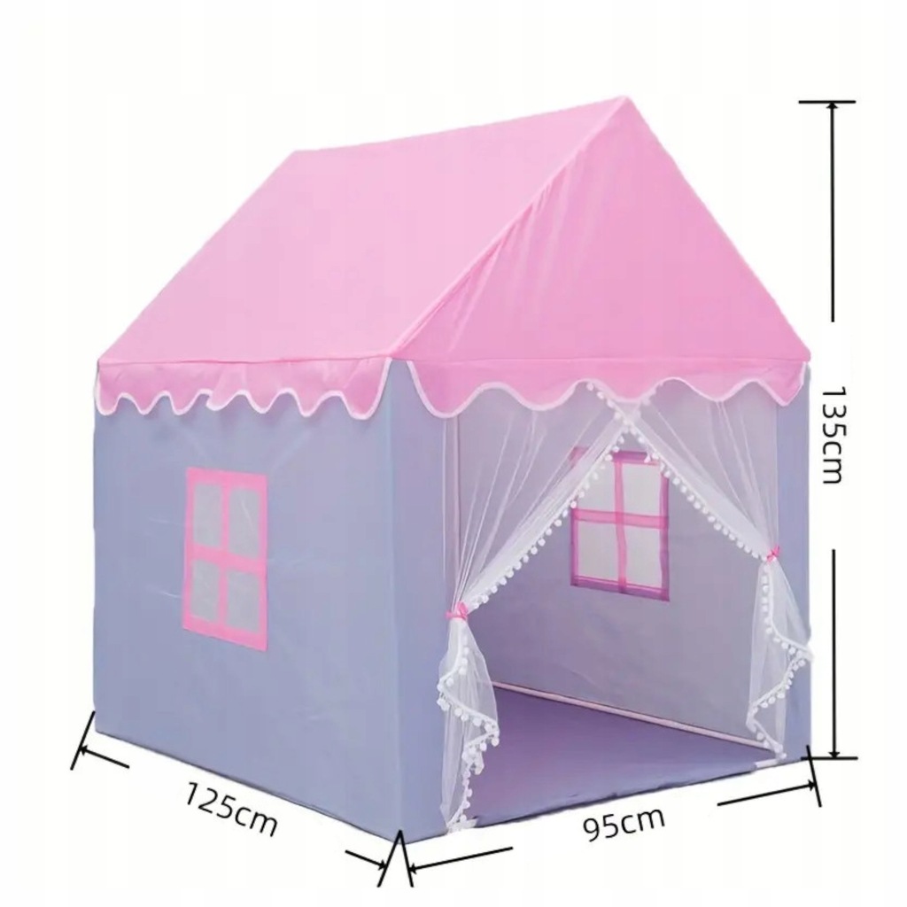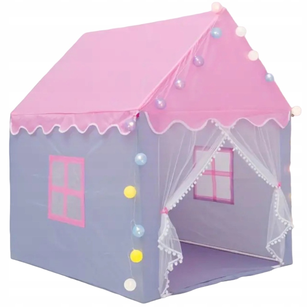 Namiot posiada wejście z delikatnymi zasłonami które można zamocować po bokach wejścia, przez co jest bardzo wygodny w użytkowaniu, ponadto posiada podłogę dzięki której Twoje dziecko nie pobrudzi się podczas zabawy i będzie mogło rozłożyć na niej swój ulubiony koc, poduszki czy pluszaki. Namiot posiada dwa siatkowe okienka, które zapewnią dodatkową wentylację w środku namiotu. Dodatkowo w zestawie znajdują się kolorowe lampki kuleczki oraz łańcuch z lampkami w kształcie gwiazdek, które dodatkowo pomogą w stworzeniu wieczorem przytulnego klimatu.