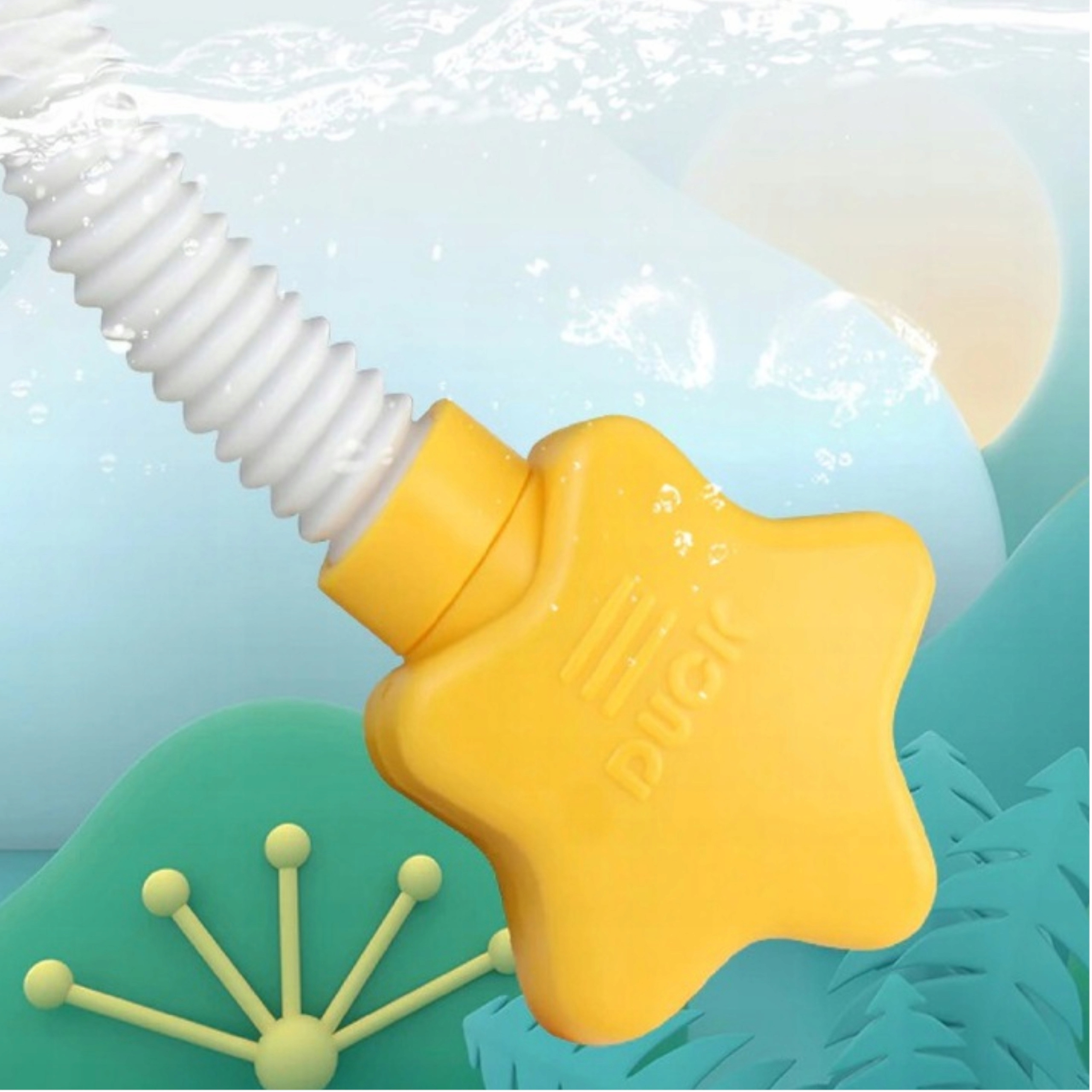 Po zanurzeniu gwiazdki znajdującej się na końcu rury w wodzie, zabawka pompuje wodę.