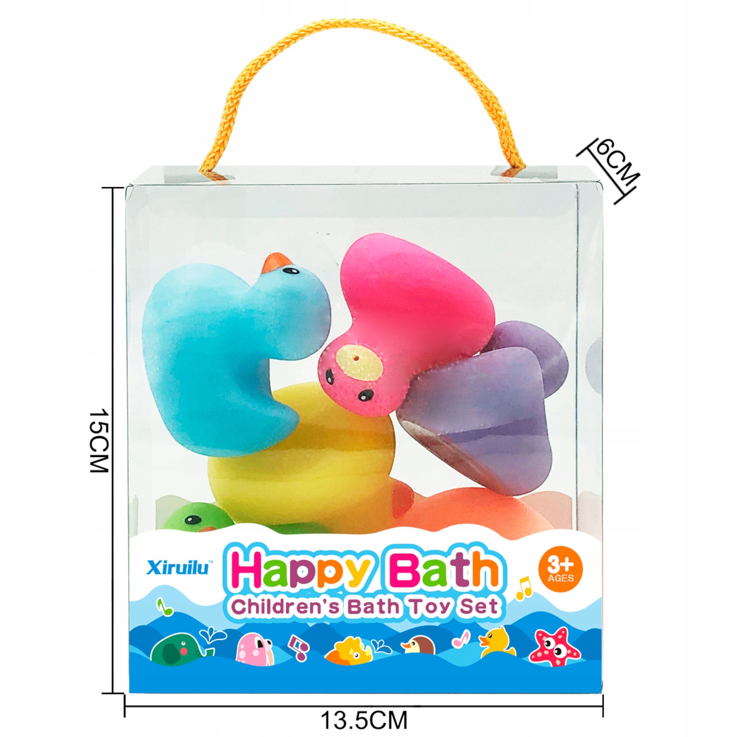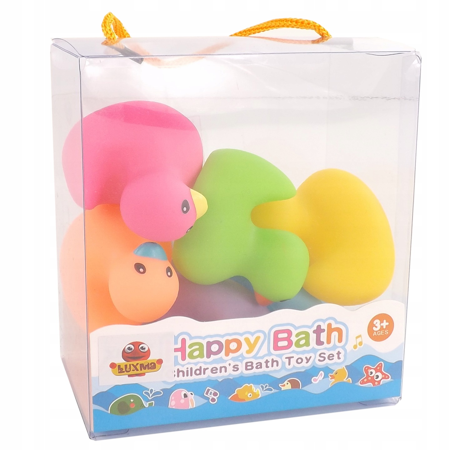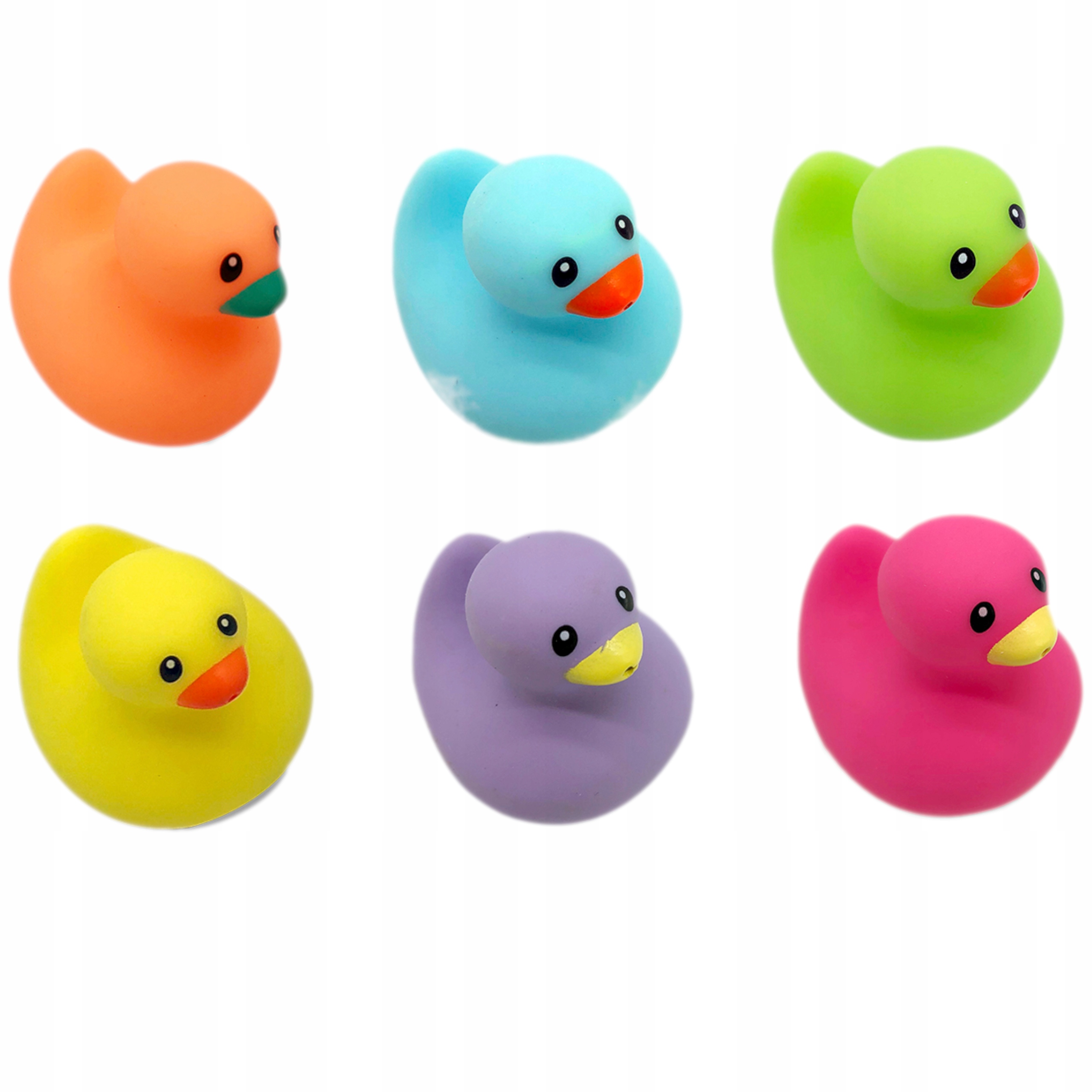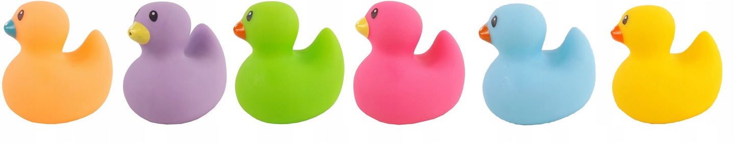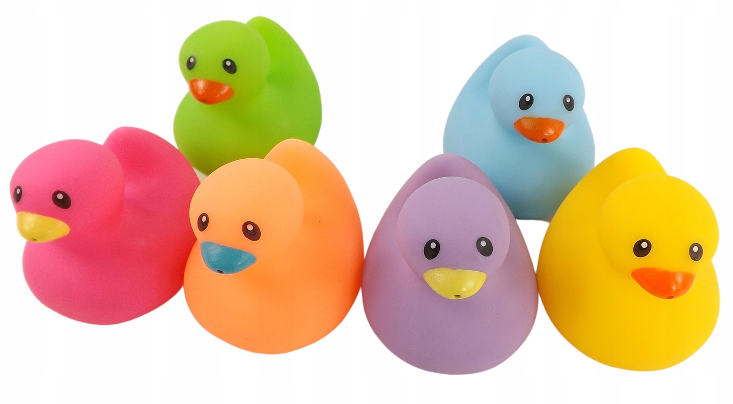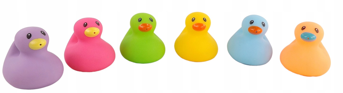 - 6 różnokolorowych kaczuszek (żółta, pomarańczowa, zielona, niebieska, fioletowa, różowa)