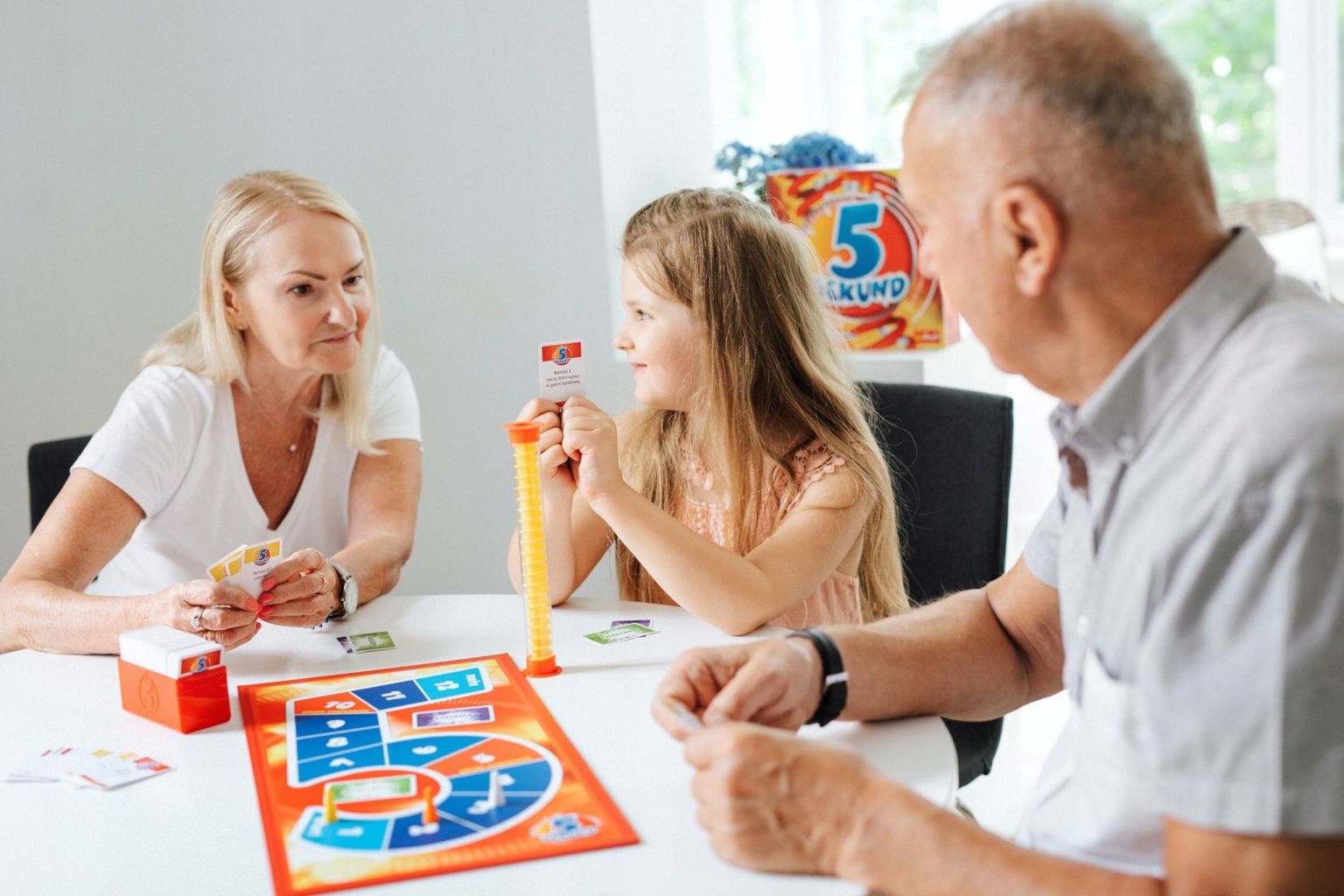 Niezwykle popularna gra 5 Sekund posiada mnóstwo różnorodnych pytań sprawdzi waszą wiedzę z wielu rozmaitych kategorii i wystawi na próbę waszą kreatywność. Wymień hasła pasujące do pytania na karcie, jednak musisz myśleć szybko. Czasomierz obracając się wydaje charakterystyczny dźwięk, kulki lecą w dół po spirali, a czas leci. Masz 5 sekund więc szybko mów co Ci ślina przyniesie na język. Pytań jest aż 756 zapewniając masę zabawy. Odpowiadaj prawidłowo, aby twój pionek przesuwał się w stronę mety by pokonać przeciwników.