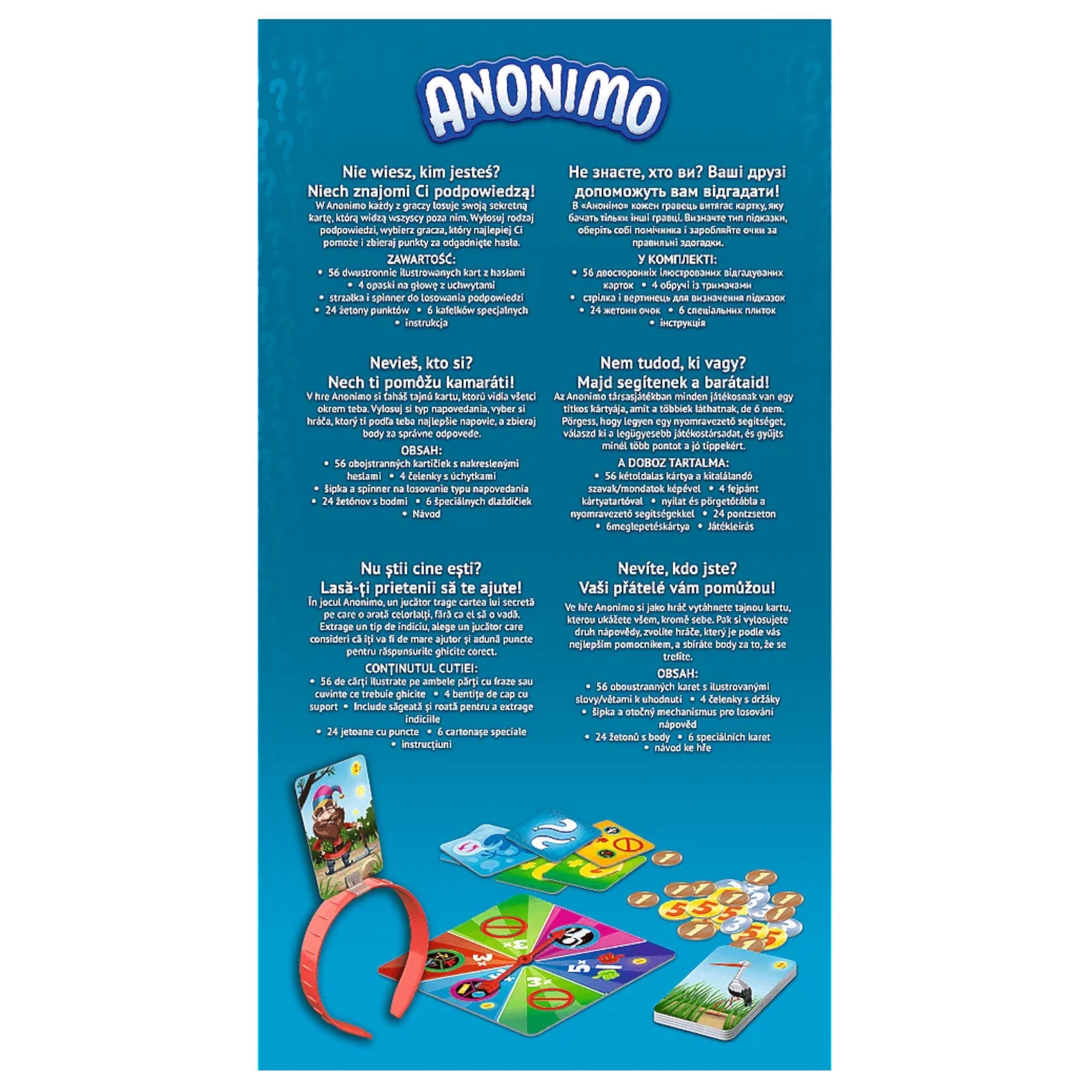 W Anonimo każdy z graczy losuje swoją sekretną kartę, którą widzą wszyscy poza nim. Wylosuj rodzaj podpowiedzi, wybierz gracza, który najlepiej Ci pomoże, i zbieraj punkty za odgadnięte hasła.