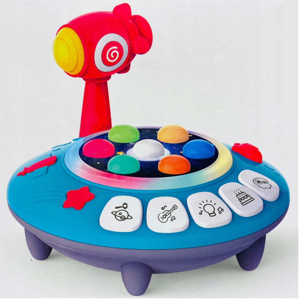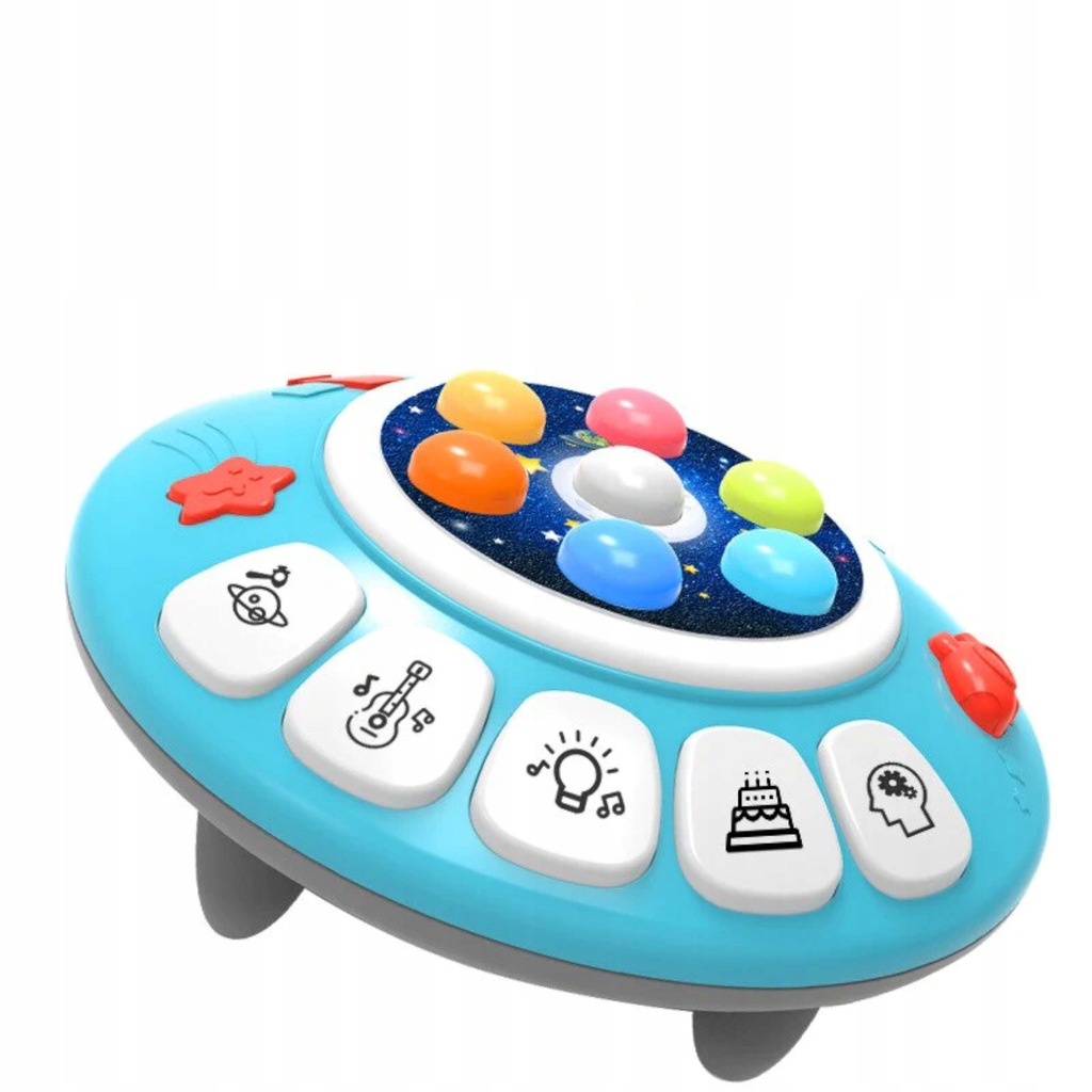 - Zabawka posiada trzy przyciski z melodiami: w kształcie statku kosmicznego, w kształcie butelki oraz w kształcie gwiazdki. Po naciśnięciu przycisku statku usłyszymy piosenkę śpiewaną w języku angielskim. W trakcie trwania piosenki guziczki świecą się naprzemiennie, a tarcza wokół guzików miga. Kolejną melodię uruchamia ponowne kliknięcie guziku. Po naciśnięciu gwiazdki krótki utwór grany na pianinie. Temu efektowi towarzyszą świecące się naprzemiennie światełka na obręczy znajdującej się wokół guzików. Po naciśnięciu butelki usłyszymy 3 uspokajające melodie. Przy melodii guziki oraz obręcz świecą się uspokajająco naprzemiennie. Kolejną melodię uruchamia ponowne kliknięcie guziku.