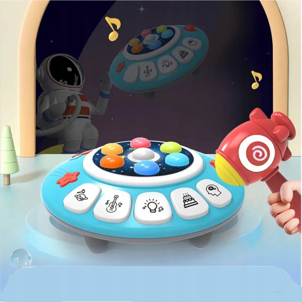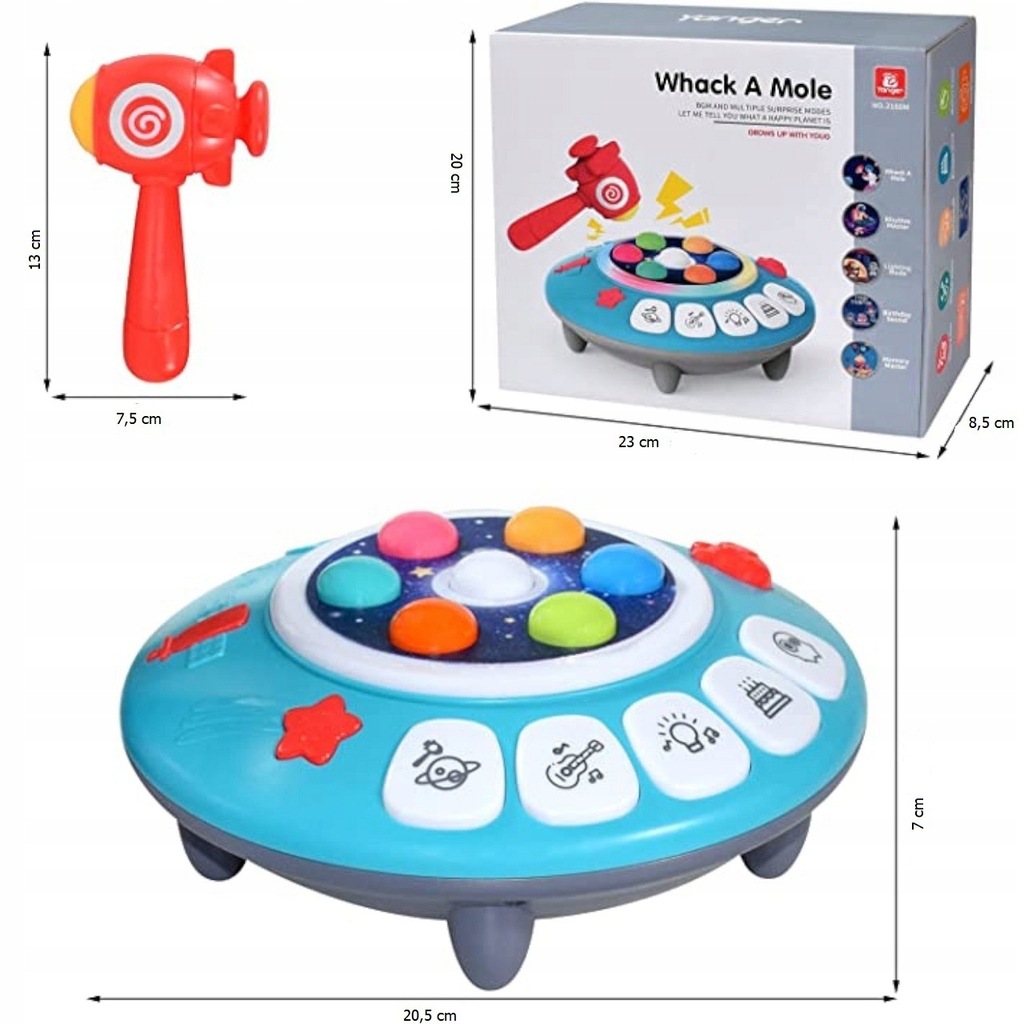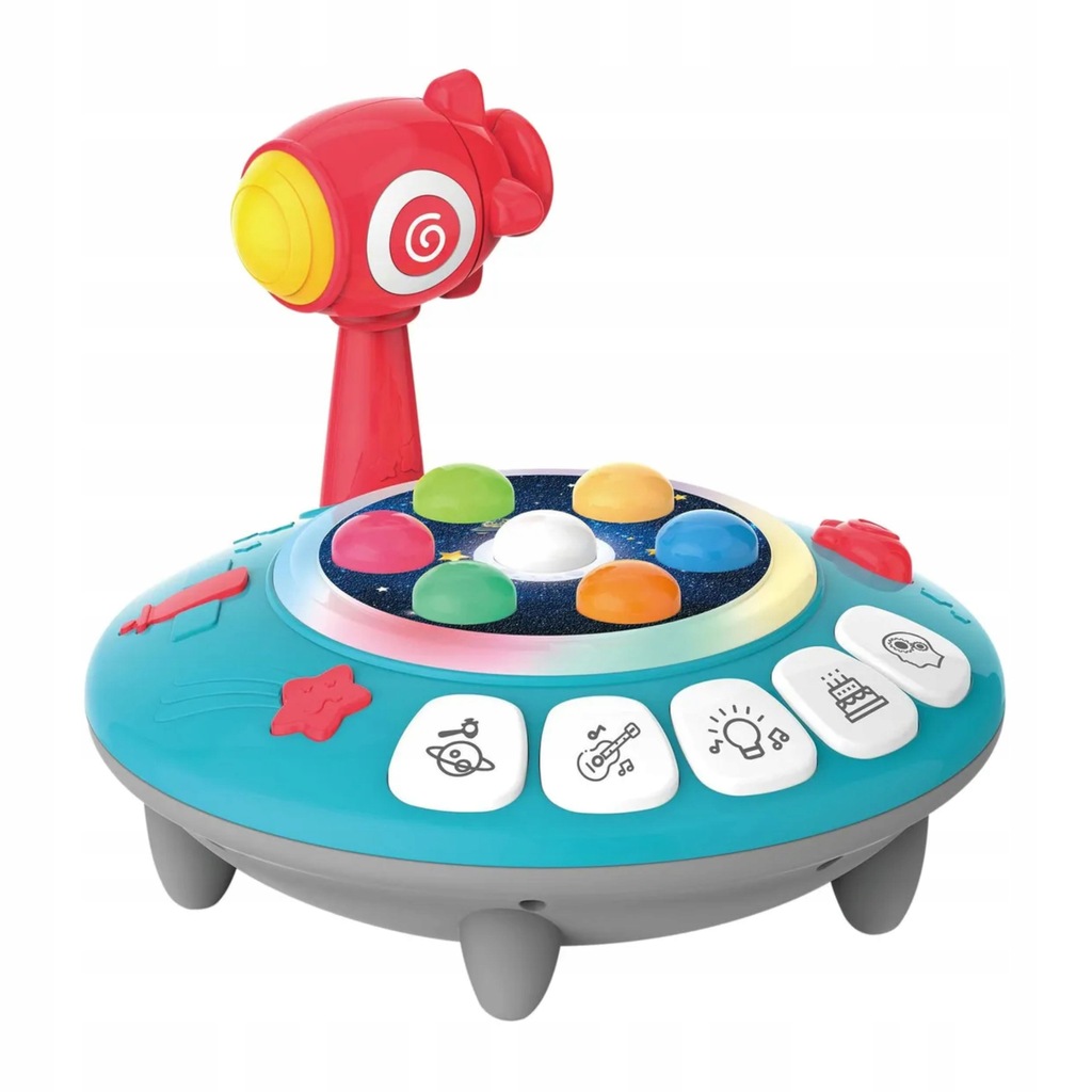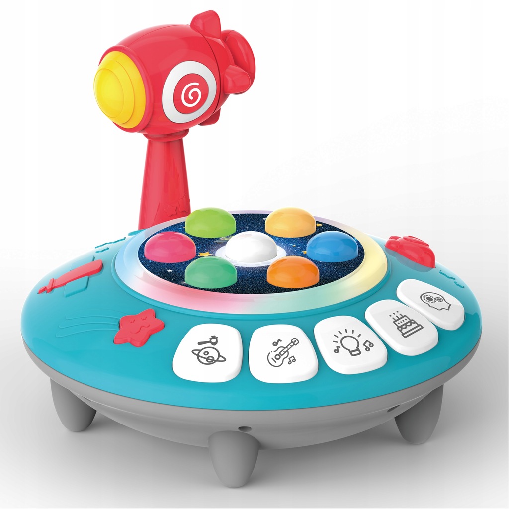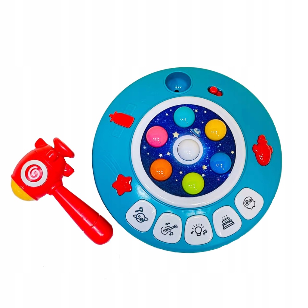- Przycisk z planetą i młoteczkiem uruchamia tryb, w którym zapala się dany przycisk, a dziecko musi odpowiednio w niego trafić. Jeśli trafimy dobrze 15 przycisków, włącza nam się melodia, która nas nagradza. Natomiast, jeśli nie trafimy w cztery przyciski pod rząd, słyszymy krótki dźwięk wskazujący na porażkę. Za każdym razem odpowiedni dźwięk wskazuje nam czy trafiliśmy odpowiednio w kolor czy też nie. Po wygranej lub przegranej zabawa sama się wznawia – można grać bez końca!