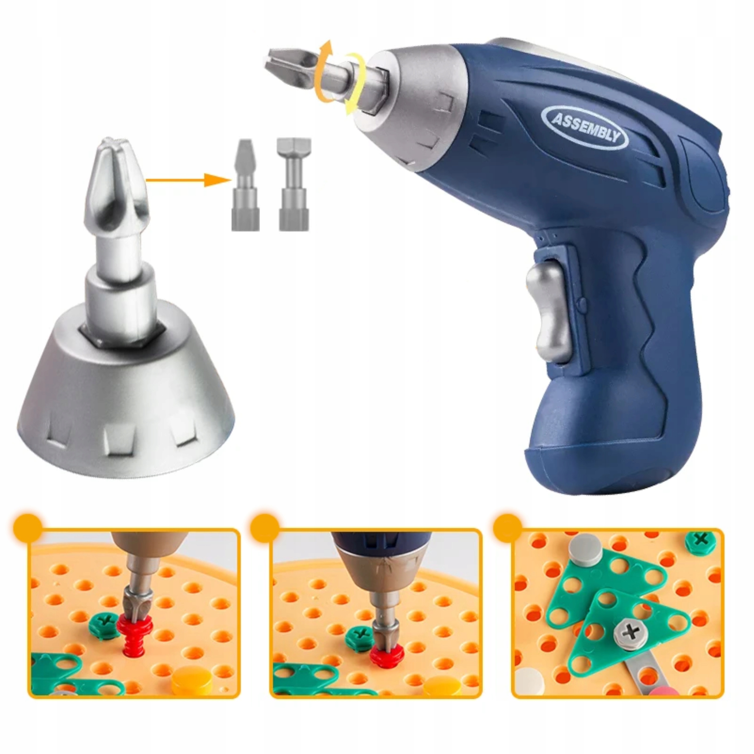 Niezwykłym dodatkiem w zestawie konstrukcyjnym jest wkrętarka, która działa na baterie. Po przełączeniu przełącznika w prawo możemy wkręcać śrubki, natomiast kiedy przełączymy go w lewo wykręcimy element. Dzięki wiertarce, dzieci mogą z łatwością łączyć elementy, co pozwala na jeszcze bardziej zaawansowane i interaktywne budowanie. Jest bezpieczne dla dzieci dzięki zaokrąglonym krawędziom.