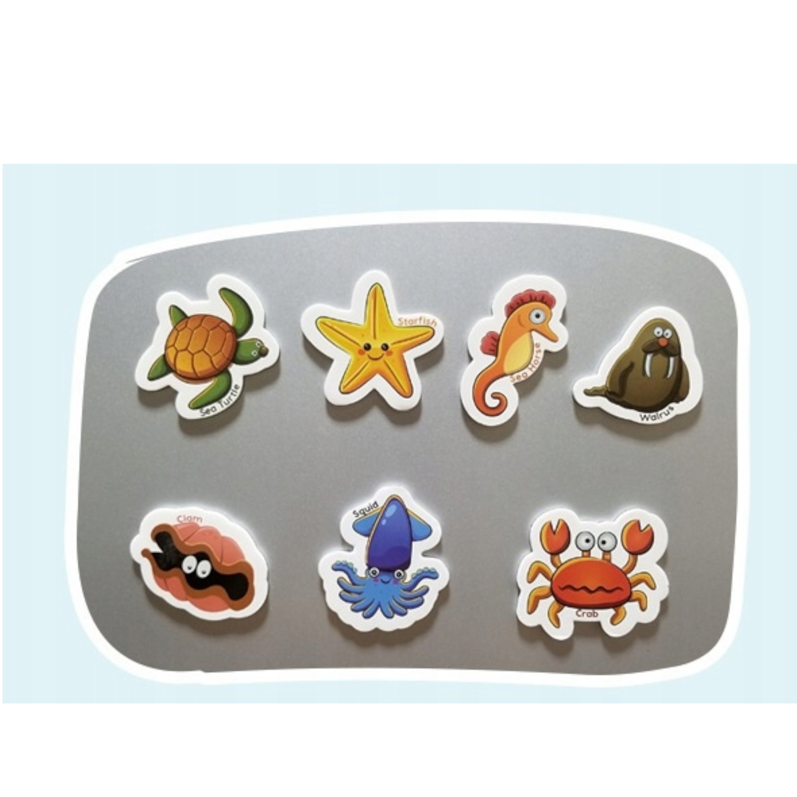 - Zwierzęta wodne – 7 szt. – małża, kalmar, kałamarnica, krab, konik morski, rozgwiazda, mors, żółw.