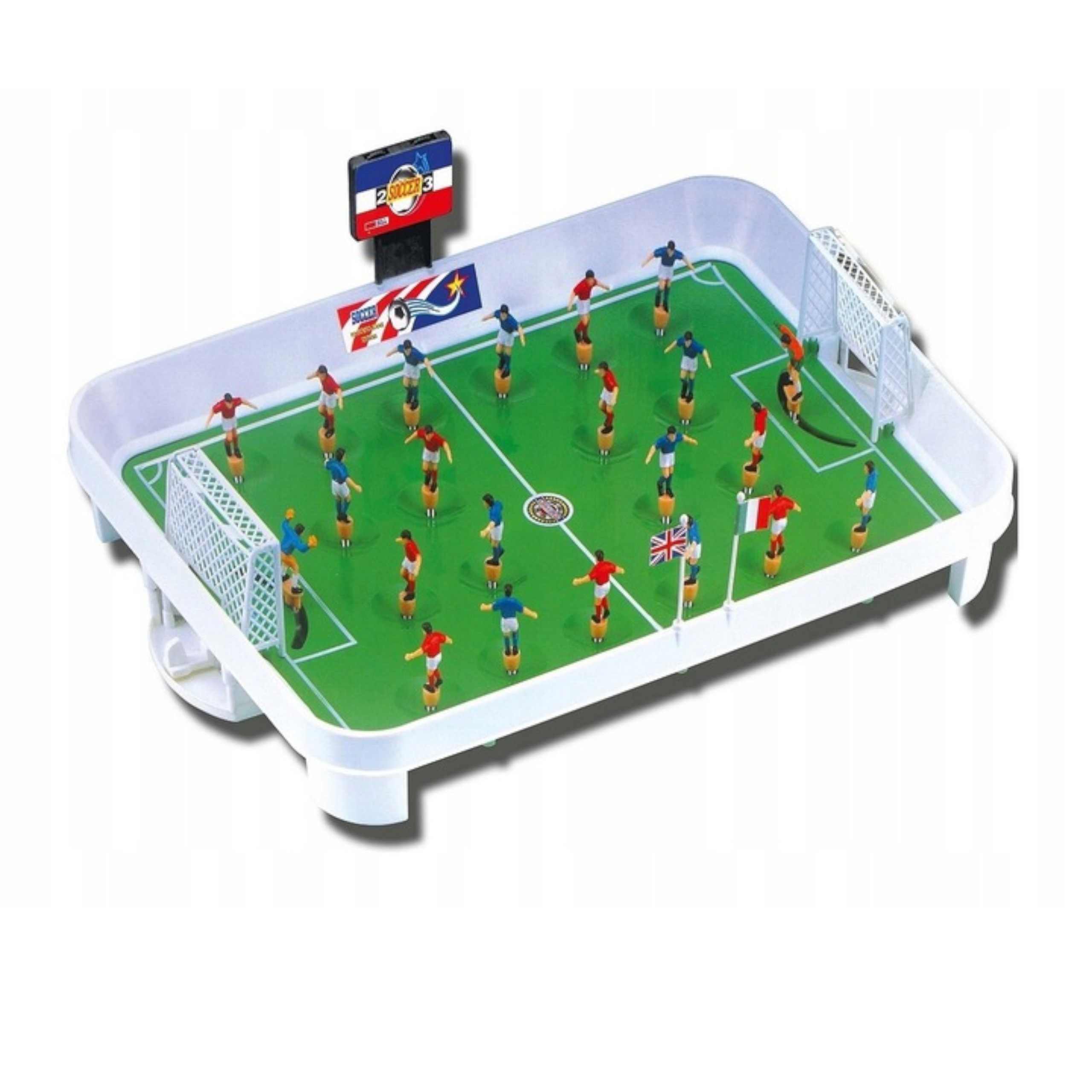 Mecze piłki nożnej z wykorzystaniem przedstawionego zestawu z pewnością przyniosą każdemu dużo radości! Budowa boiska jest bardzo prosta, składa się z grubej, wytrzymałej planszy oraz dwóch plastikowych bramek znajdujących się po przeciwnych stronach. Zdobycie punktu jest ciekawym wyzwaniem, które wymaga sprytu i sprawności rąk.