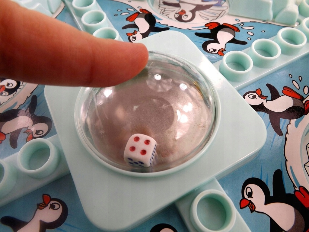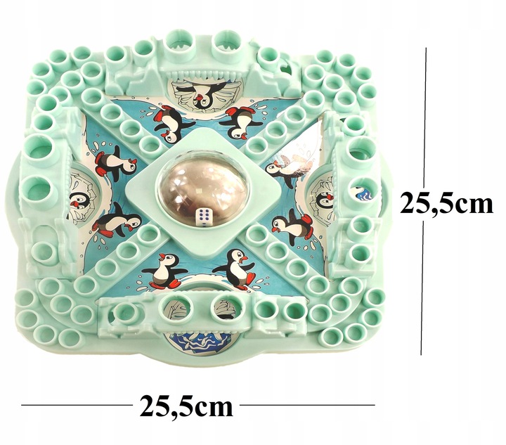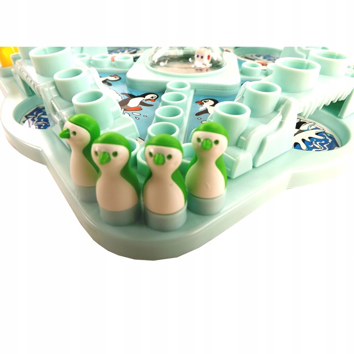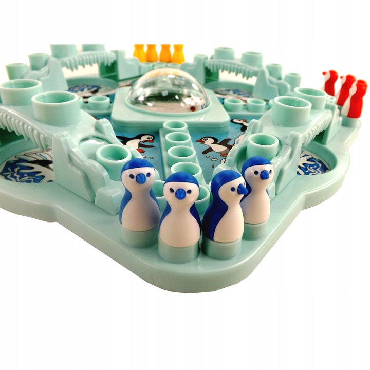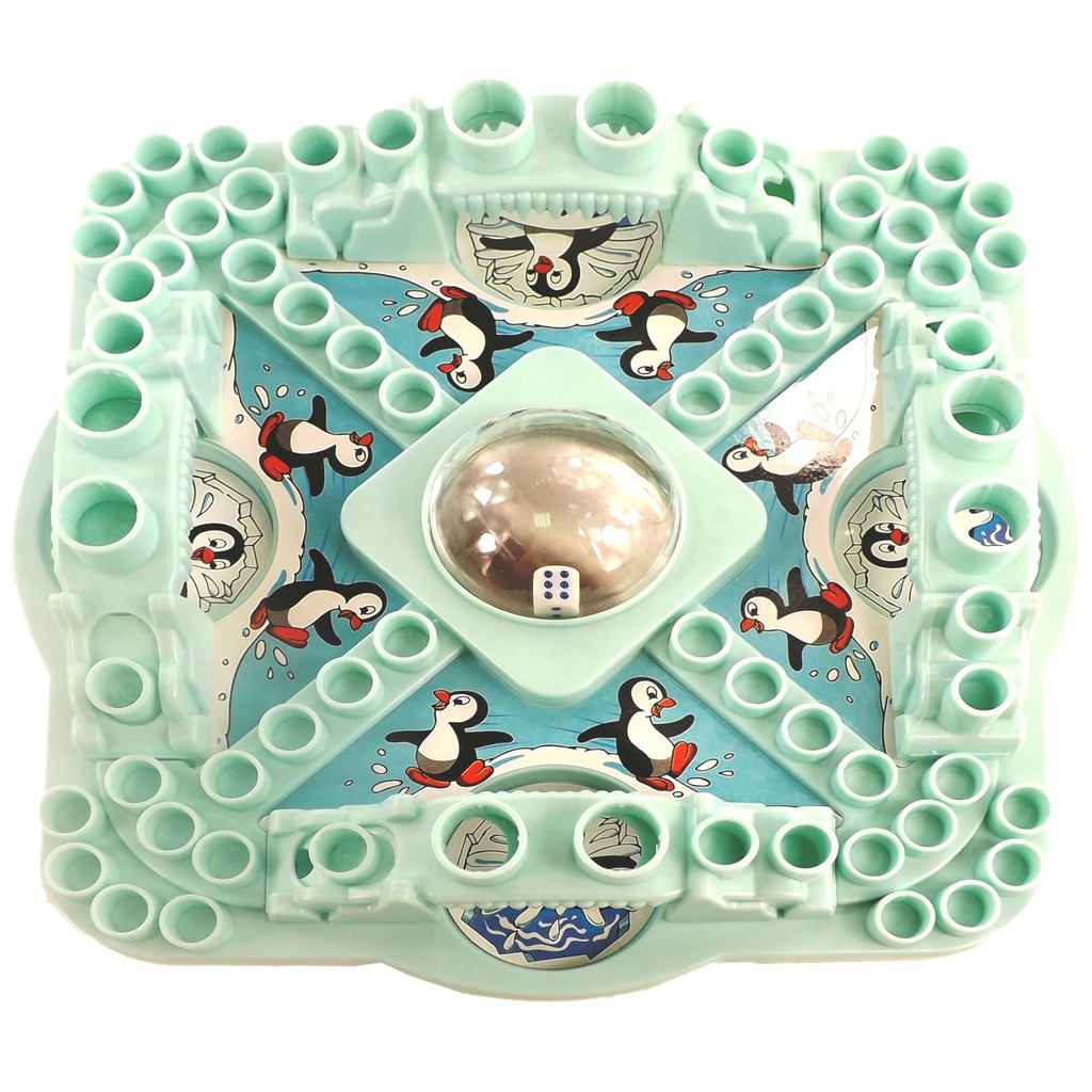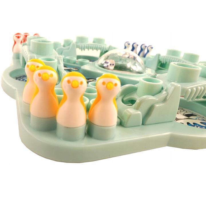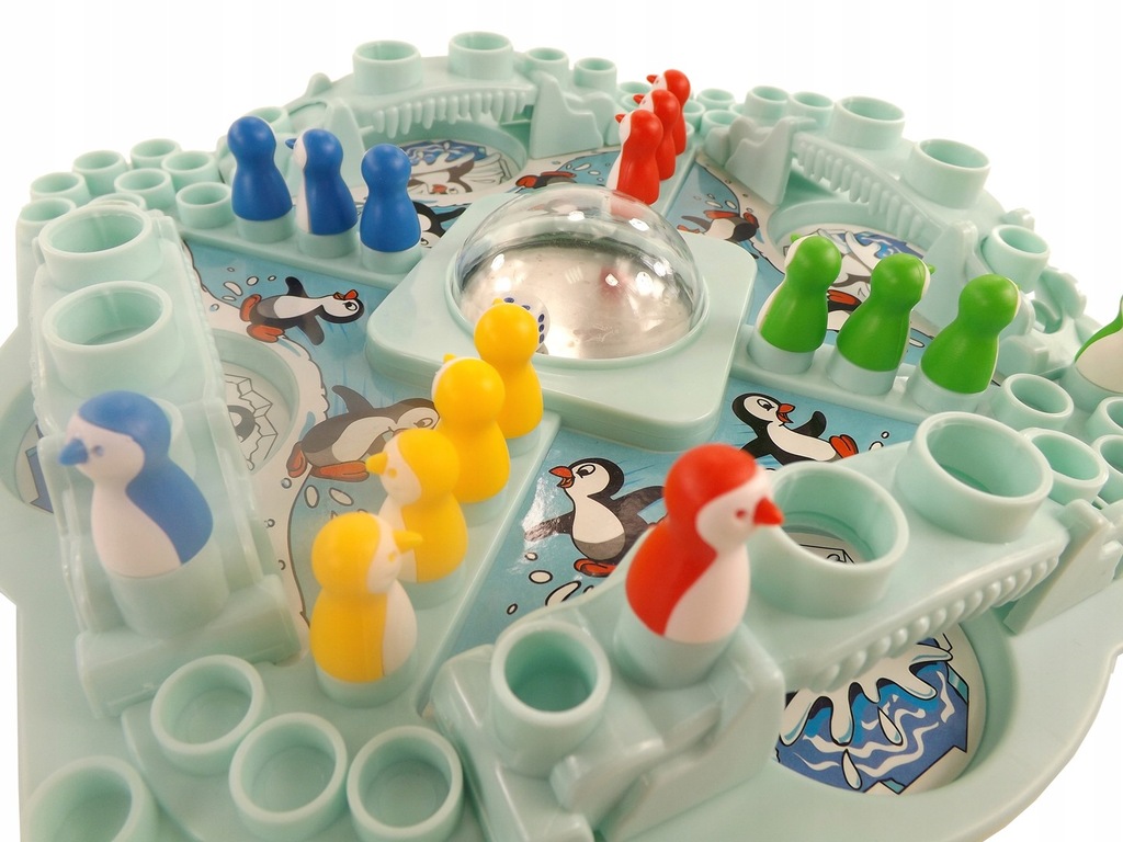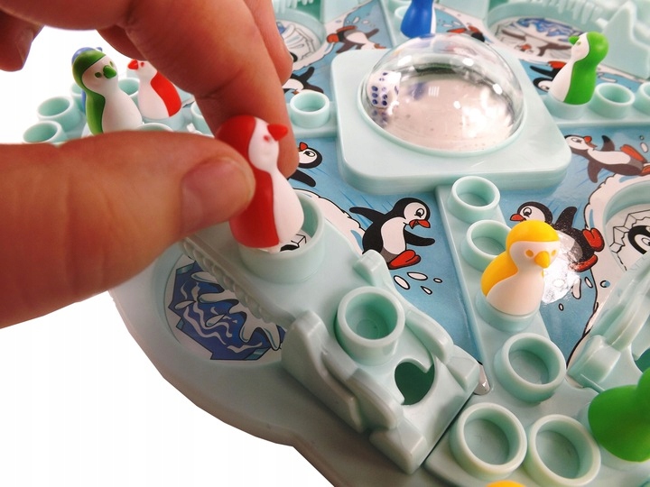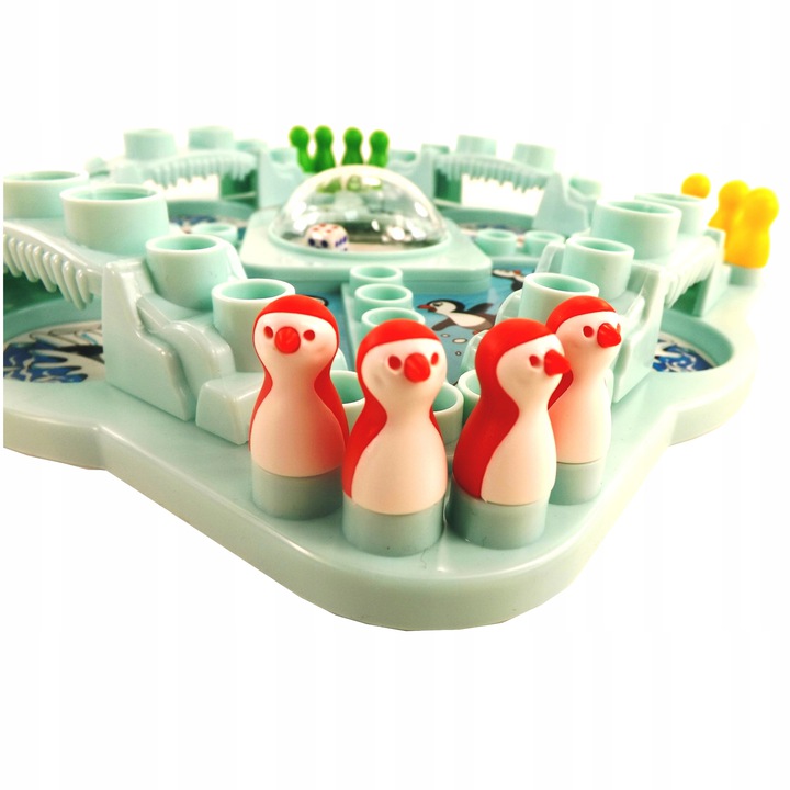 Jak grać? Na planszę należy nałożyć w odpowiednim miejscu mosty, przesuwając ruchome wkładki w mostach tak aby pułapki były niewidoczne. Każdy gracz wybiera 4 pingwiny w tym samym kolorze (żółty, czerwony, niebieski, zielony) i ustawia w swoim narożniku. Grę rozpoczyna gracz, który wyrzuci 6 oczek. Kostka jest zamknięta w półkuli i nie ma obawy, że gdzieś zaginie. Pingwiny poruszają się zgodnie z ruchem wskazówek zegara o ilość oczek wskazanych przez kostkę. Niezwykła zabawa właśnie się zaczyna !!! W czasie trwania jednej tury, każdy gracz może poruszać się tylko jednym pingwinem, chyba że za każdym razem wyrzuci na kostce 6 oczek. Wtedy może wprowadzić do gry kolejne pingwiny.