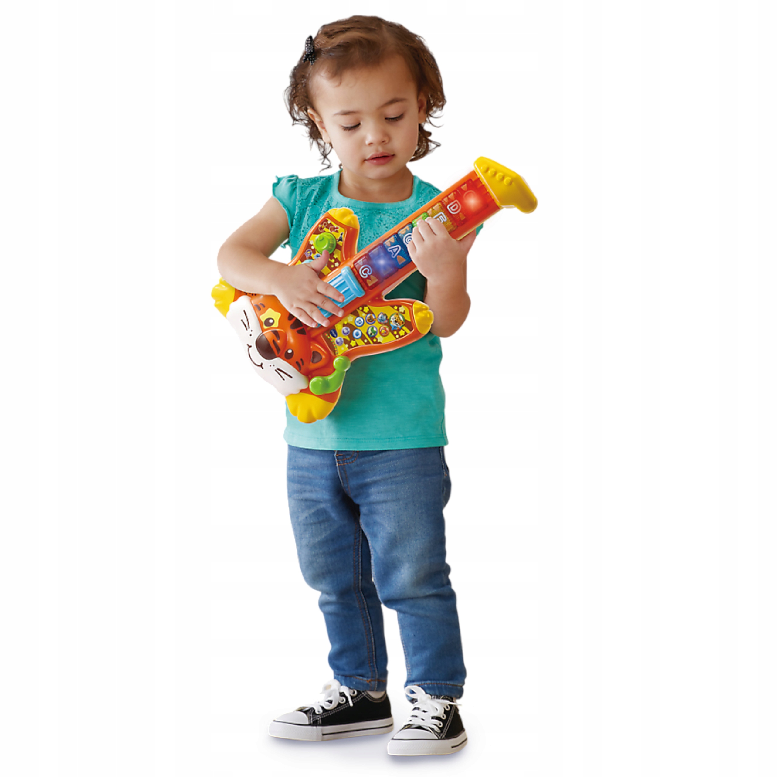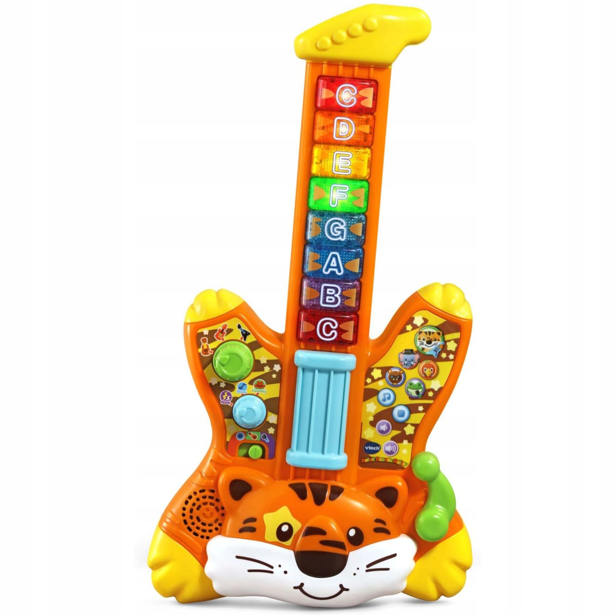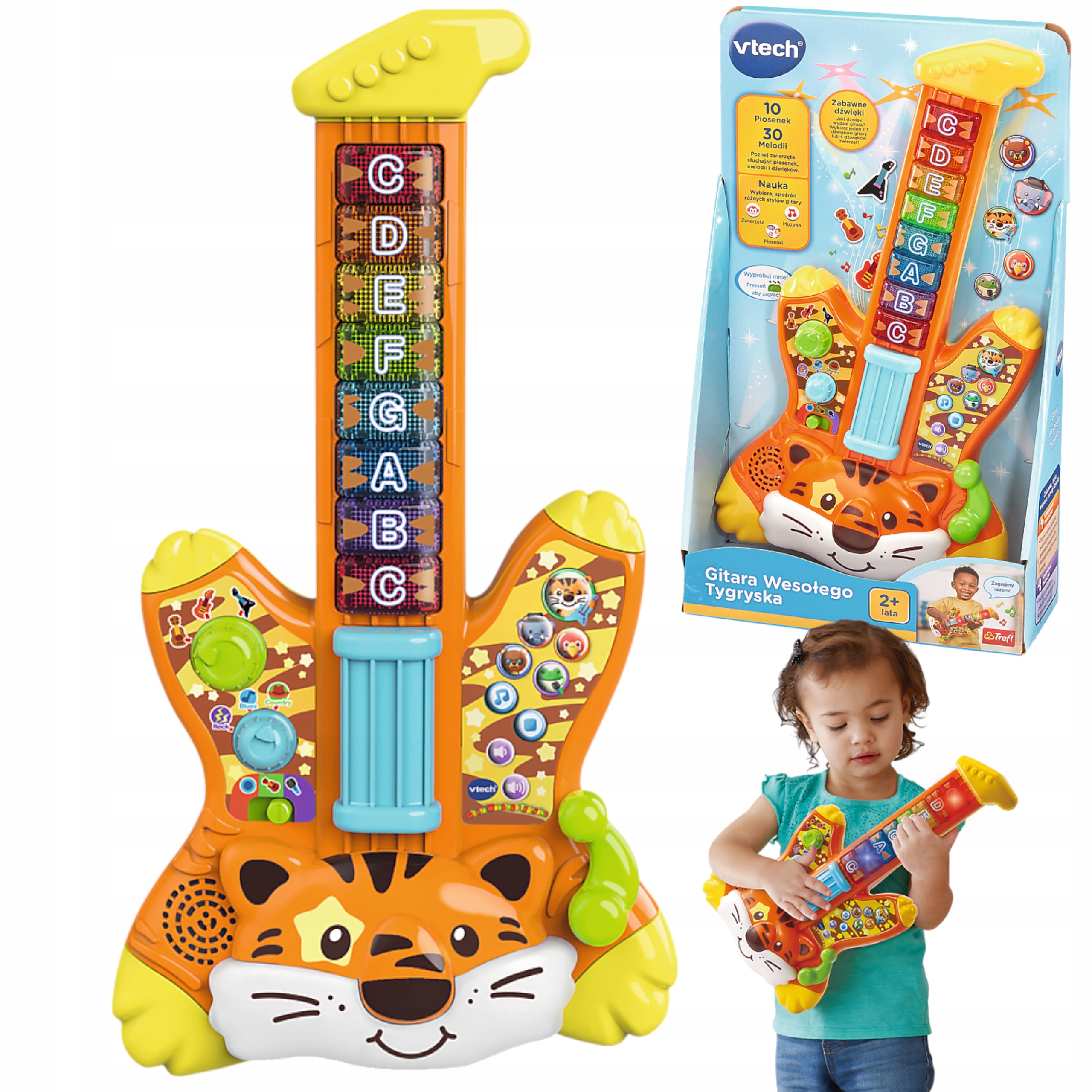 Gitara Wesołego Tygryska firmy Vtech to idealna zabawka dla Twojego małego muzyka. Gitarka odtwarza zabawne piosenki w języku polskim, różne melodie i pozwalana granie własnych utworów. Zabawę uatrakcyjniają odgłosy zwierzątek i kolorowe światełka w przyciskach na gryfie.