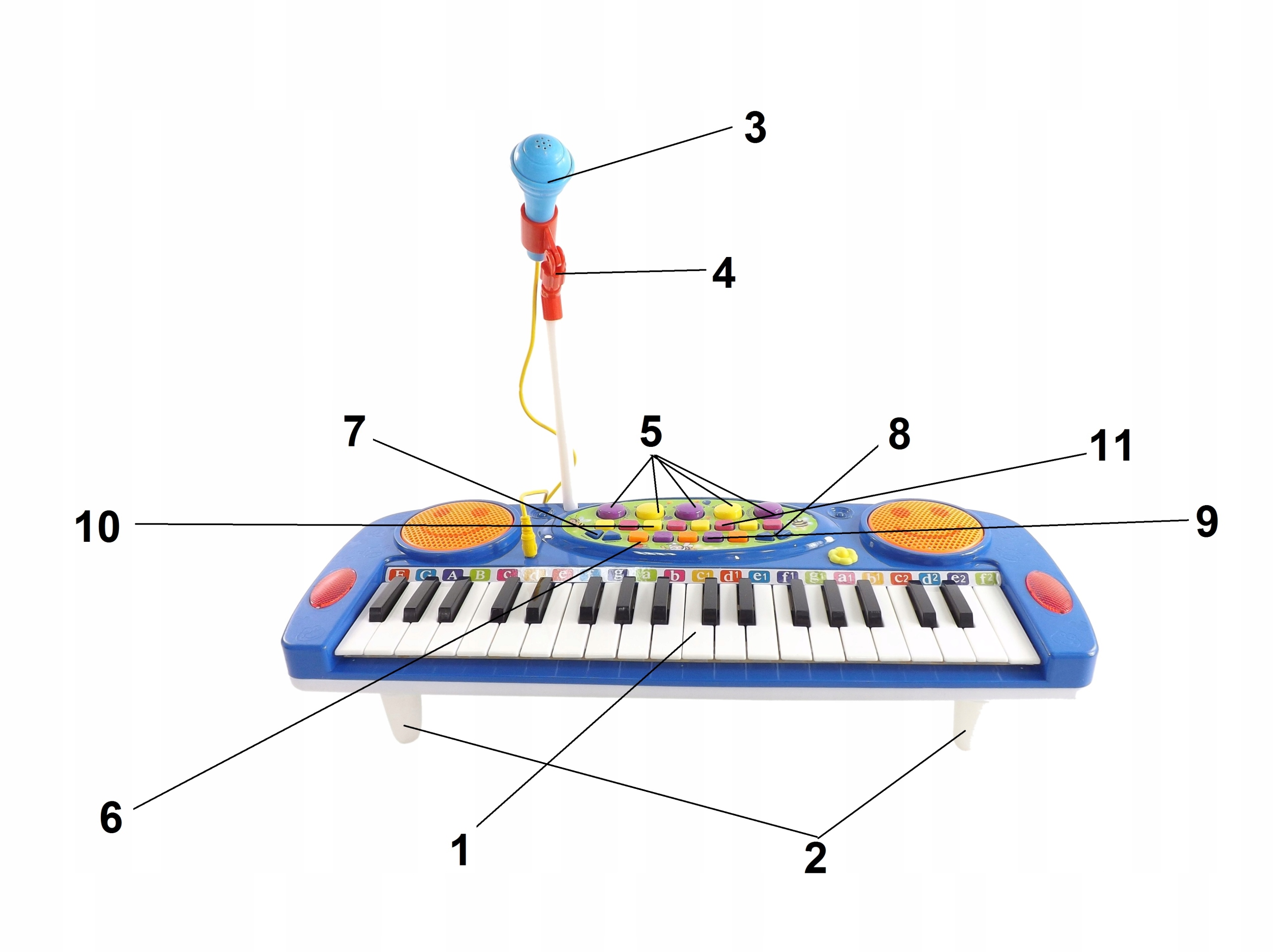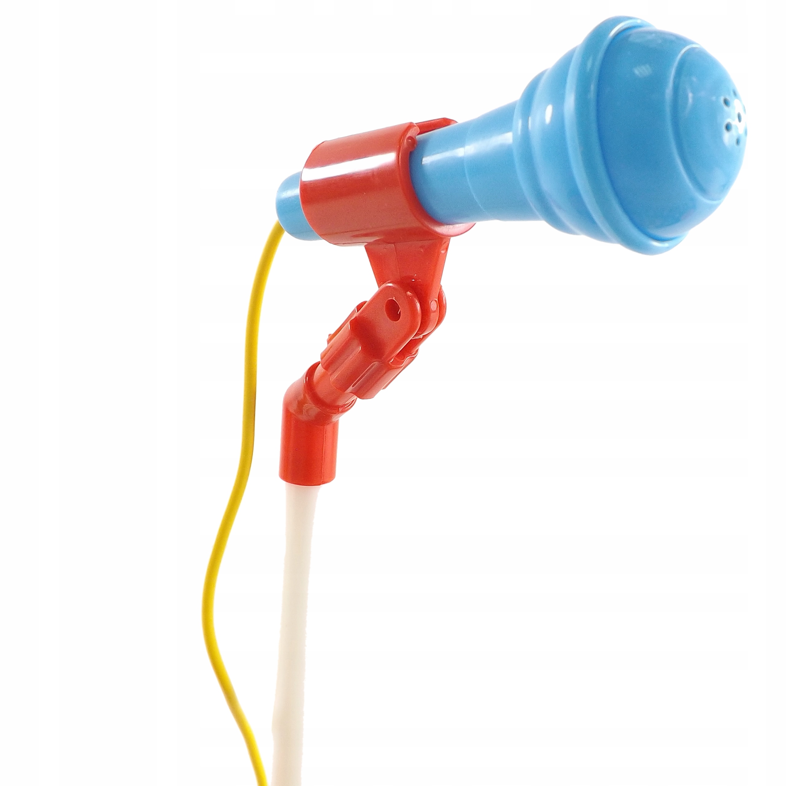 3. Zabawka posiada delikatnie nagłaśniający mikrofon z kablem. Mikrofon można używać zarówno na stojaku jak i poza nim. Mikrofon podłącza się do organów za pomocą kabla.