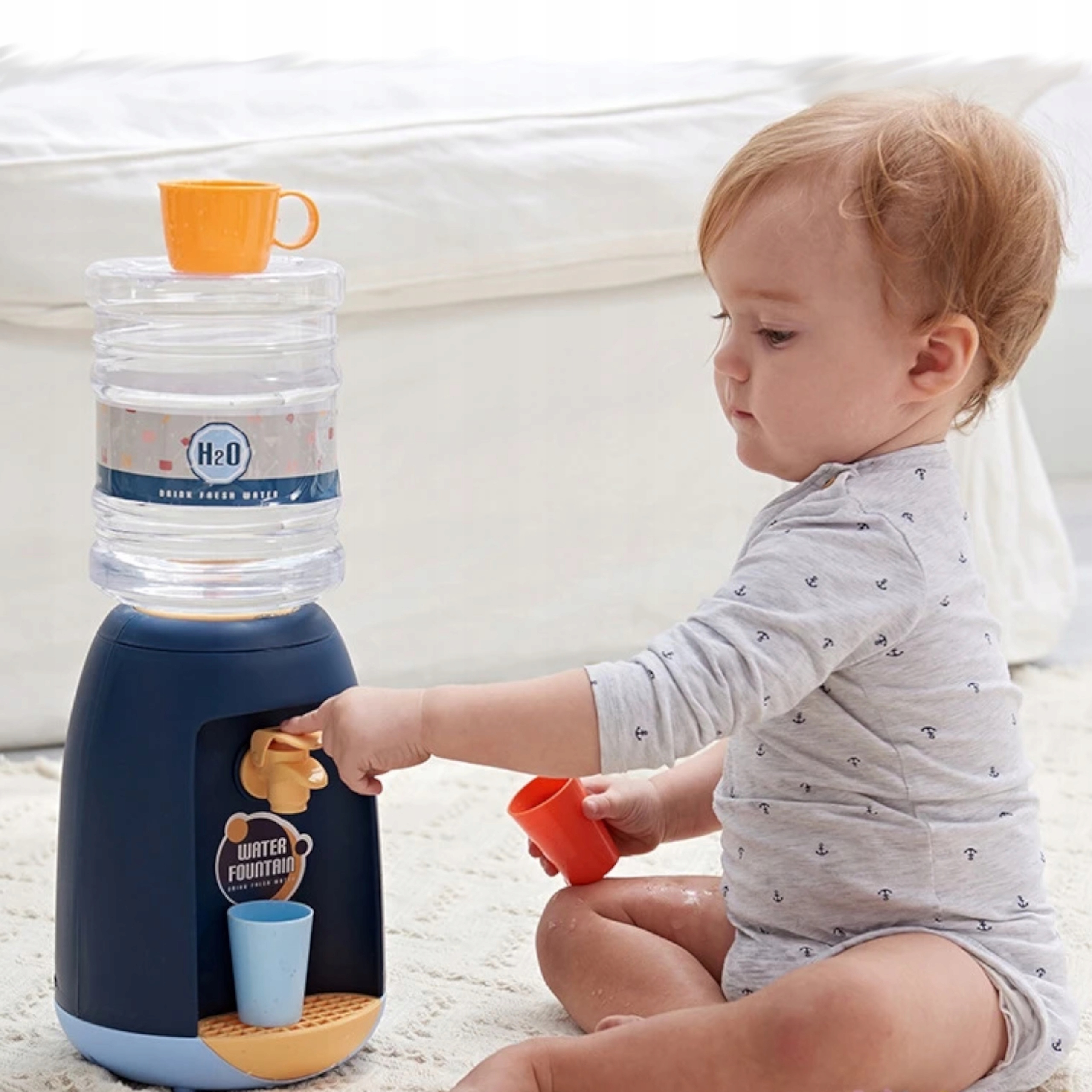 Zabawkowy dystrybutor do wody to idealna zabawka dla dzieci chcących naśladować czynności dorosłych oraz wprowadzić nawyk picia wody. Duży dozownik na wodę posiada ciekawy kształt w żywych kolorach. W zestawie znajduje się odkręcana buteleczka do której można nalać wody oraz kubeczek kubeczki z którego dziecko może częstować się wodą.