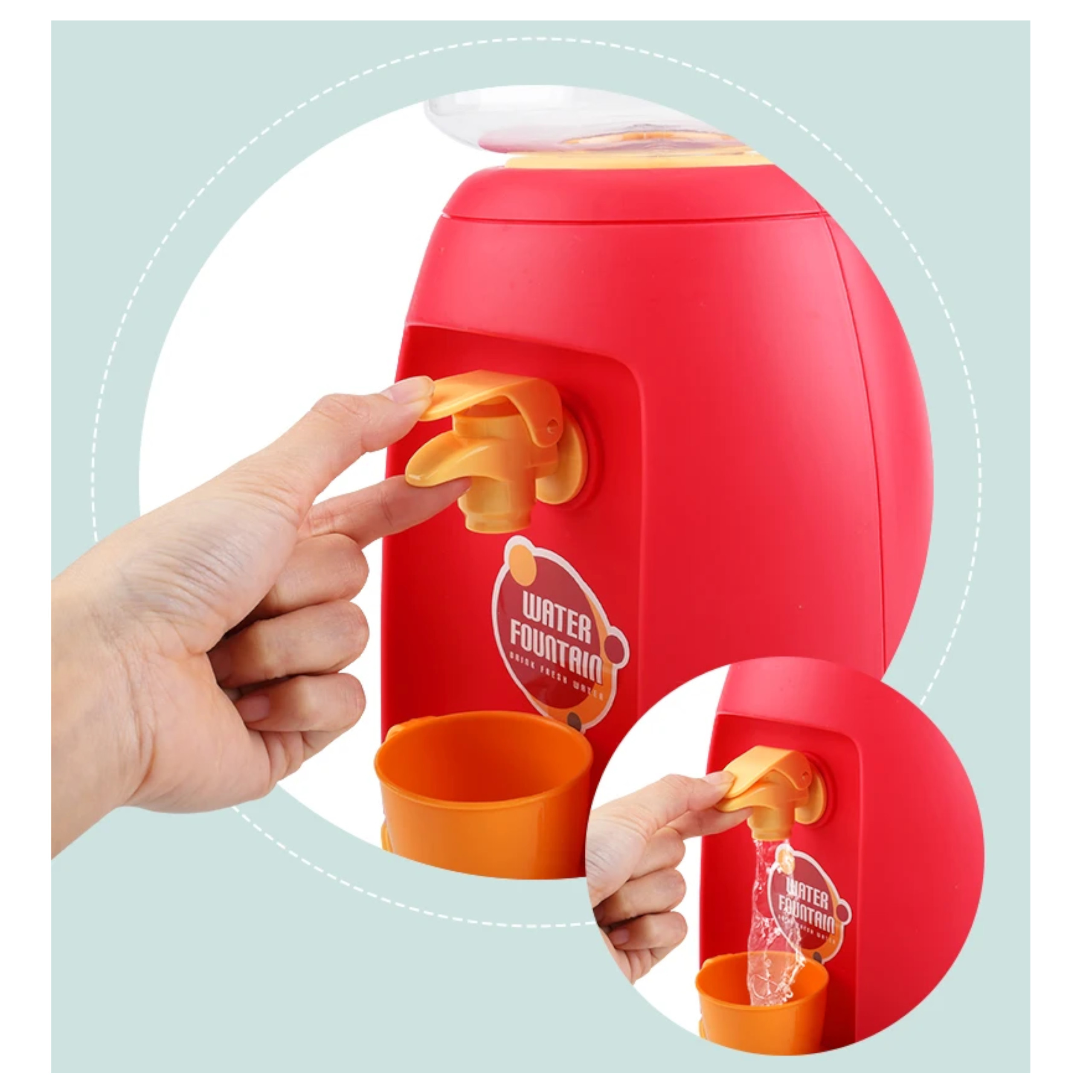 4. Poprzez naciskanie palcem małą pompkę ręczną, woda zacznie przelewać się do kubka, przez co dziecko może częstować się wodą cały czas.