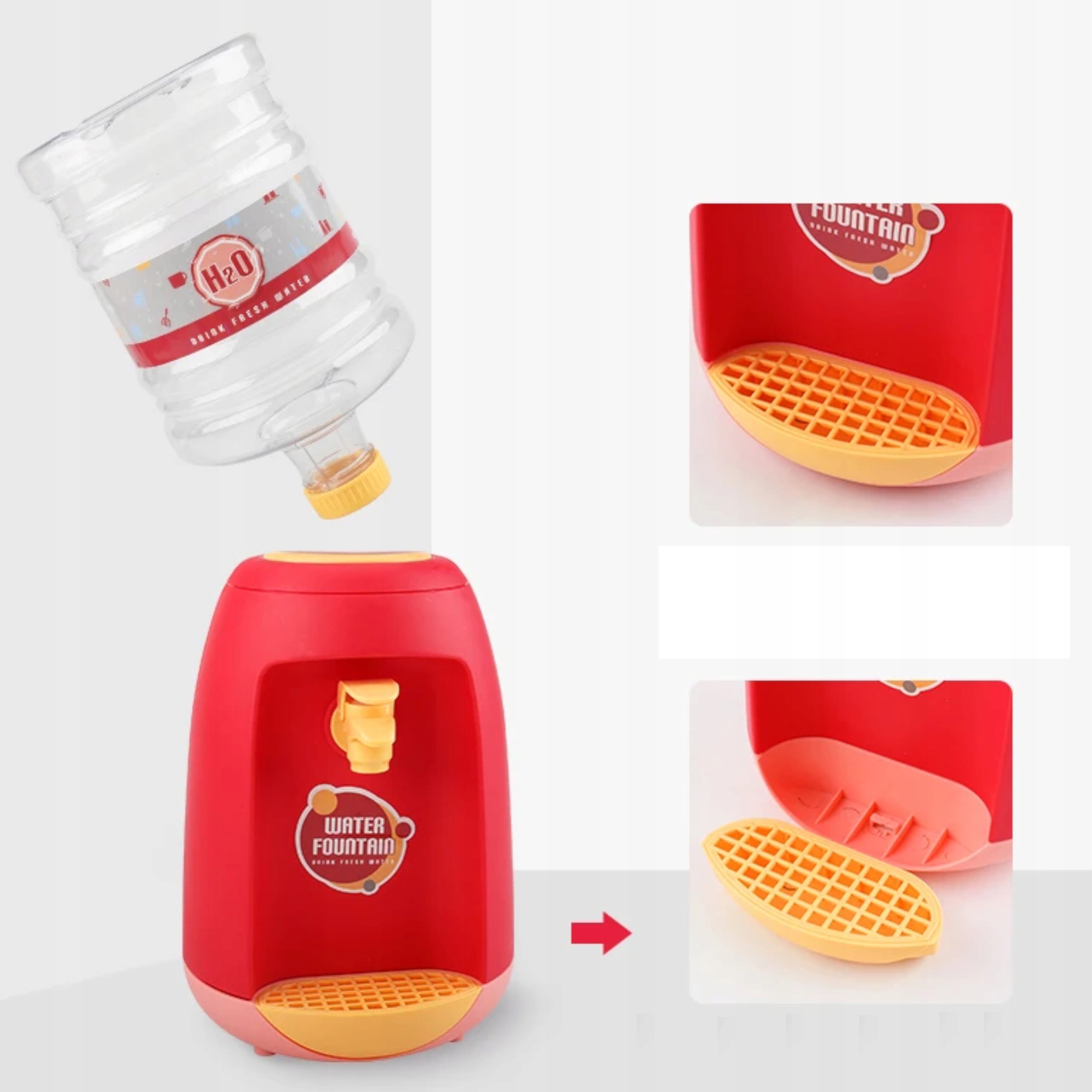 Zabawkowy dystrybutor do wody to idealna zabawka dla dzieci chcących naśladować czynności dorosłych oraz wprowadzić nawyk picia wody. Duży dozownik na wodę posiada ciekawy kształt w żywych kolorach. W zestawie znajduje się odkręcana buteleczka do której można nalać wody oraz kubeczek kubeczki z którego dziecko może częstować się wodą.