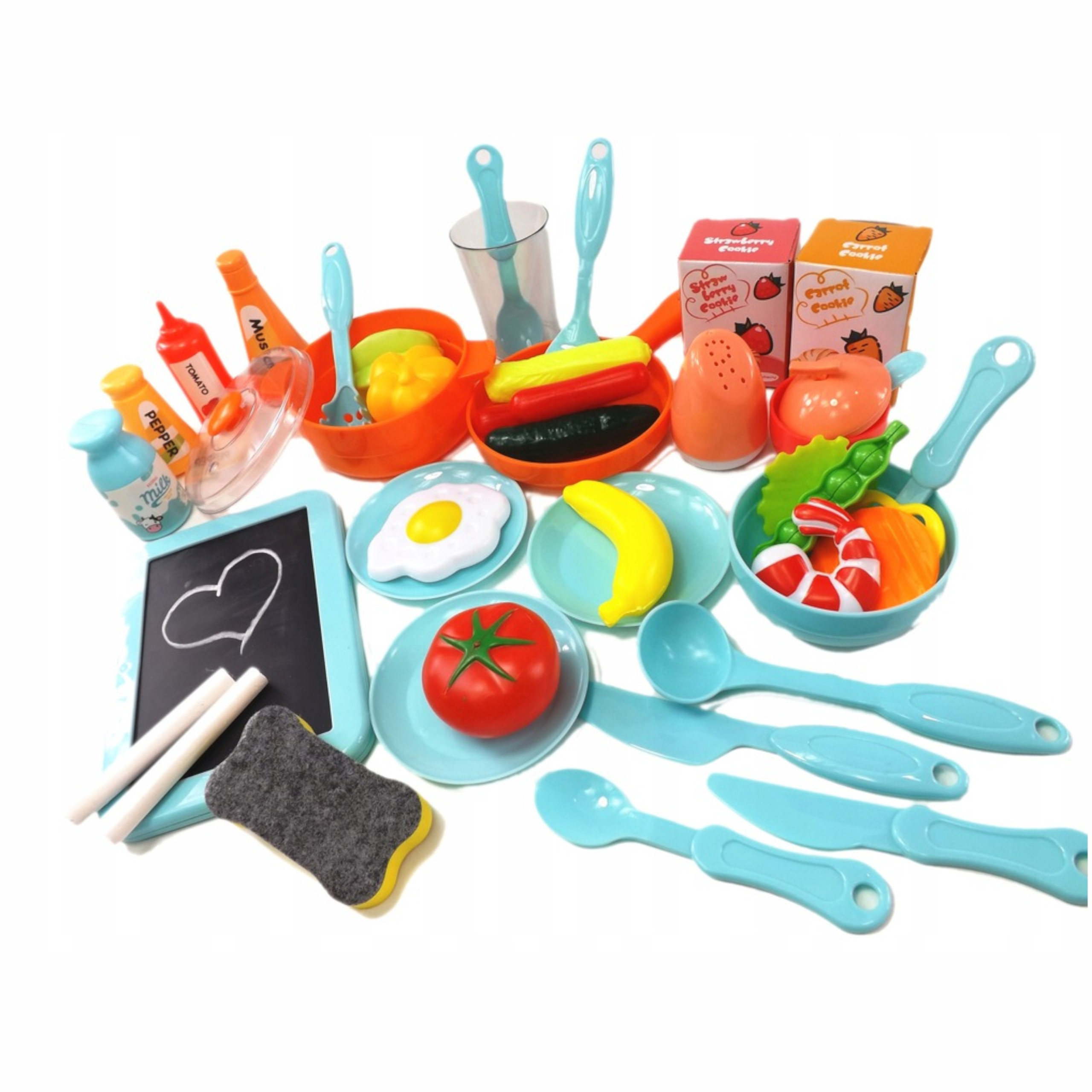 - Owoce i warzywa: papryka, pomidor, banan, ogórek, groszek zielony, liść sałaty, sałata pekińska, plasterek marchewki, plasterek papryki, krewetka, jajko sadzone, parówki