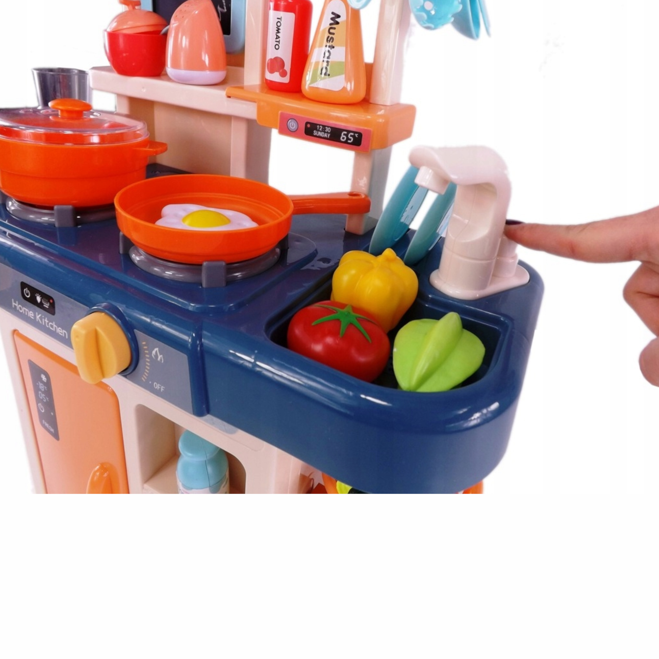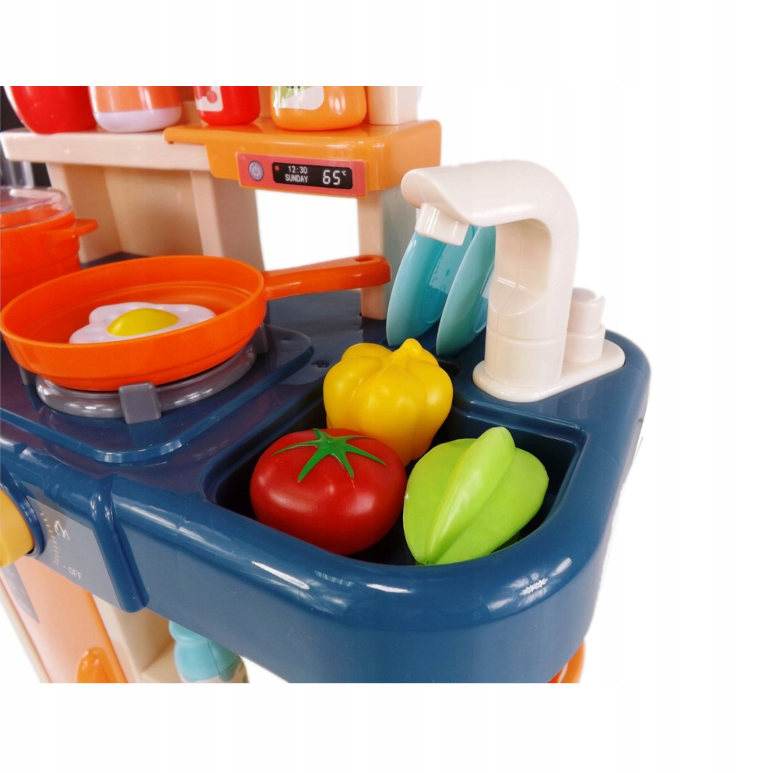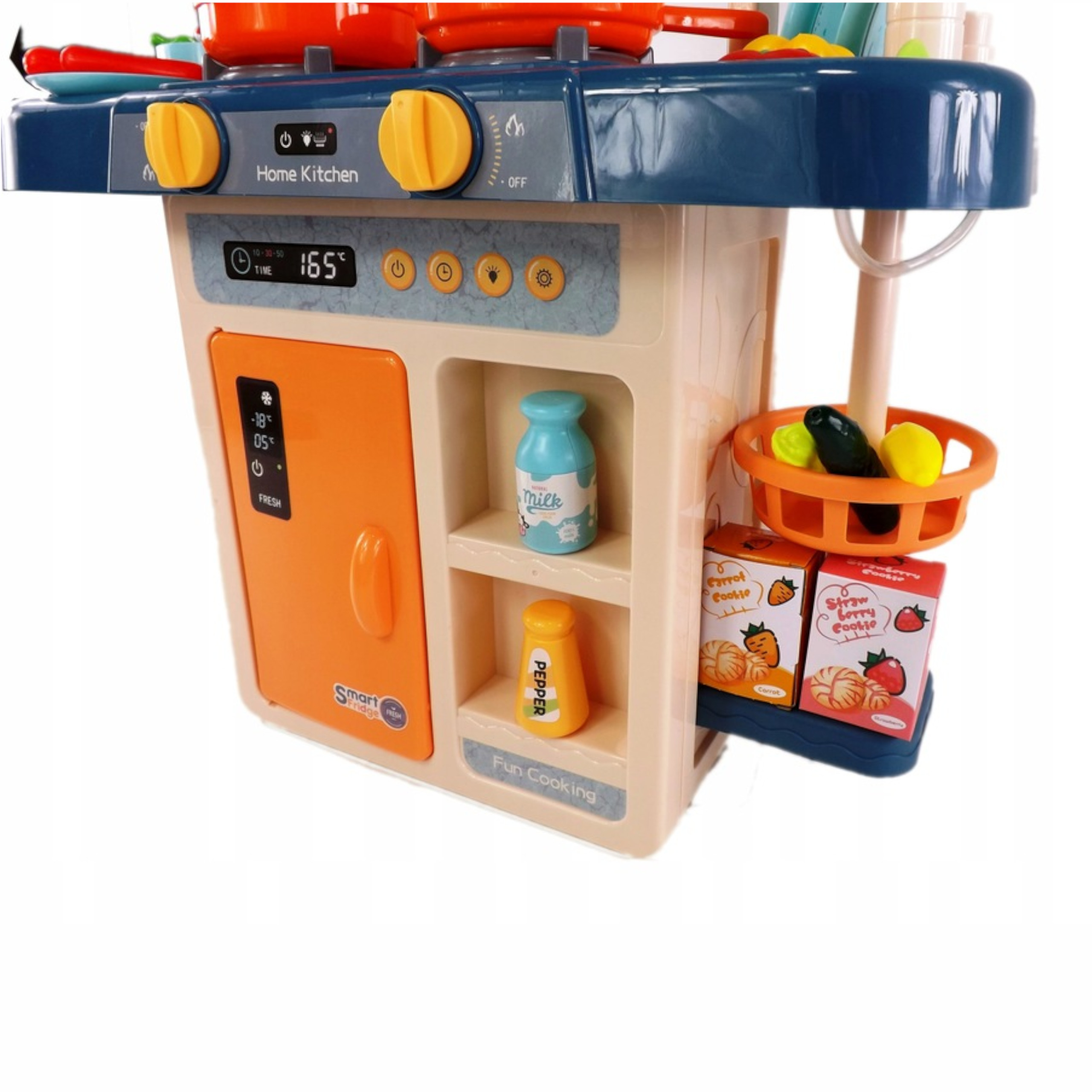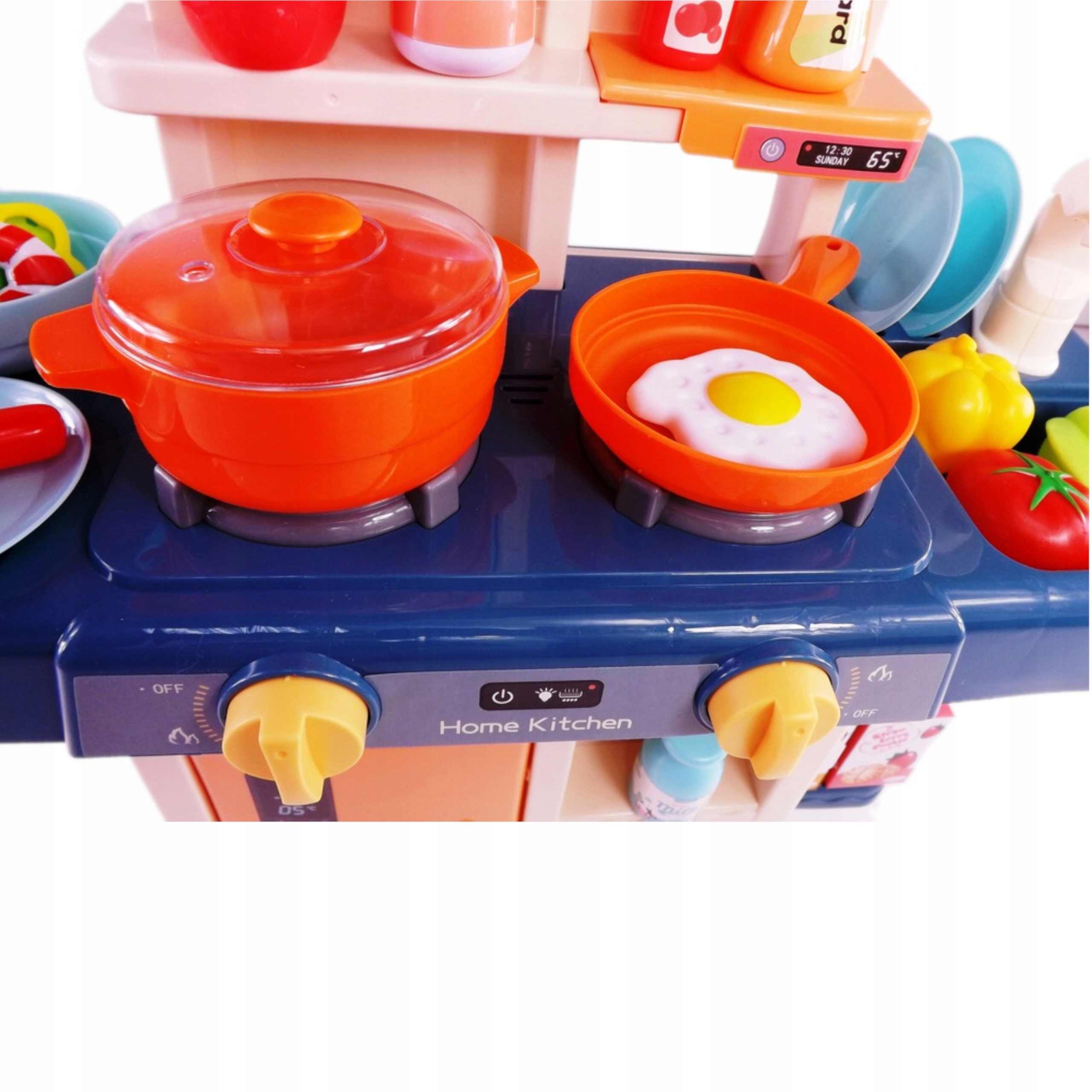 Kuchnia dla dzieci palniki para kran z wodą lodówka artykuły domowe gotowanie