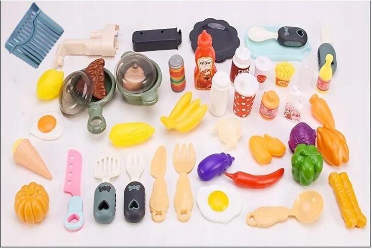 Zestaw zawiera garnki i sztućce, warzywa, owoce czy opakowania kartonowe imitujące produkty mleczne.
