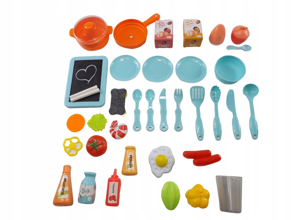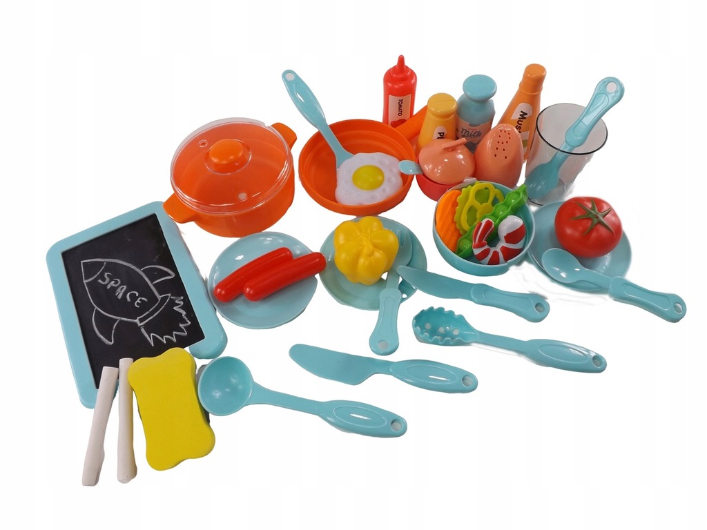 Kuchnia, garnek z przykrywką, patelnia, miska, tablica kredowa, dwa kawałki kredy, gąbka sucho ścieralna, kubeczek, trzy talerzyki, parówki, jajko sadzone, krewetka, plaster papryki, plaster marchewki, liść sałaty, groszek, pieprz, sól, mleko, musztarda, ketchup, papryka, pomidor, cukierniczka z łyżeczką, dwie małe łyżeczki, widelec, nóż, chochla, cedzak, duży nóż do krojenia oraz łopatka do mięsa.