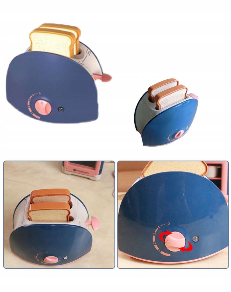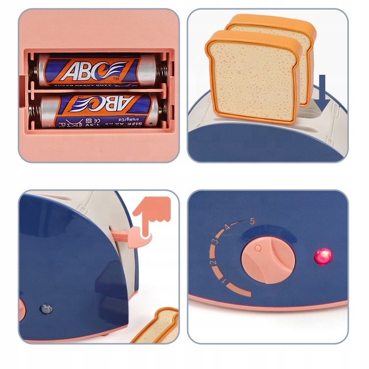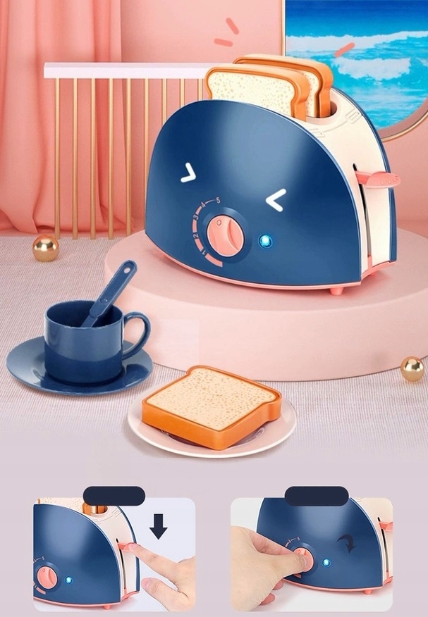 Toster świetnie odwzorowuje prawdziwy sprzęt kuchenny. Włóż tosty do otworów od góry, włącz toster przyciskiem z prawej strony, po kilku sekundkach tosty same wyskoczą z tostera jak w prawdziwym tosterze. Pieczeniu tostów towarzyszy dźwięk i migające światło z przodu. Z przodu znajduje się szczyrkające pokrętło, atrapka zmiany natężenia upieczenia tostów.