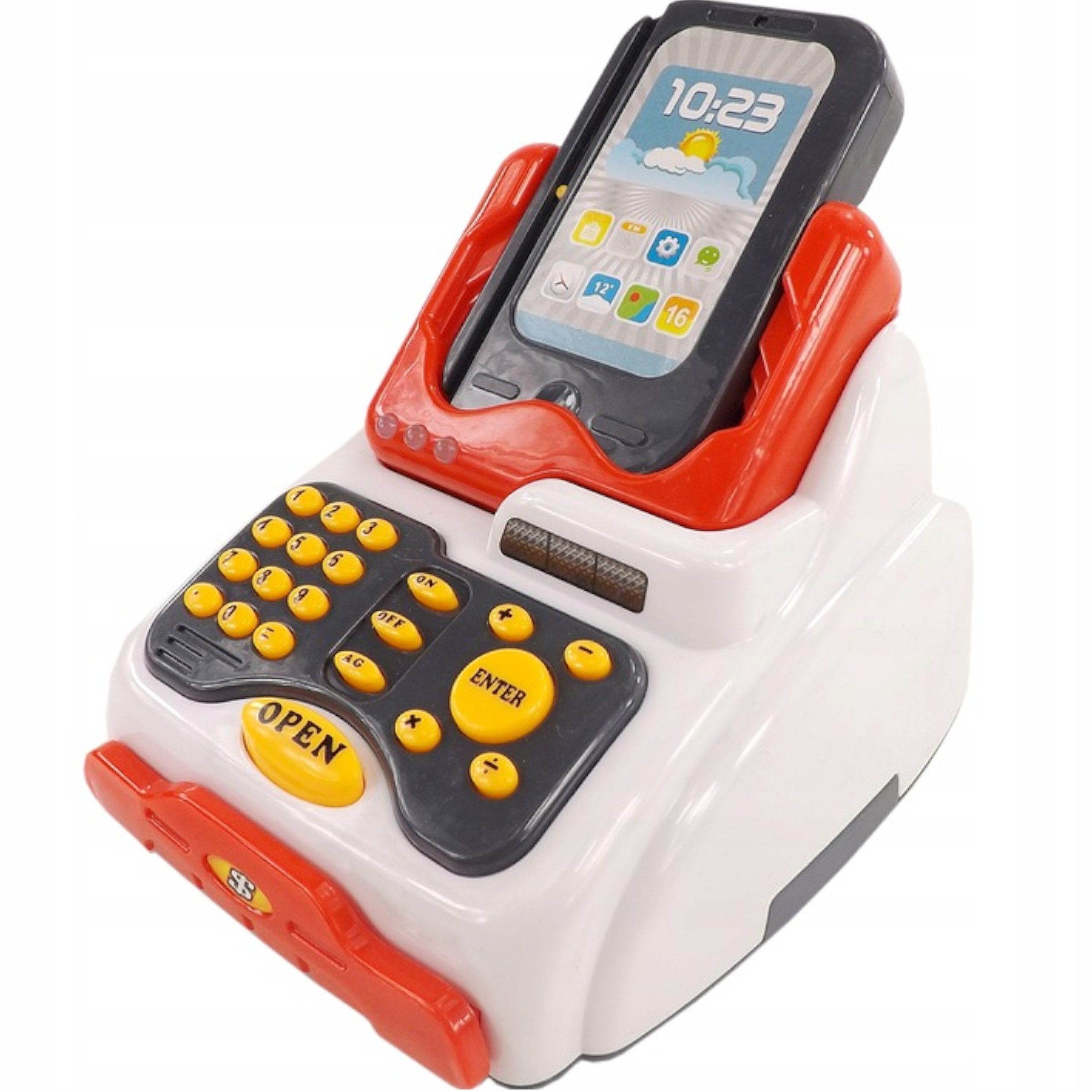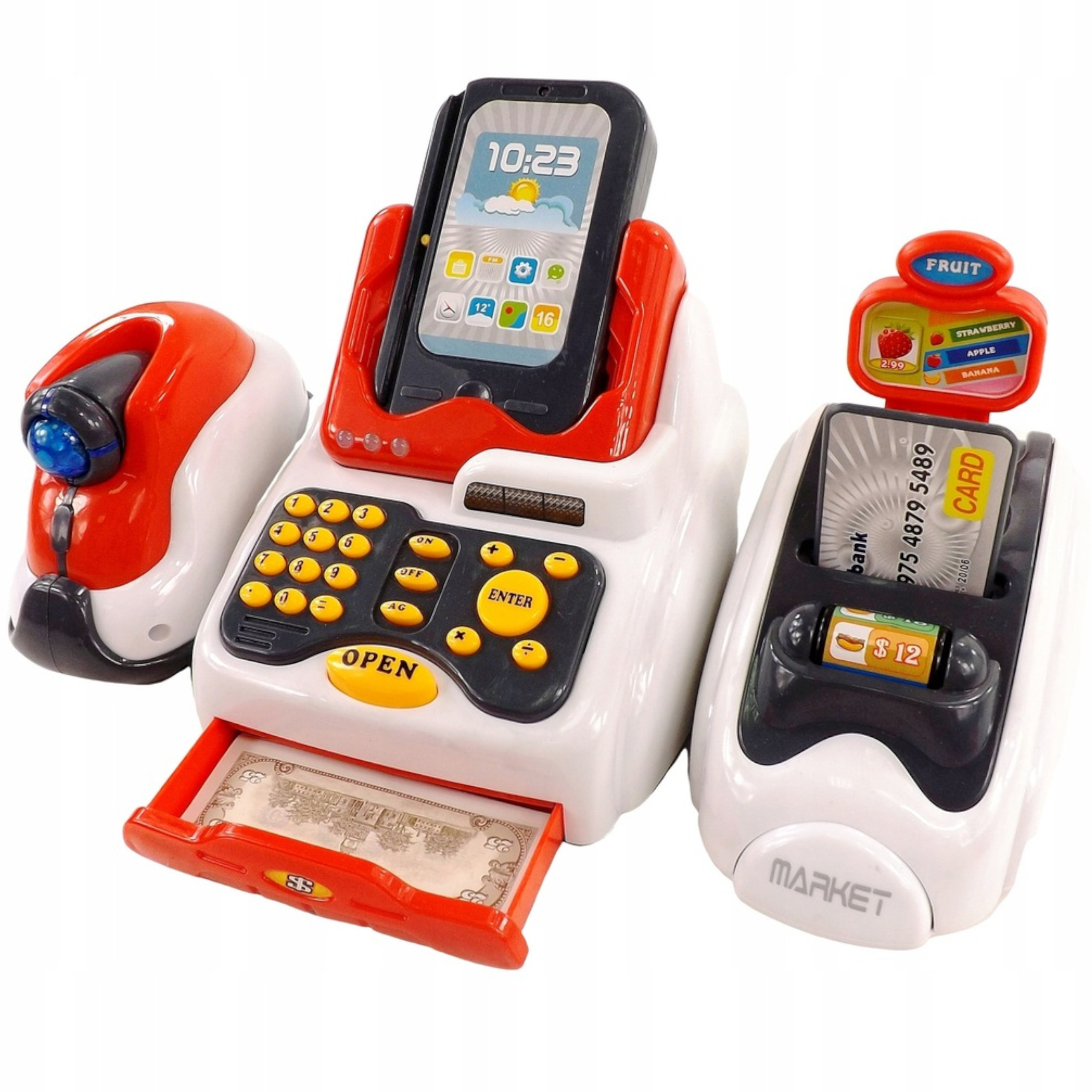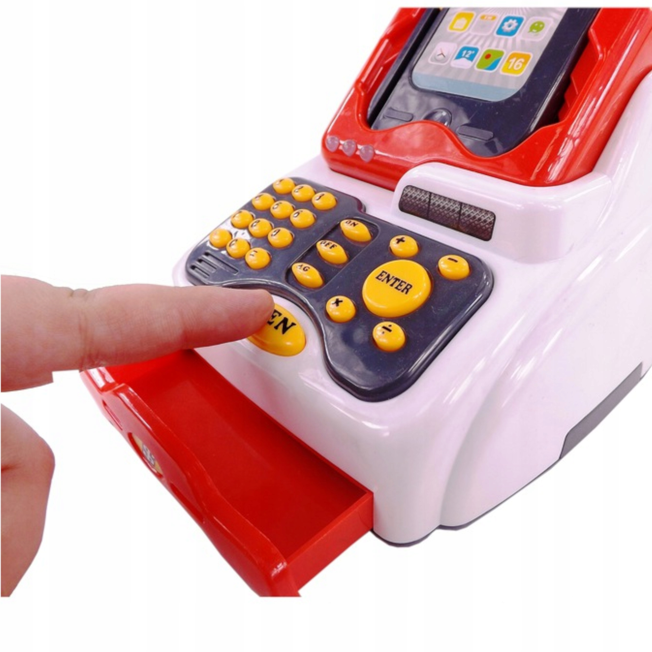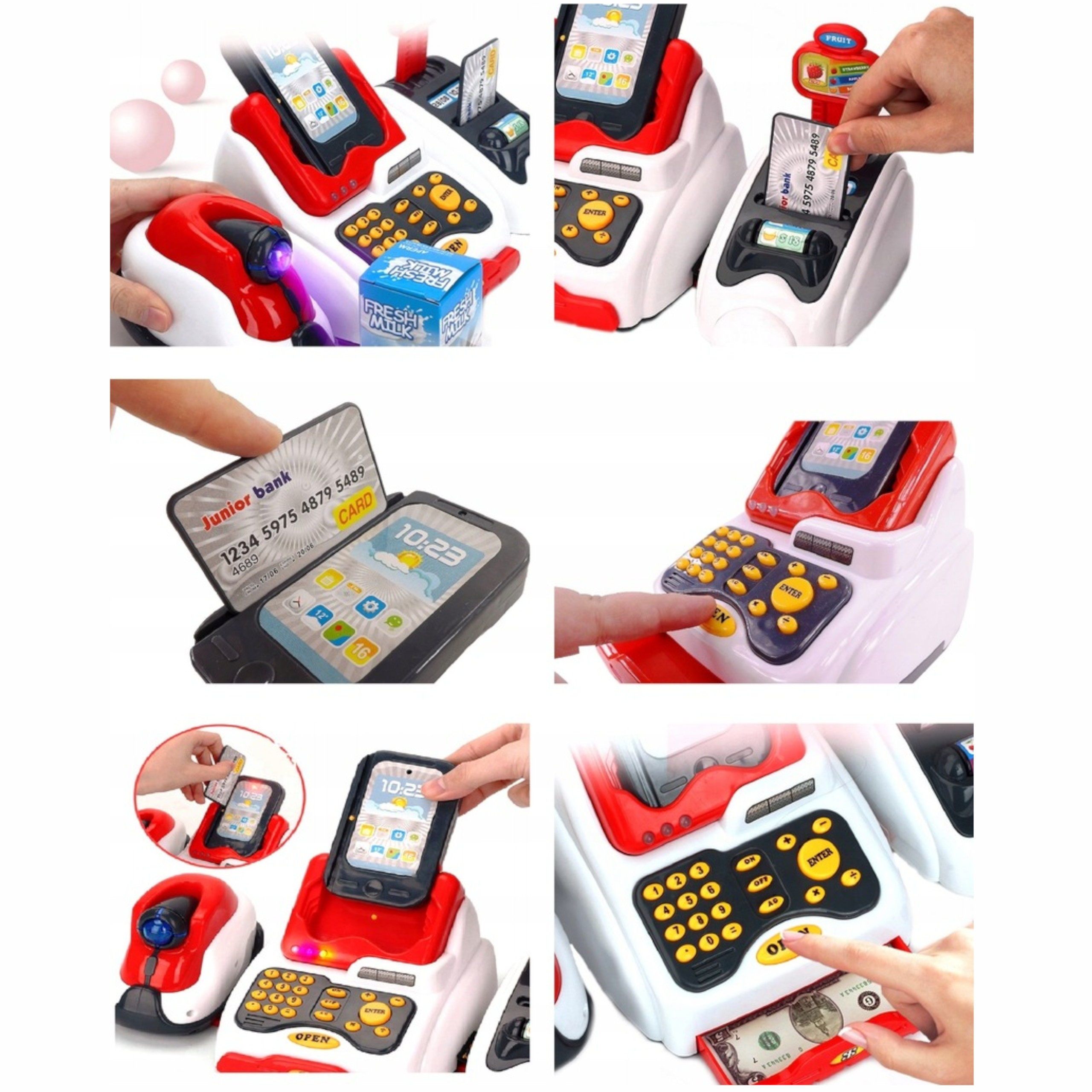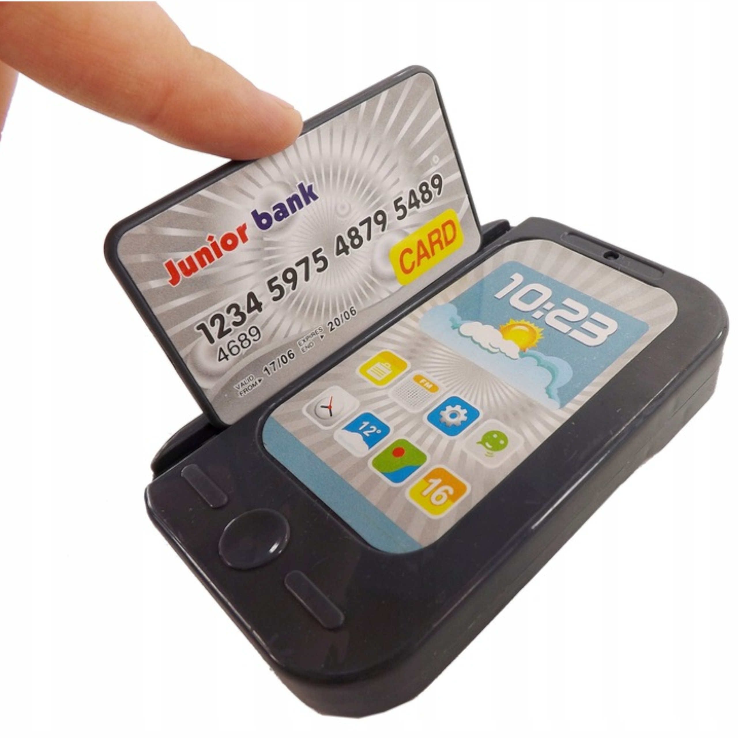 Dodatkowo w zestawie znajduje się przenośny terminal płatniczy imitujący telefon. Po przeciągnięciu przez niego karty wydaje dźwięk i świeci.
