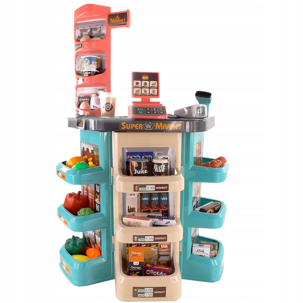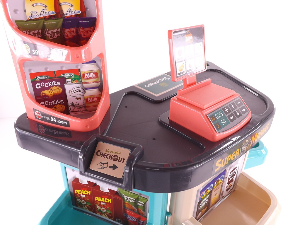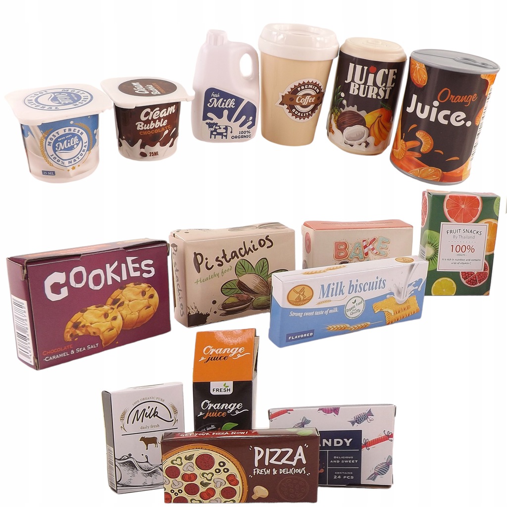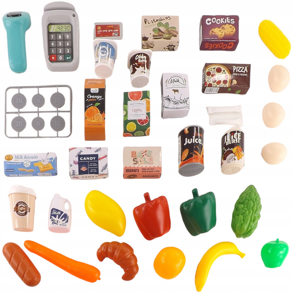 Duży wybór akcesoriów, dzięki którym sklep Twojego dziecka będzie dobrze zaopatrzony. W zestawie są zarówno plastikowe owoce, warzywa i pieczywo, ale także kartonowe pudełeczka imitujące produkty takie jak ciastka, mleko czy soki.