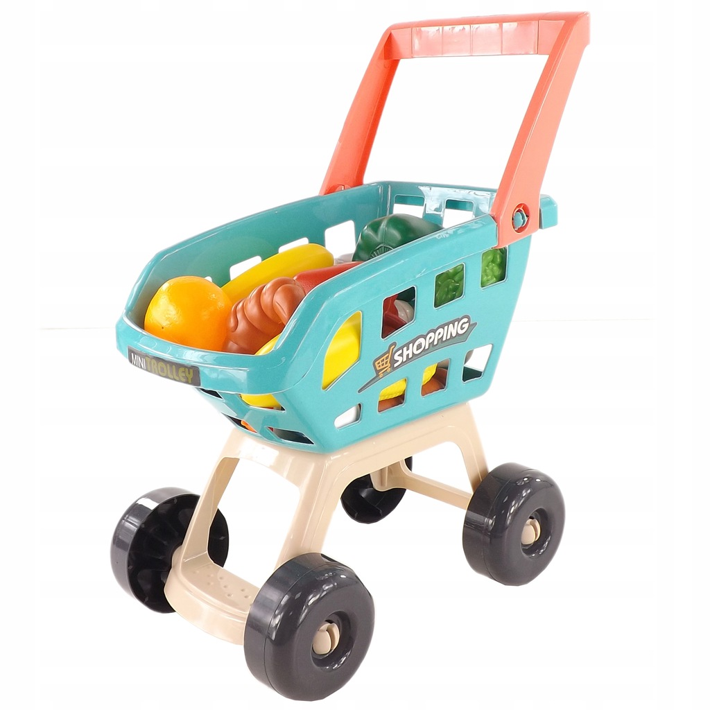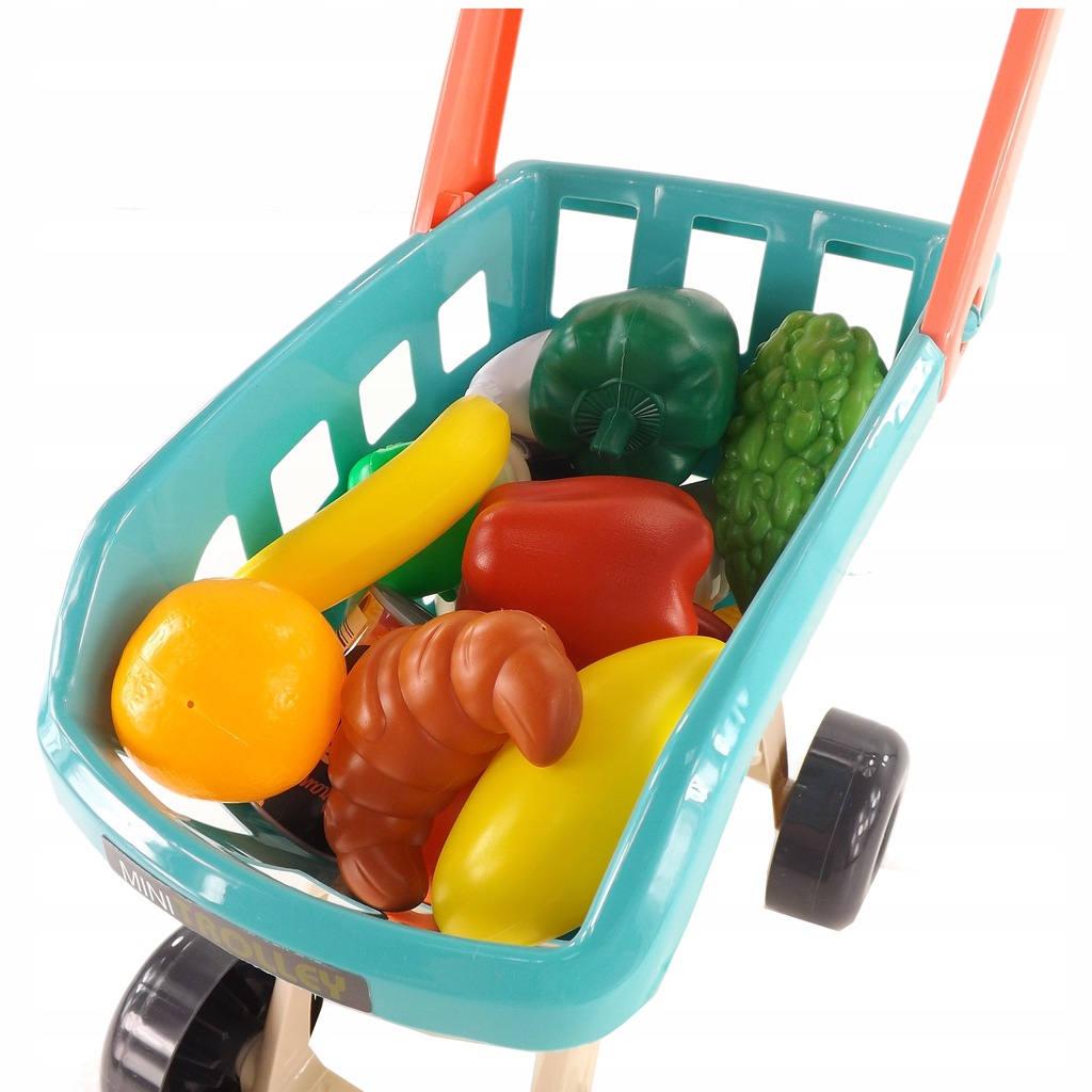 W zestawie znajduje się kolorowy wózek na zakupy. Kółka w koszyku się kręcą i pozwalają na jeżenie w przód i tył.