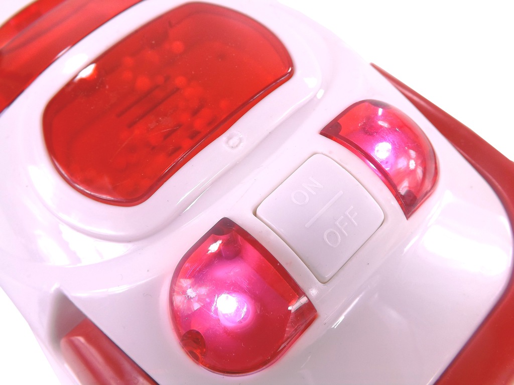 - Jednocześnie z dźwiękiem odkurzania, sztuczne śmieci znajdujące się w przezroczystej komorze na górze odkurzacza, mieszają się za pomocą wiatru, czemu towarzyszy światło.