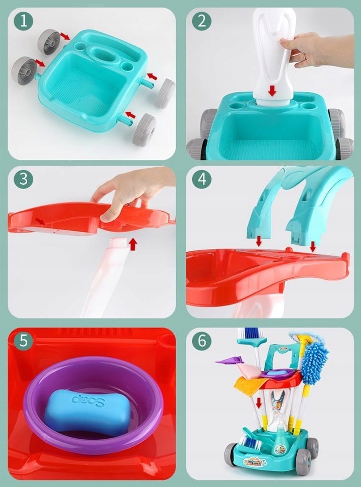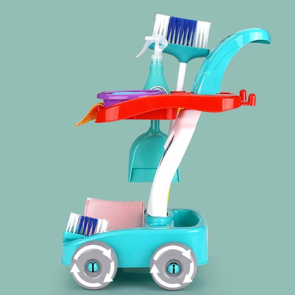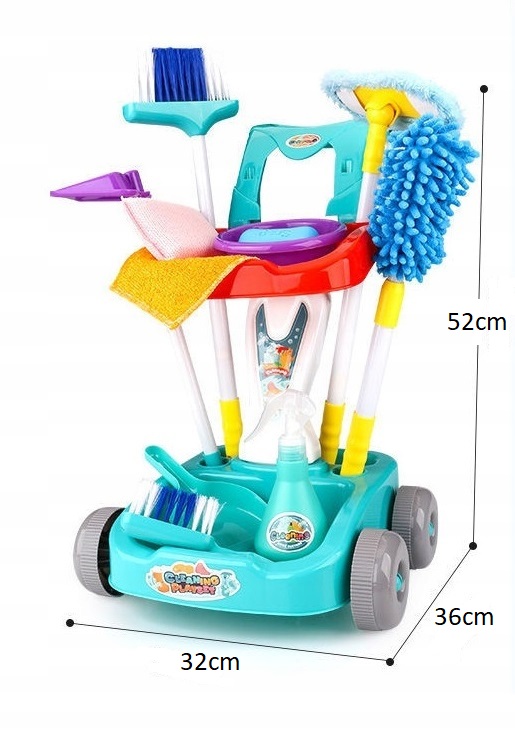 Zestaw do sprzątania na wózku dla dzieci teleskopowe kije, mop, miotła, miotełka do kurzu
