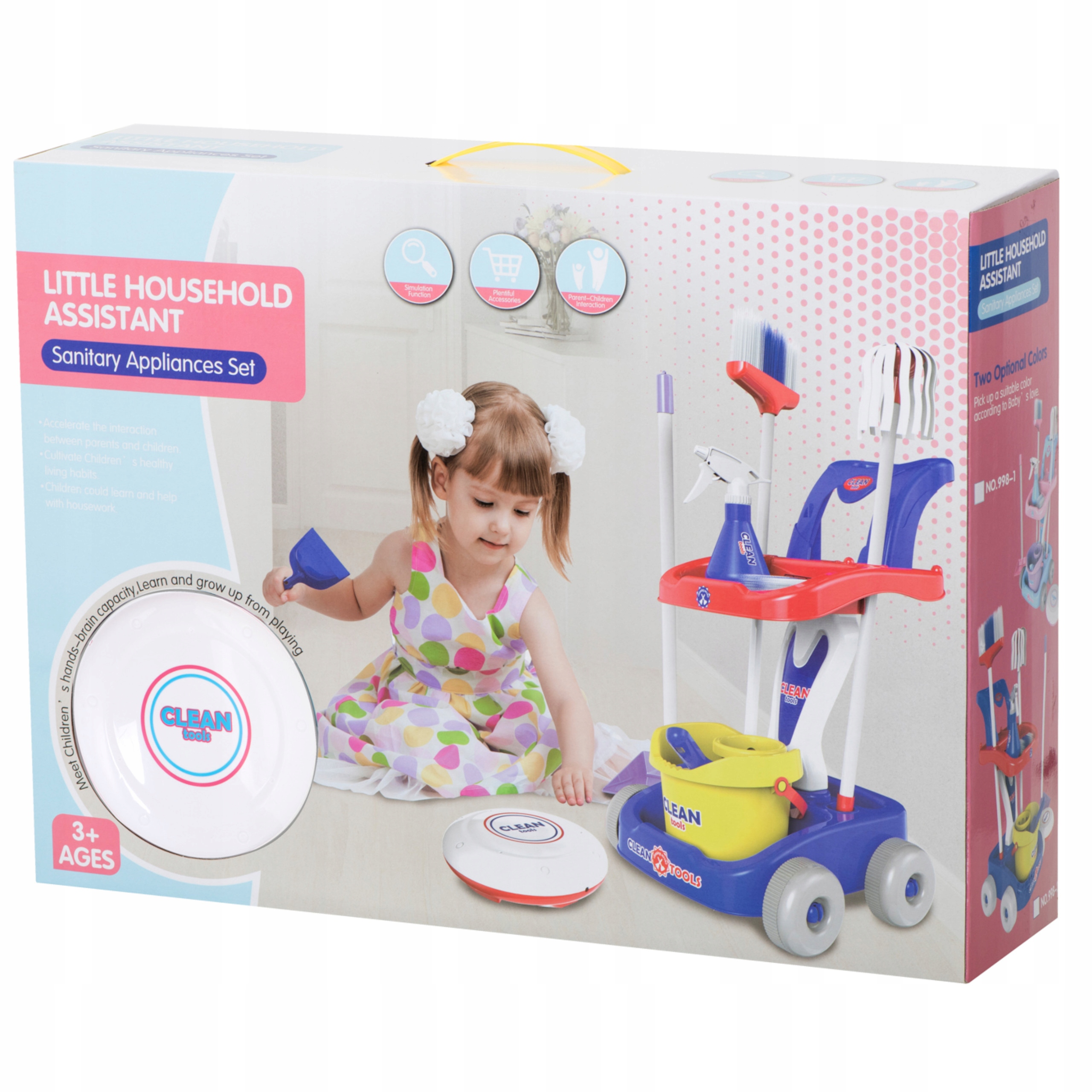 Zestaw do sprzątania posiada miotłę, którą mały gospodarz może zamieść podłogę. Dzięki szufelce z miotełką zgromadzone śmieci zostaną zebrane i wyrzucone do kosza. Następnie za pomocą mopa możemy umyć podłogę. Dodatkowo w zestawie jest robot odkurzający ze światłami i dźwiękami wyposażony jest w tajemniczy ruch, dzięki czemu rezultatem pracy będzie czysta i sucha podłoga.
