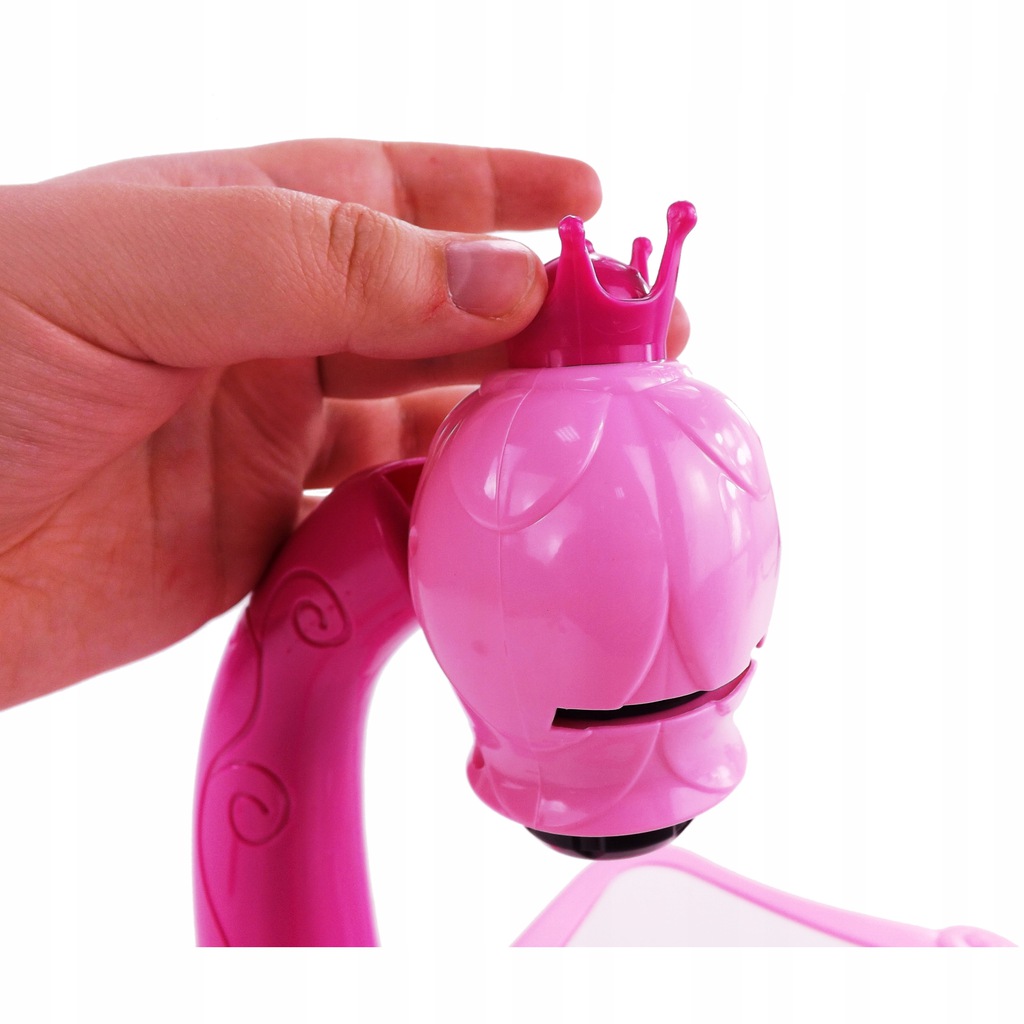 - Głowa z koroną posiada włącznik on/off oraz włącznik melodyjek. Po przesunięciu włącznika raz oświeca się światło, a po przesunięciu drugi raz uruchamiają się melodyjki. Dzięki temu można malować z muzyką, albo bez. Projektor gra 12 różnych melodyjek. Główka jest ruchoma (góra-dół), natomiast całe ramie można przesuwać w lewo i prawo.