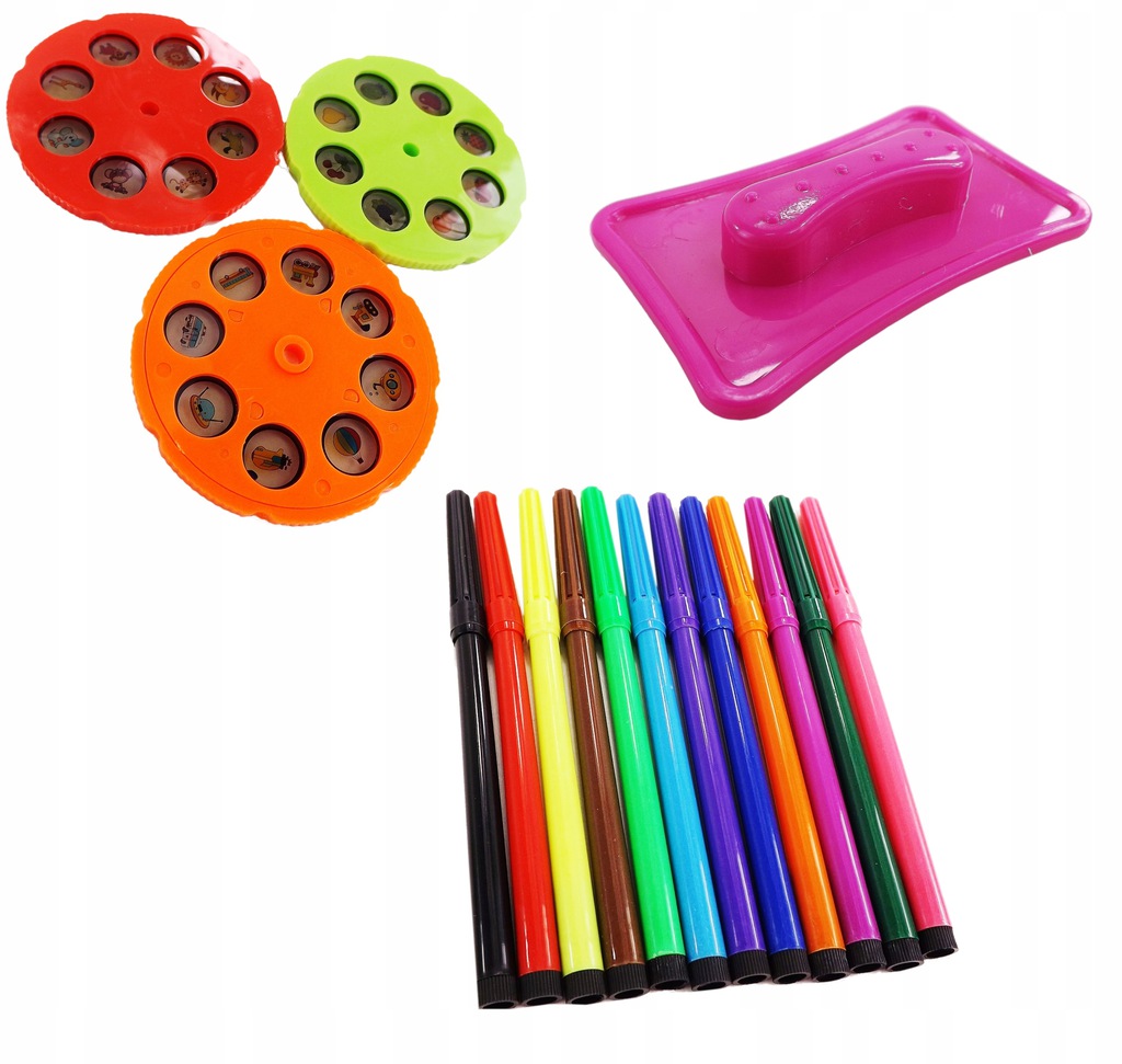 - 3 krążki ze slajdami. Każdy krążek posiada 8 obrazków, razem daje to aż 24 różne wzory!
