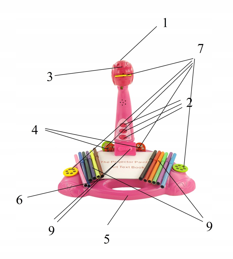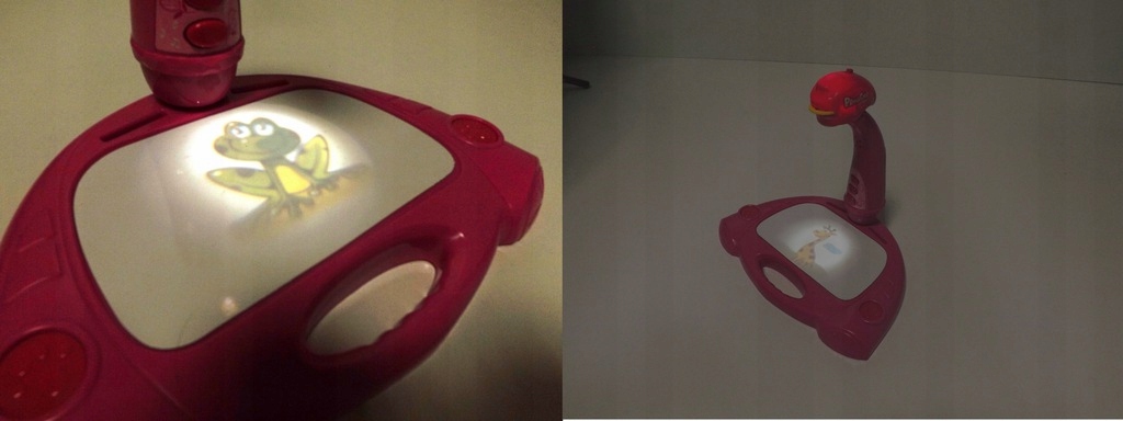 - Po włączeniu projektora zaświeca się światełko, po włożeniu krążka wyświetlają się slajdy. Slajdy można wyświetlać na podstawie projektora i odrysowywać w notesiku albo bezpośrednio na podstawie.