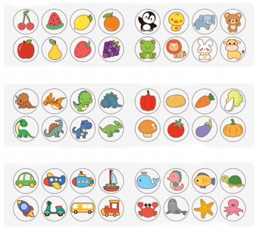 - Zwierzęta: lew, królik, krowa, pingwin, kaczka, słoń, miś, żaba