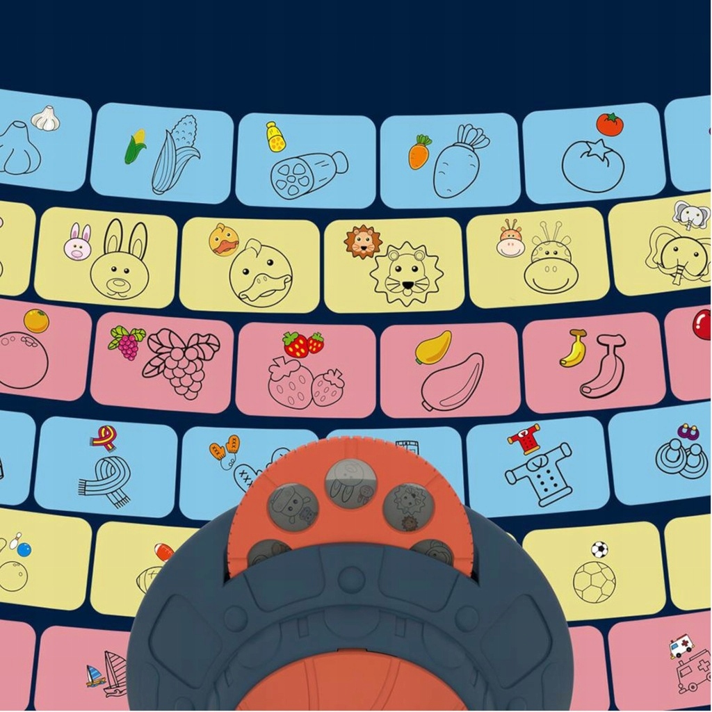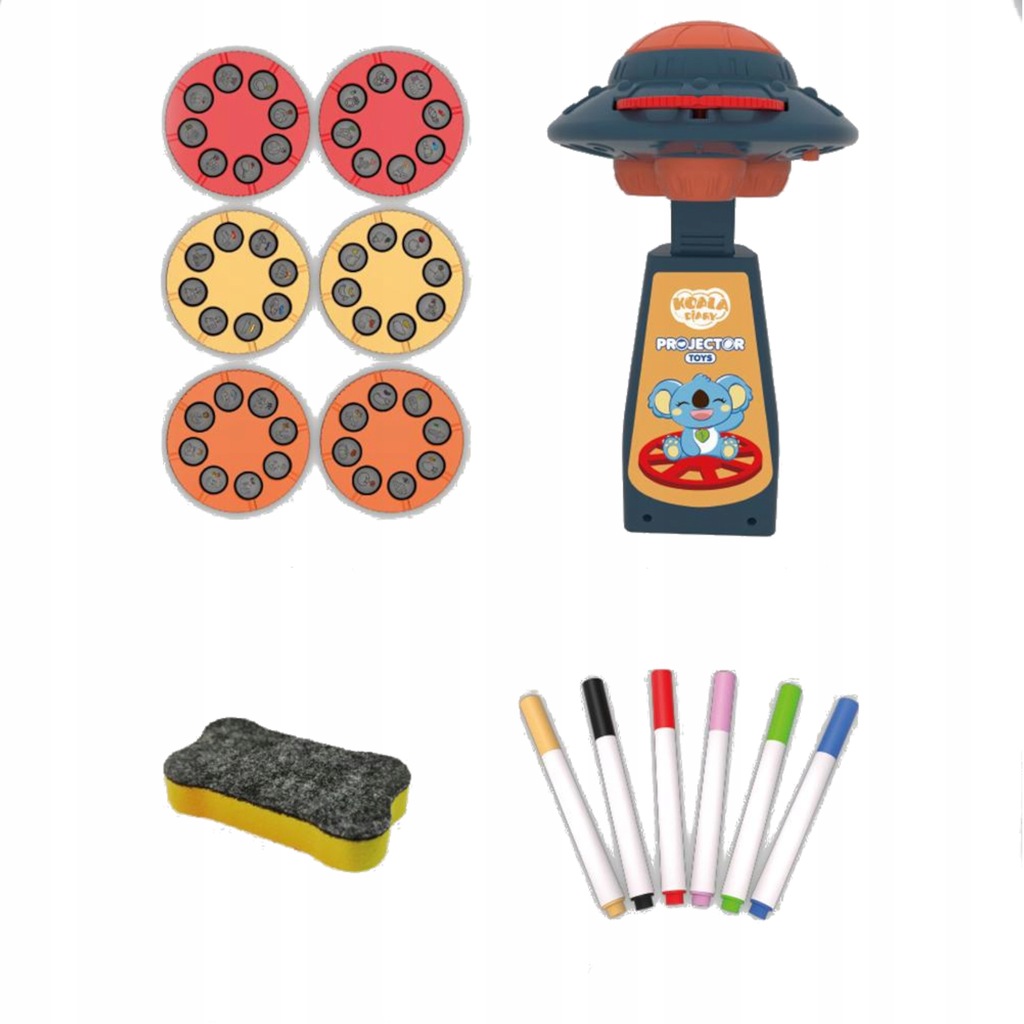 ✅ Projektor posiada 6 krążków z tematycznymi wzorami, dzięki którym dziecko uczy się kształtów kolorów i nazw warzyw, owoców, pojazdów, przedmioty sportowe, elementy stroju oraz twarze zwierzątek.
