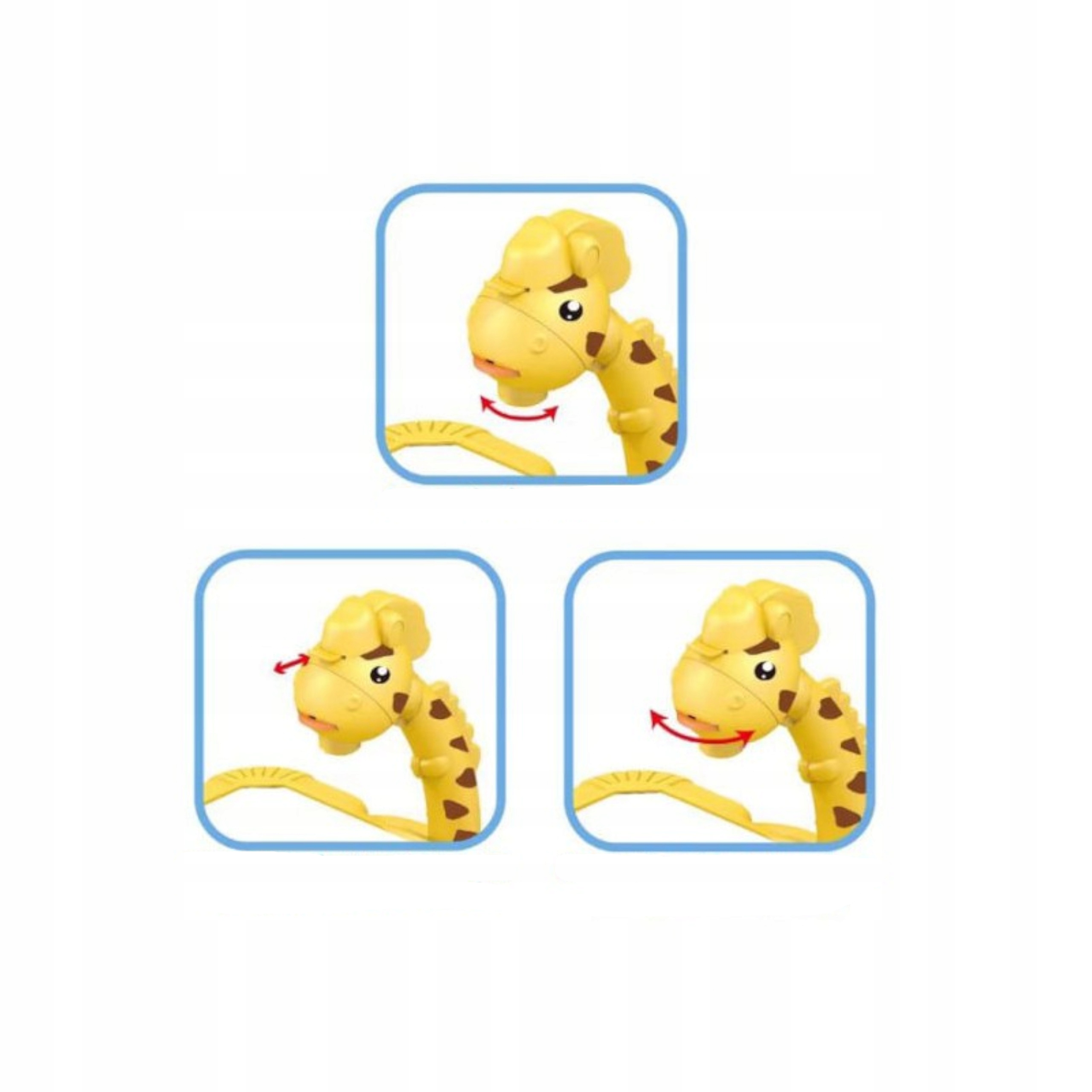 - Na czole żyrafy znajduje się włącznik. Część wystającą należy pociągnąć do przodu, aby włączyć projektor i umożliwić odrysowywanie krążków. Główka jest ruchoma (góra, dół i delikatnie prawo-lewo), natomiast całe ramie można przesuwać w lewo i prawo.