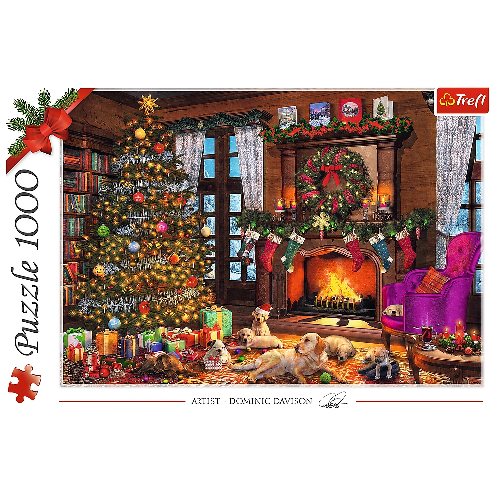 Puzzle 1000 elementów przedstawiające salon z motywem bożonarodzeniowym. Po ułożeniu powstanie obrazek o wymiarach 68,3 x 48 cm. Produkt został wykonany z wysokiej jakości materiałów, z zastosowaniem specjalnego kalandrowanego papieru odbijającego światło, co ułatwia układanie. Produkt został wyprodukowany w Polsce, a do produkcji zostały użyte materiały ekologiczne.