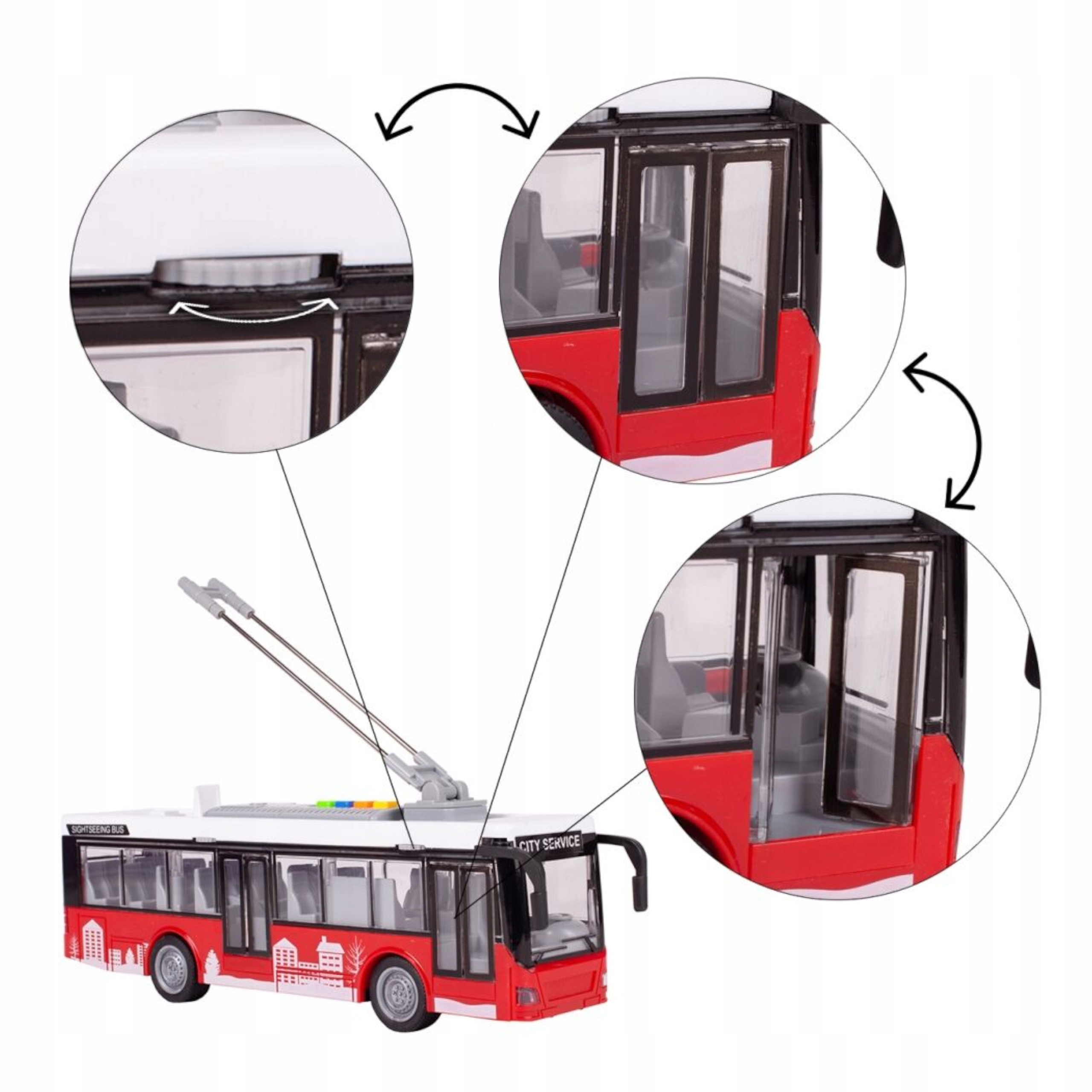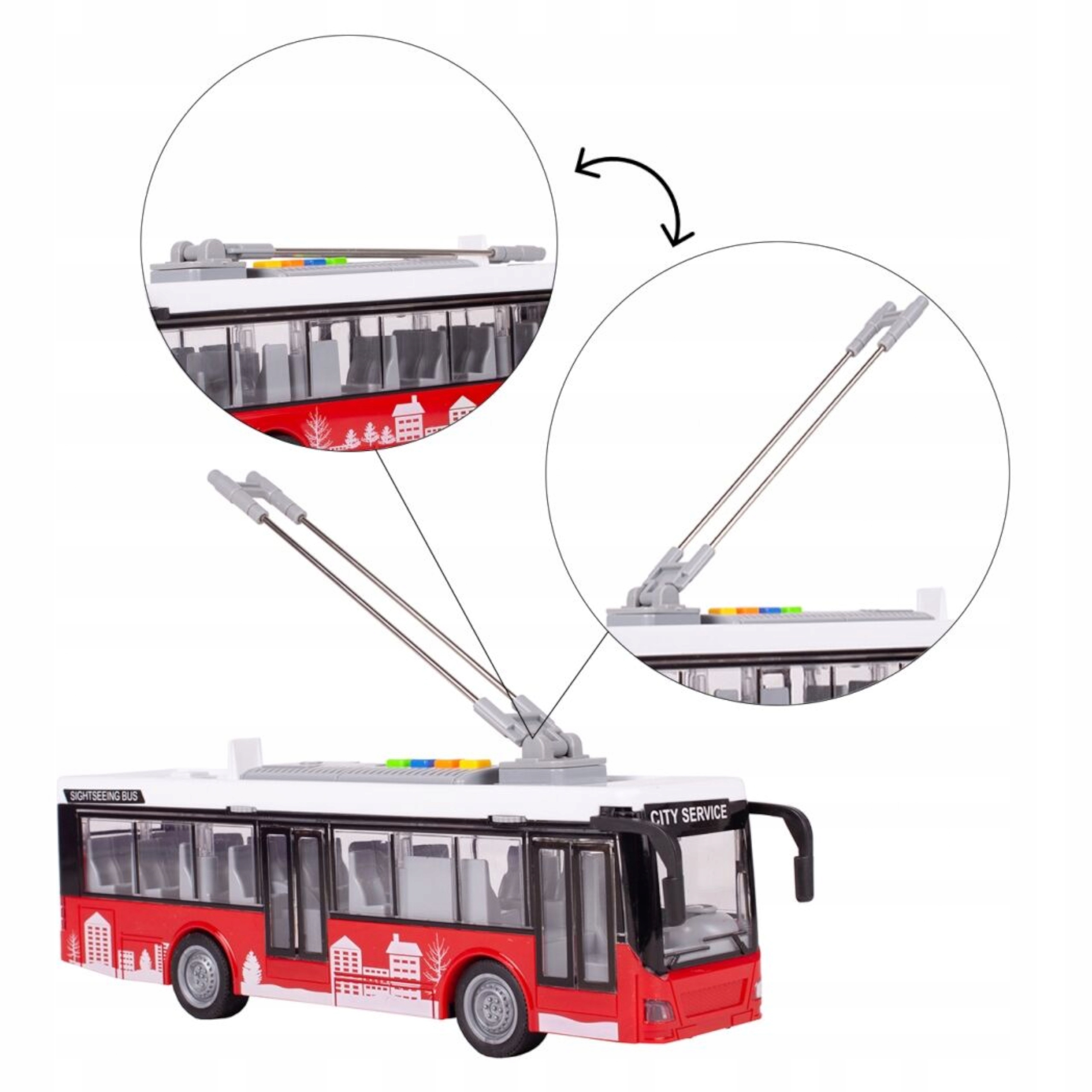 Świetny duży trolejbus CITY SERVICE, który jest odwzorowaniem prawdziwego miejskiego trolejbusu.