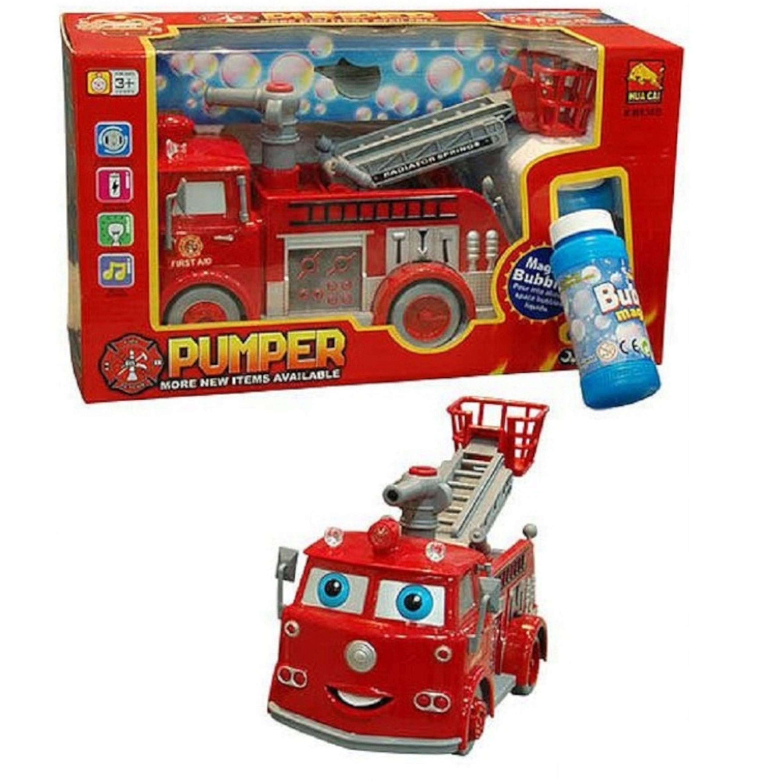 Zabawkowy pojazd został wykonany na wzór prawdziwego wozu strażackiego, ale dodatkowo posiada zabawną poruszającą się buzię. Samochodzik posiada włącznik on/off, po przełączeniu którego zabawka zaczyna jeździć. Gdy napotka przeszkodę na swojej drodze, sam zmienia kierunek jazdy. Podczas poruszania się wydobywa się dźwięk syreny i migają wesoło niebeskie, czerwone i zielone światełka. Na dachu znajduje się armatka wodna, z której po uzupełnieniu płynem wydobywają się bańki. Oczy samochodziku poruszają się w prawo i w lewo, a język wsuwa się i wysuwa. Dodatkową atrakcją jest ruchoma wyciągana drabina zakończona koszem strażackim.